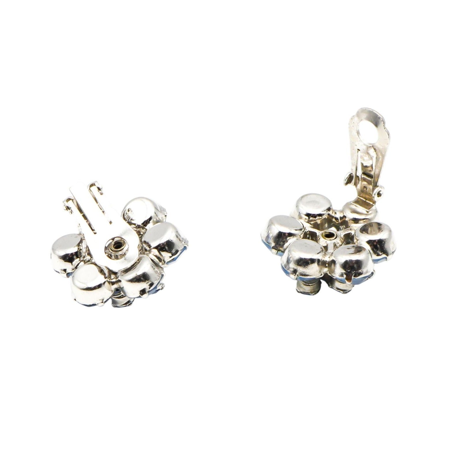This elegant vintage demi-parure set features dazzling ice blue round-cut rhinestones in a timeless silvertone rhodium-plated setting. The 15-inch necklace boasts three graduated rows of sparkling stones, adding depth and dimension. The matching floral clip-on earrings measure 1 inch in diameter and rise ½ inch high, creating a graceful 3D floral effect.
