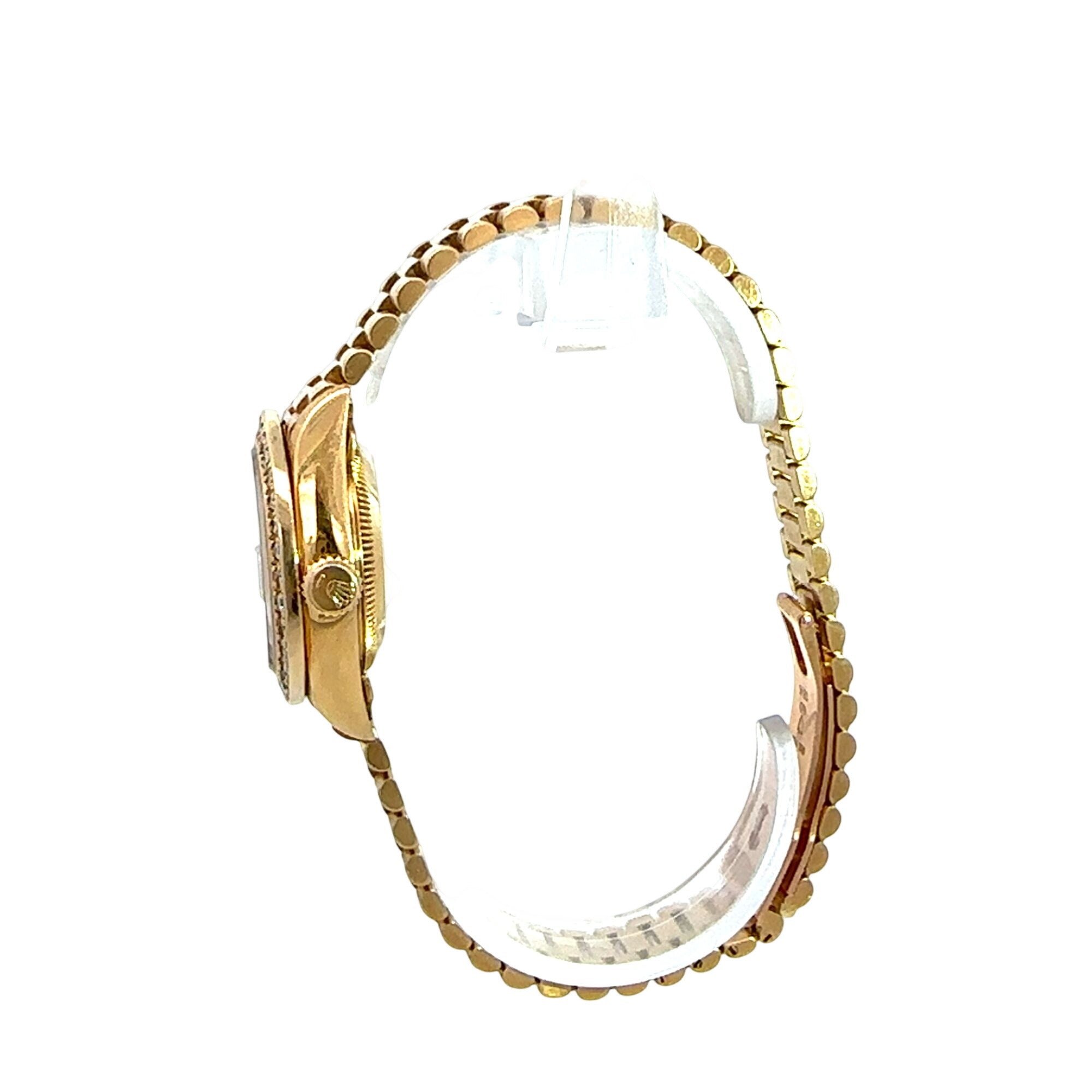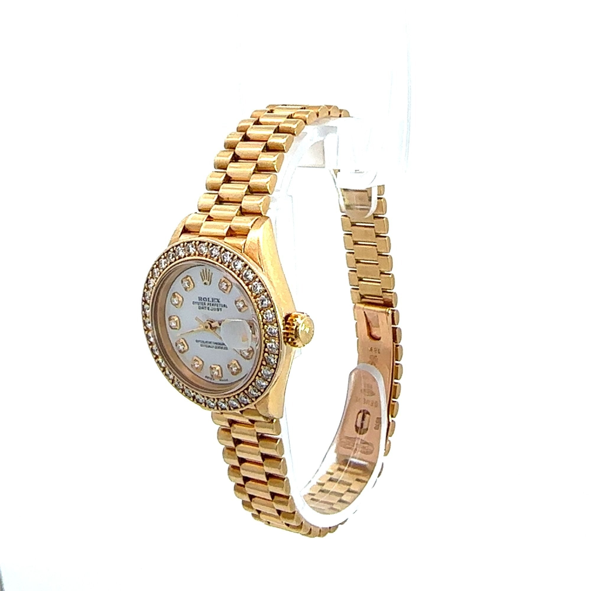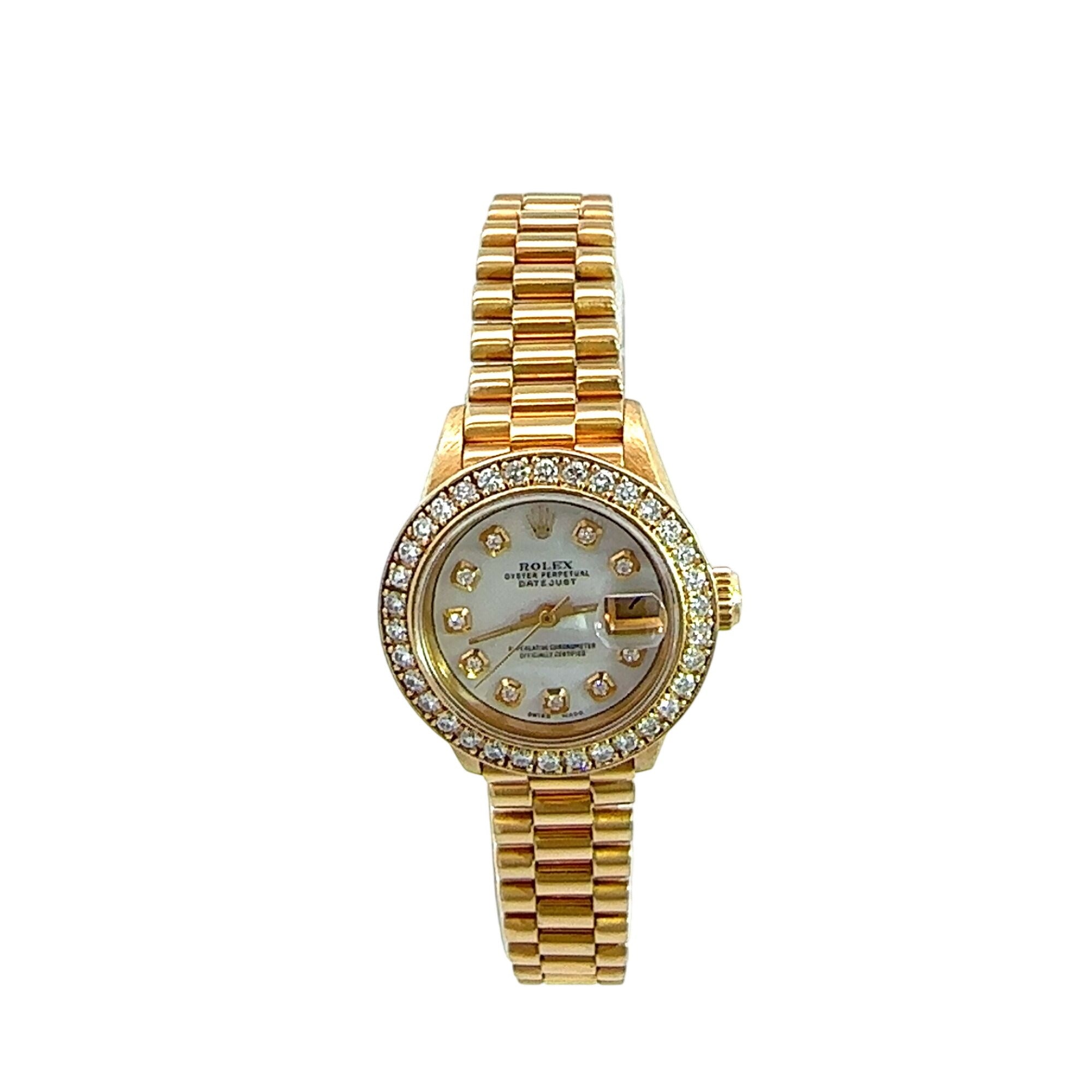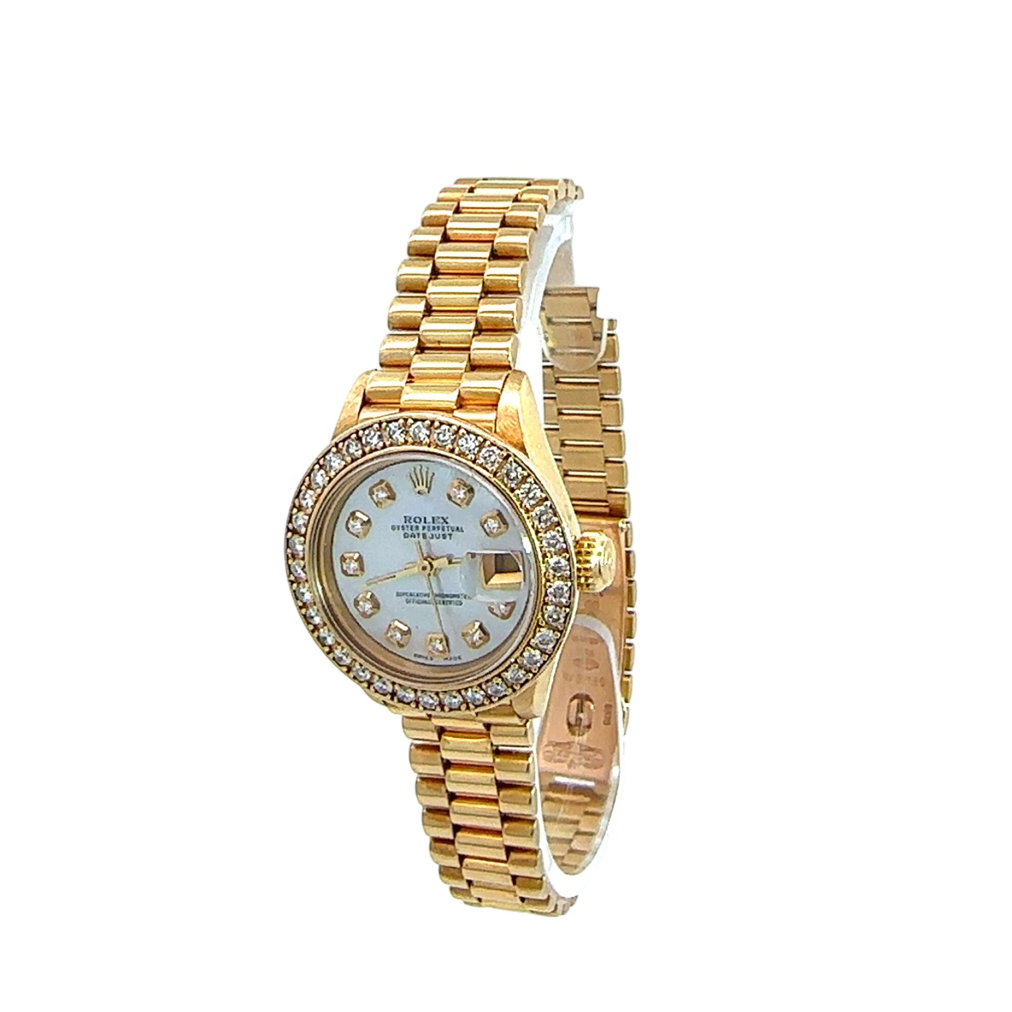 Rolex Ladies 18K Yellow Gold President Datejust Watch With Diamond Bezel & Mother Of Pearl Dial
