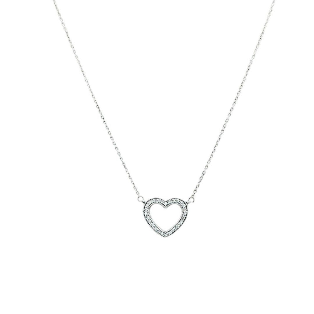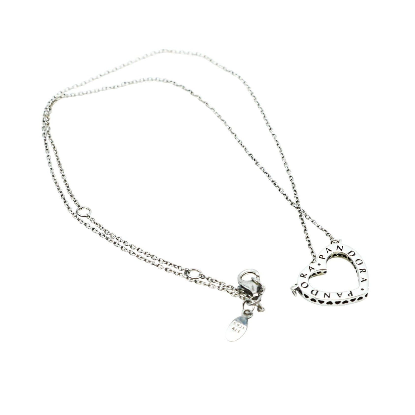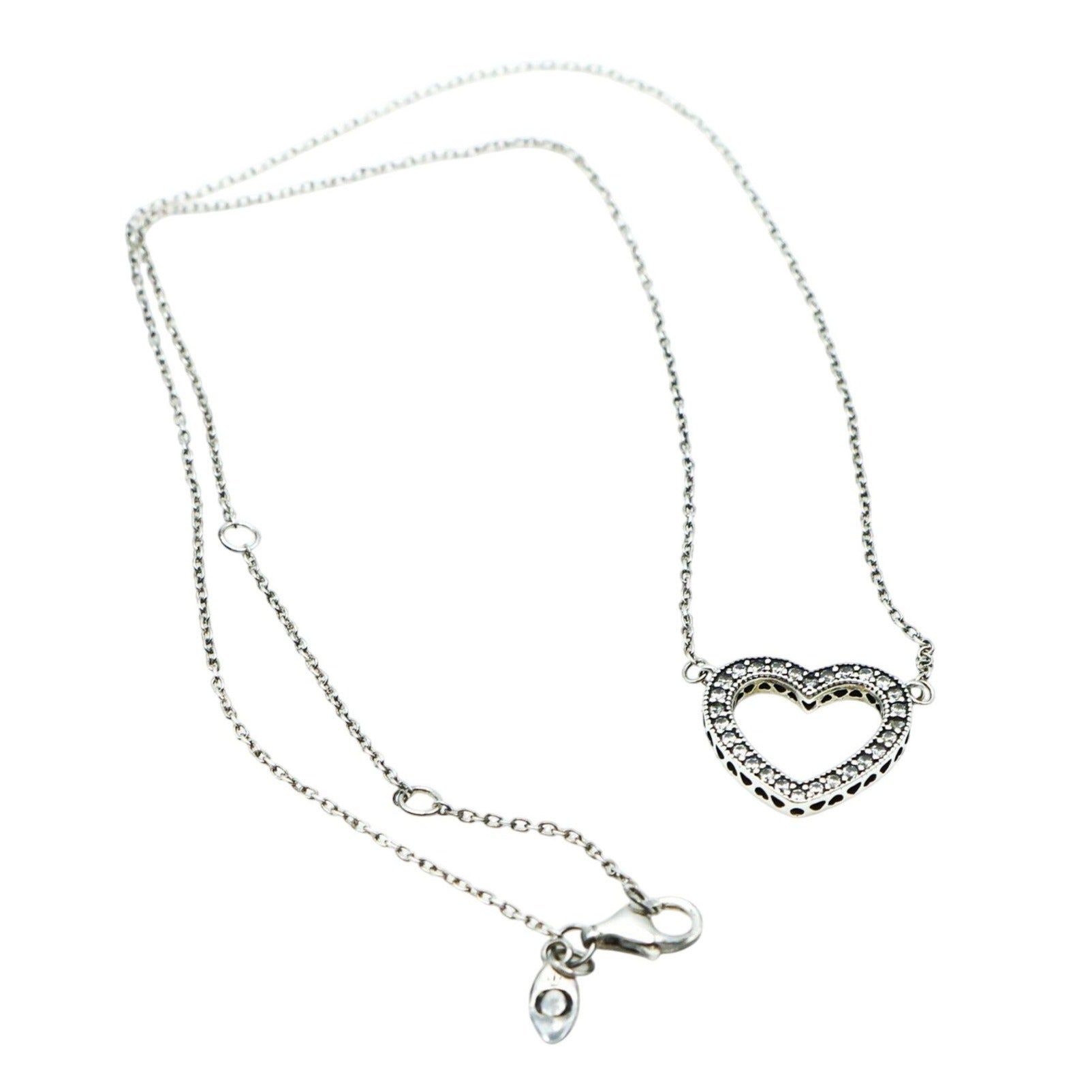 Authentic Pandora Loving Hearts of Pandora Sterling Silver 17.7-Inch Necklace With Clear Zirconia - 590534CZ-45. This beautiful necklace features a Cubic Zirconia adorned heart in the middle.