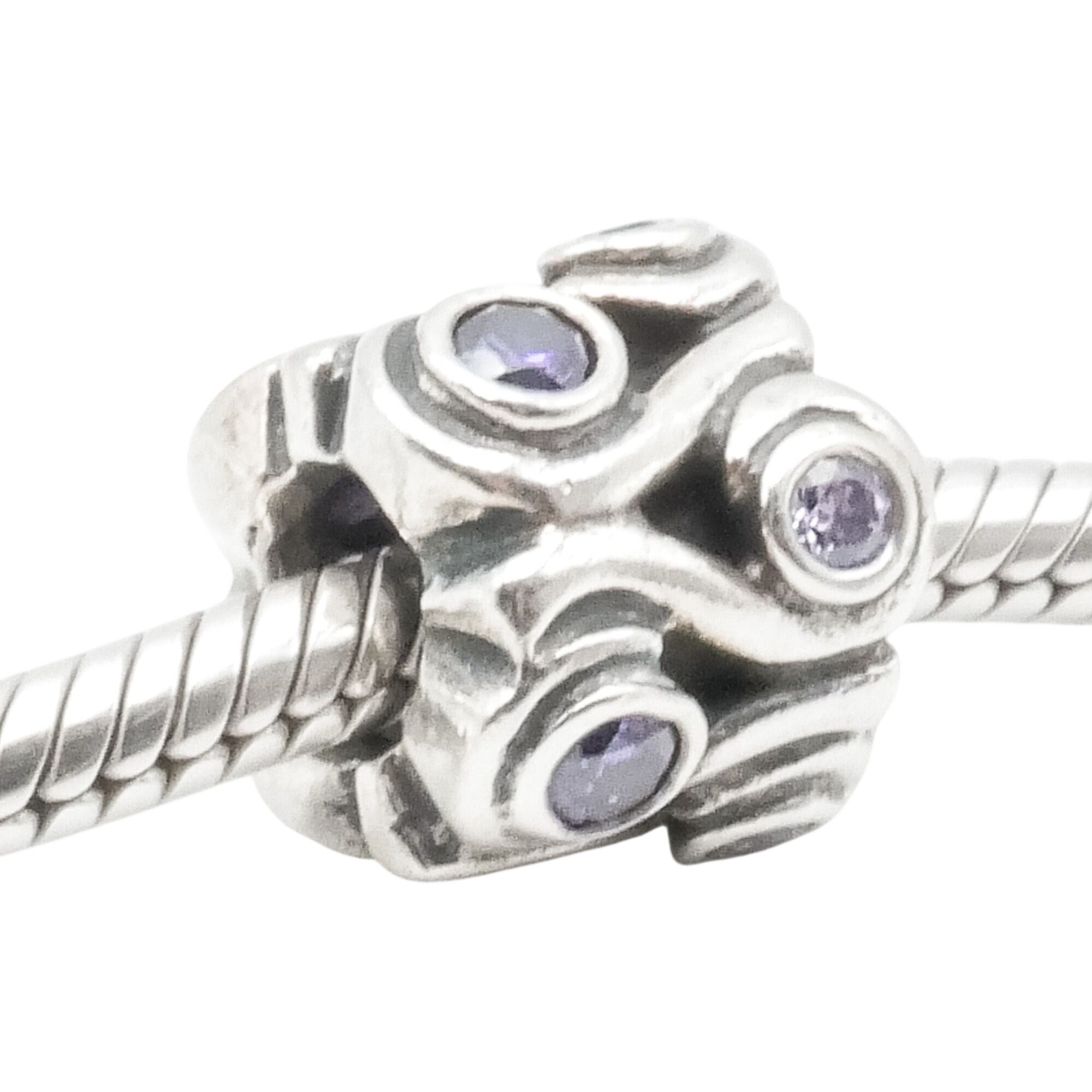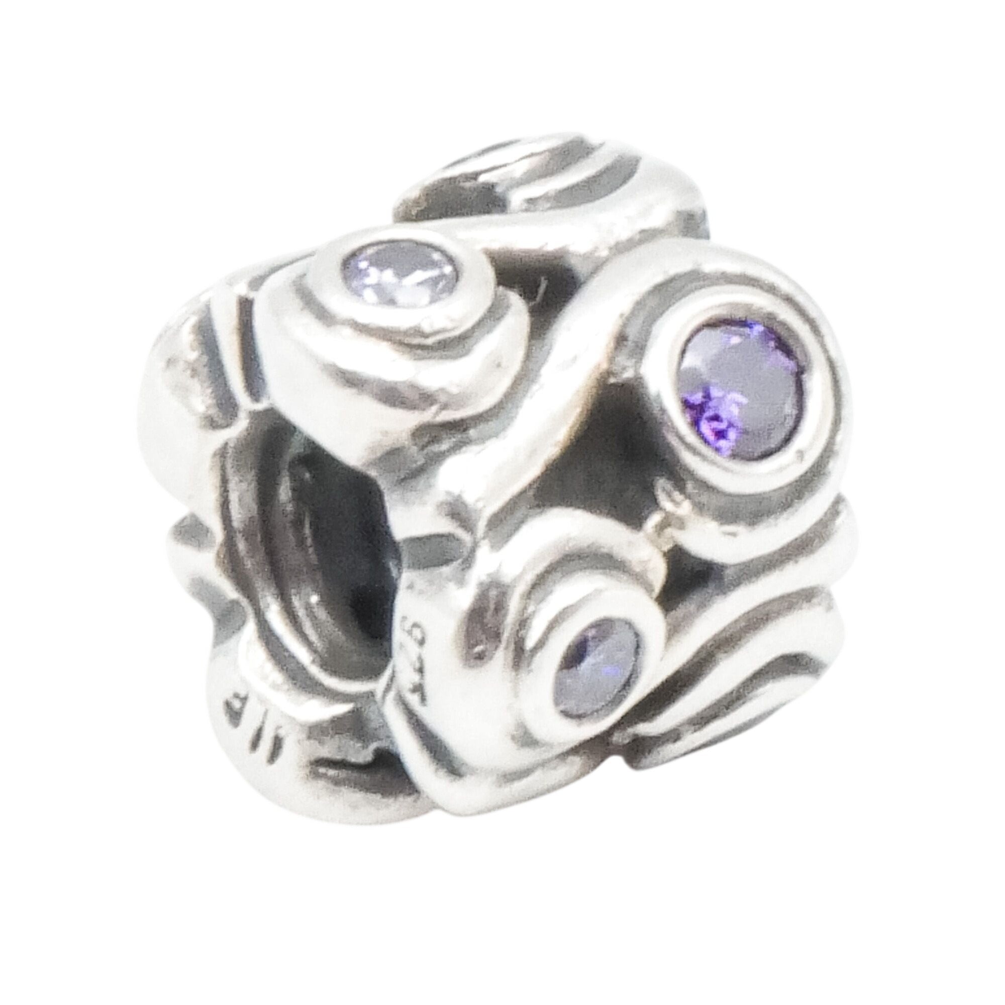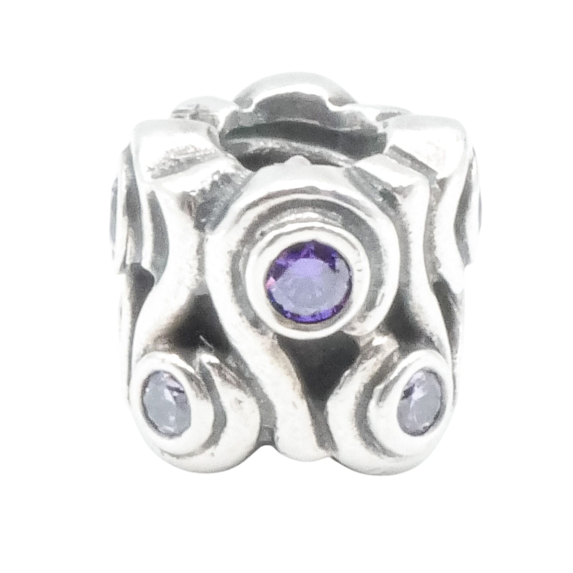 Capture the calming beauty of the sea with this retired Pandora Ocean Wave charm, crafted in luminous sterling silver and accented with sparkling amethyst-colored zirconia stones. The sculptural flowing wave design symbolizes strength, renewal, and emotional depth, making it a meaningful addition to any Pandora bracelet or ocean-themed charm collection.