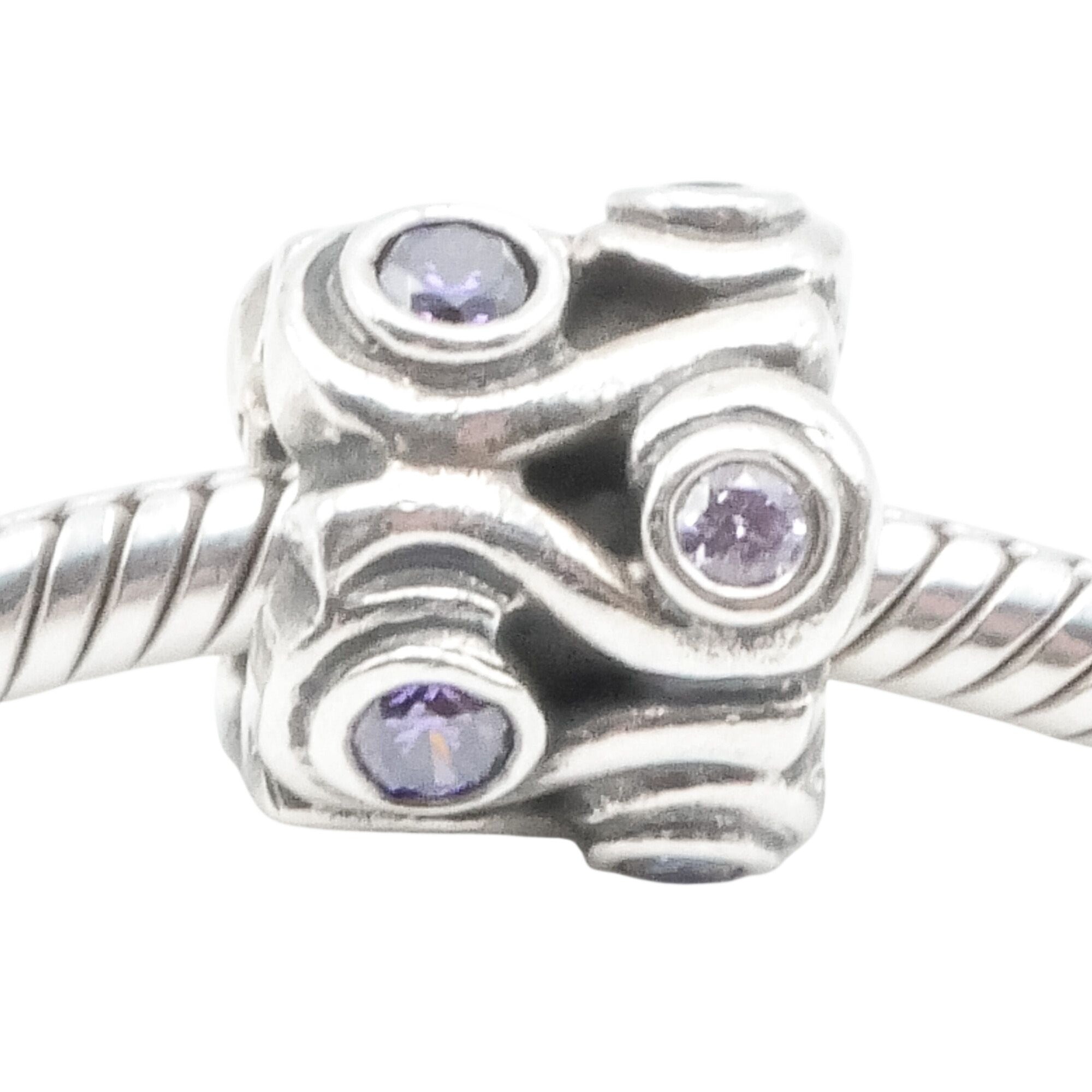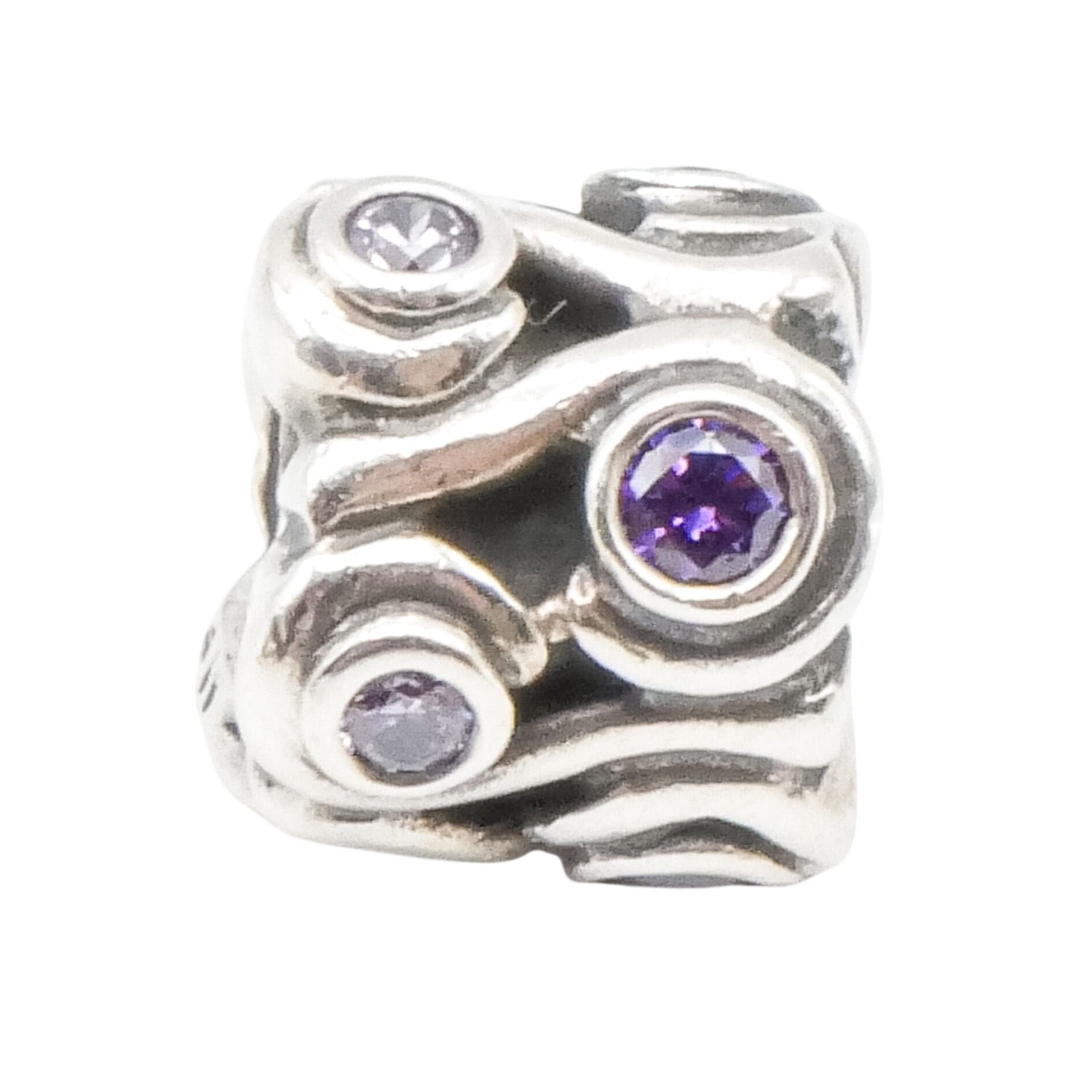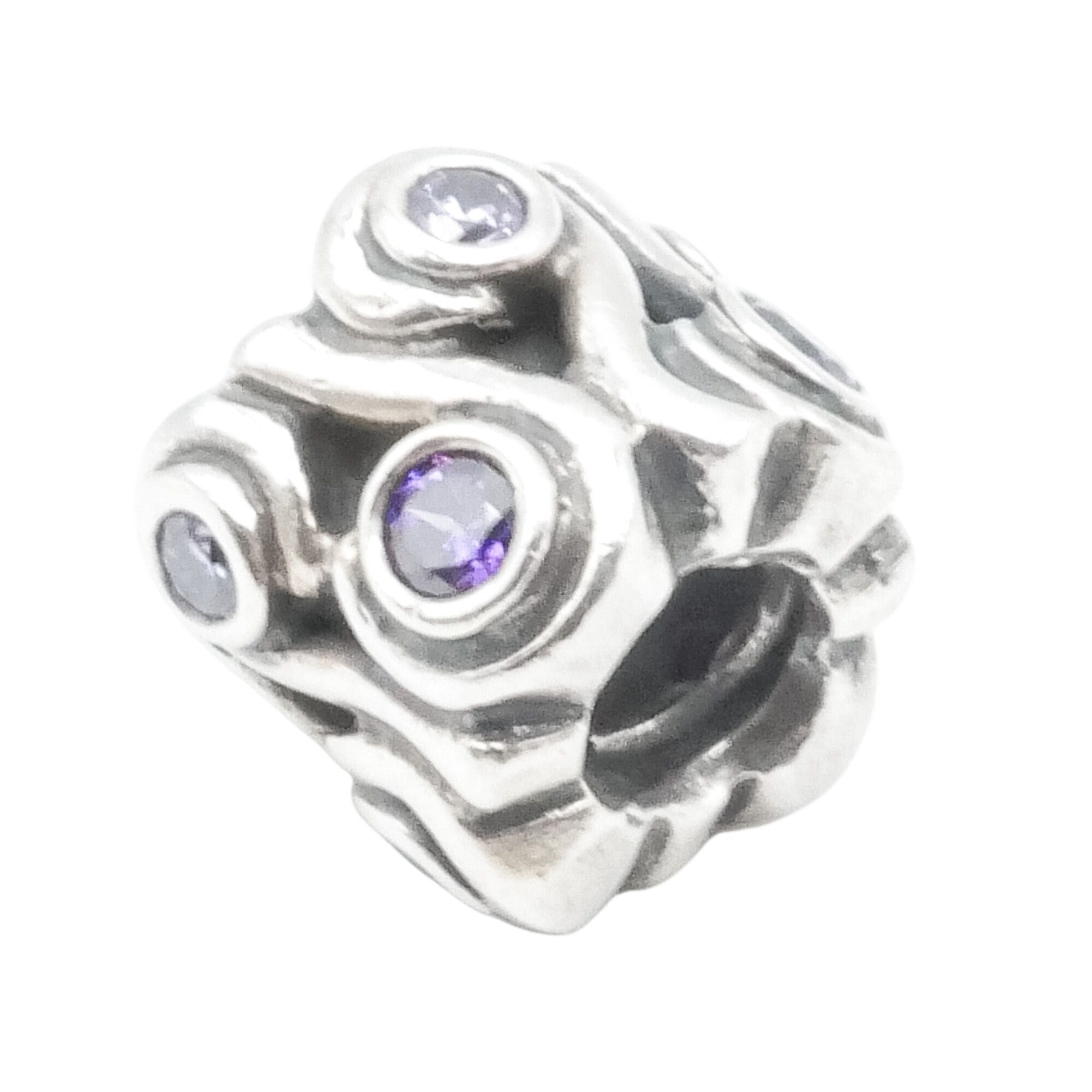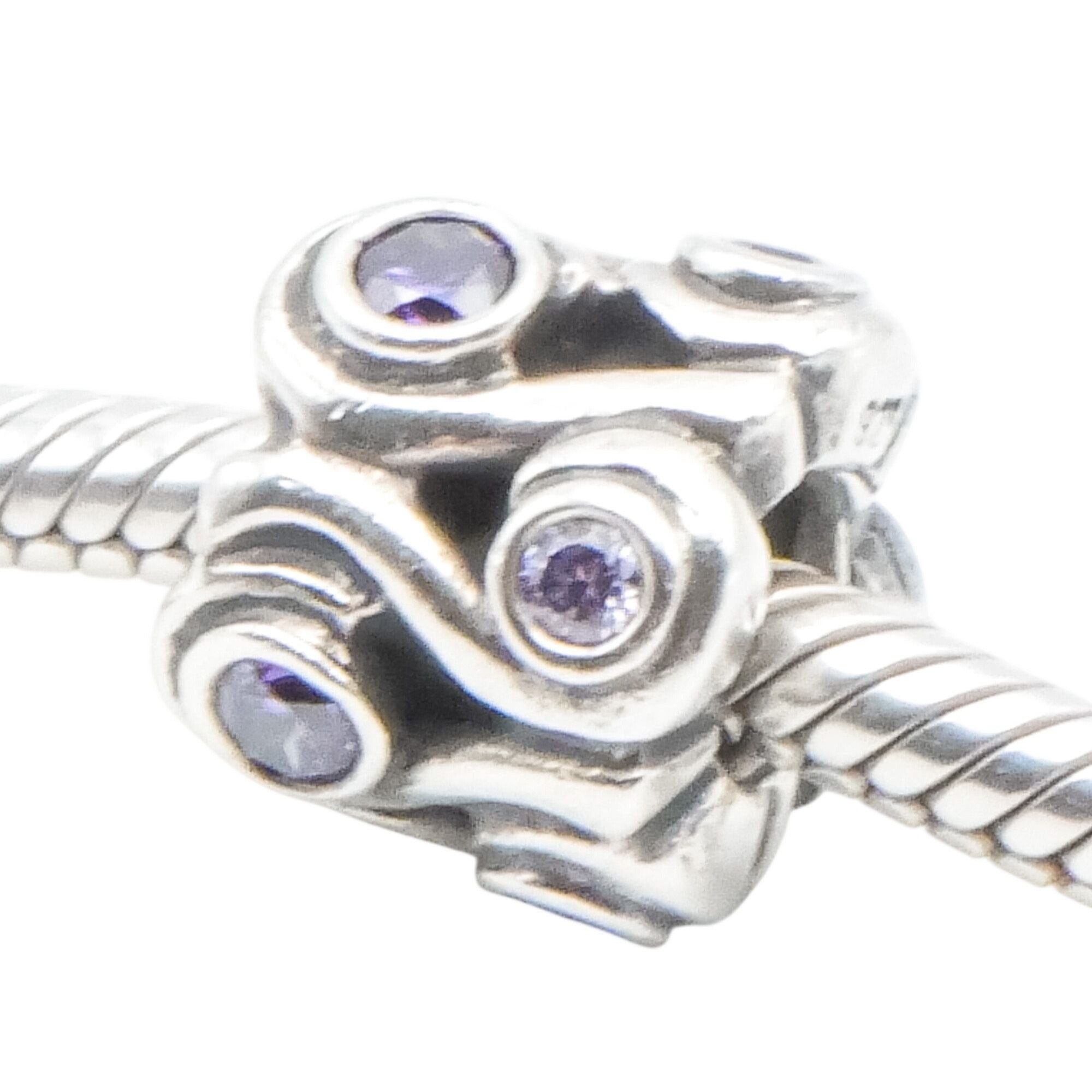 Capture the calming beauty of the sea with this retired Pandora Ocean Wave charm, crafted in luminous sterling silver and accented with sparkling amethyst-colored zirconia stones. The sculptural flowing wave design symbolizes strength, renewal, and emotional depth, making it a meaningful addition to any Pandora bracelet or ocean-themed charm collection.
