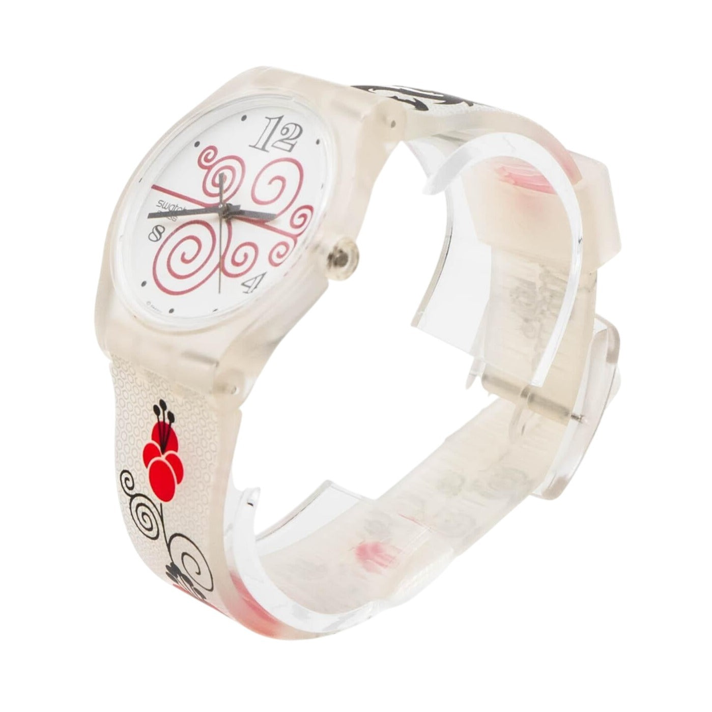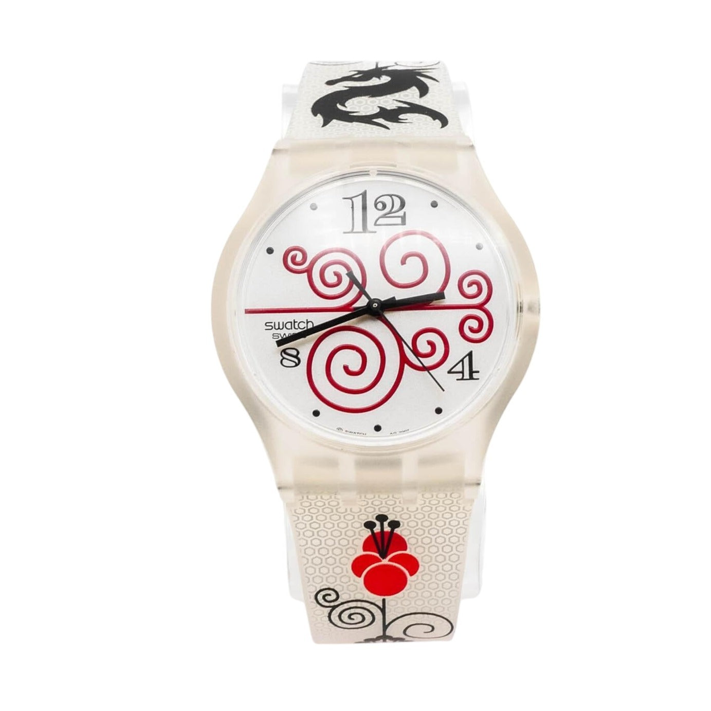 Celebrate the spirit of the 2008 Beijing Summer Olympics with this authentic Swatch Jelly in Jelly Good Destiny watch. Designed as a special edition, this unisex timepiece features the signature Swatch “Jelly in Jelly” design, meaning no metal touches the skin, making it lightweight and comfortable for all-day wear.