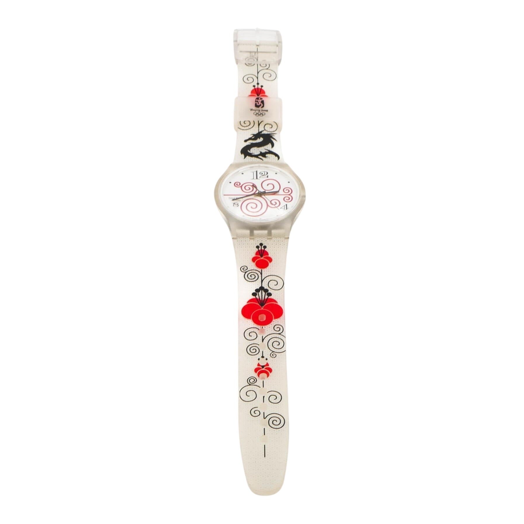 The clear rubber strap is adorned with bold red and black Chinese symbols, while the clear loop bears the official Olympic stamp. The 38mm transparent plastic case houses a crisp white dial, accented by black hour markers, dots, and a vibrant red swirl at the center. Black hands complete the sporty, collectible look.