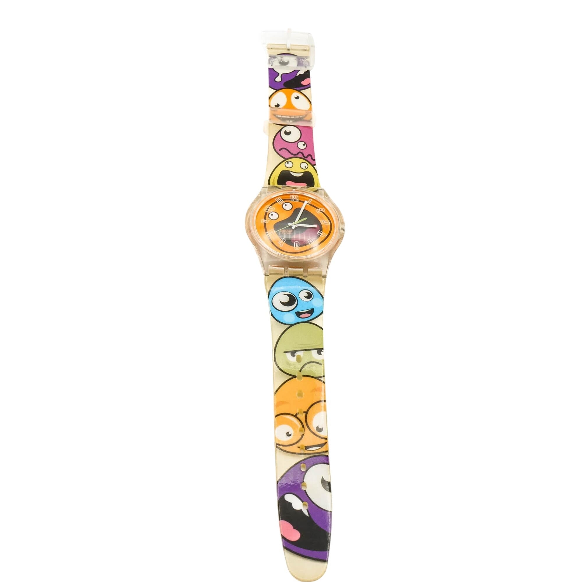 • Strap: Clear plastic strap decorated with colorful cartoon blobs expressing a range of moods