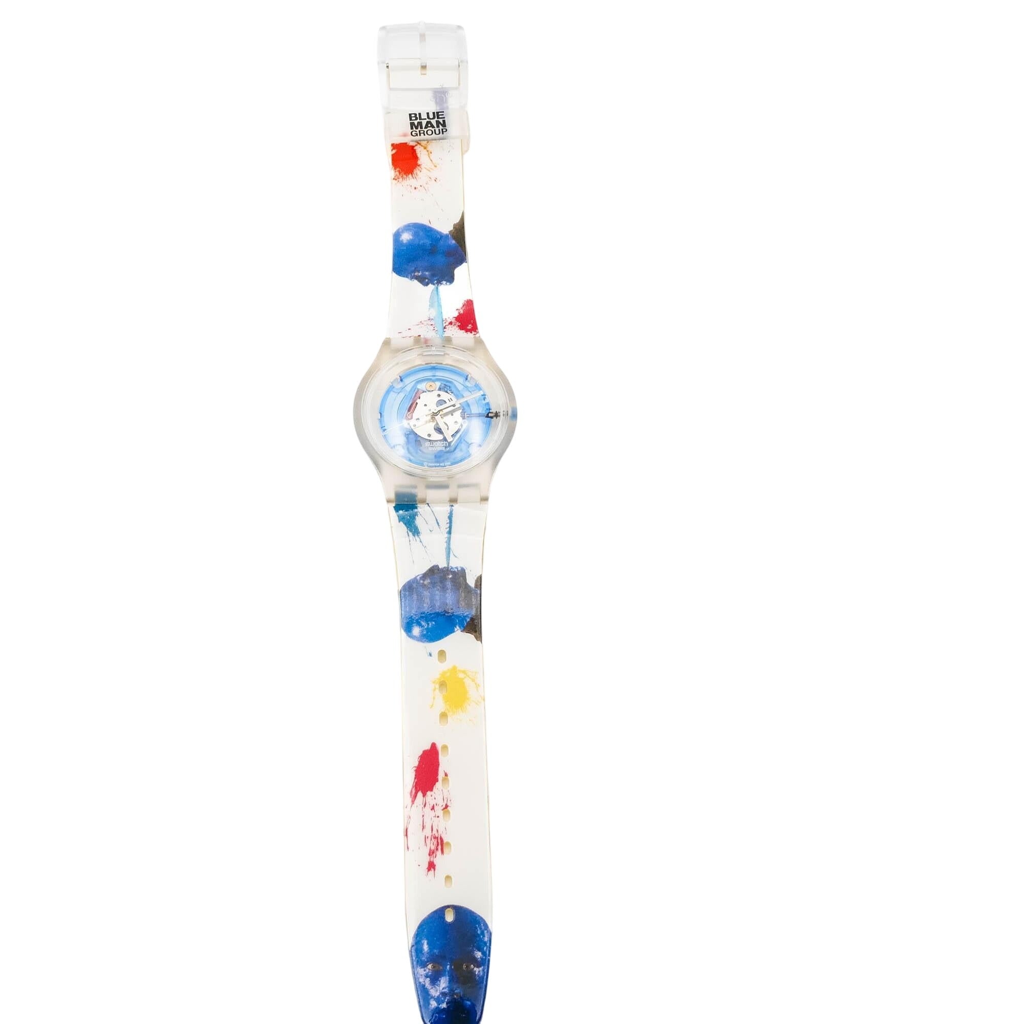 This collectible and creative Swatch timepiece is a tribute to performance art and bold design. The Swatch Jelly in Jelly Swatch Blue (SUJK104C) is a rare and highly sought-after watch, co-designed by the famous Blue Man Group in 2004.