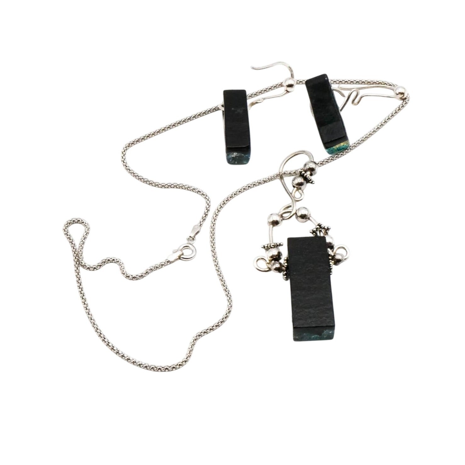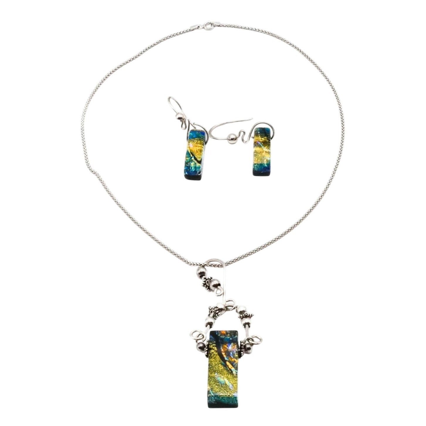 This striking set features handmade dichroic art glass in shimmering hues of iridescent green, blue, and orange, each piece uniquely fused and framed in sterling silver.