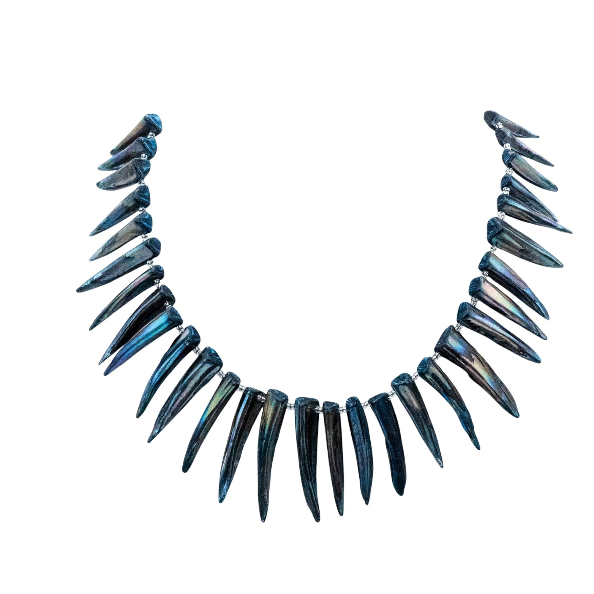 Necklace: Adjustable 16"–17.5" length with 1.5" abalone shell pieces separated by light blue seed beads and finished with a lobster clasp.