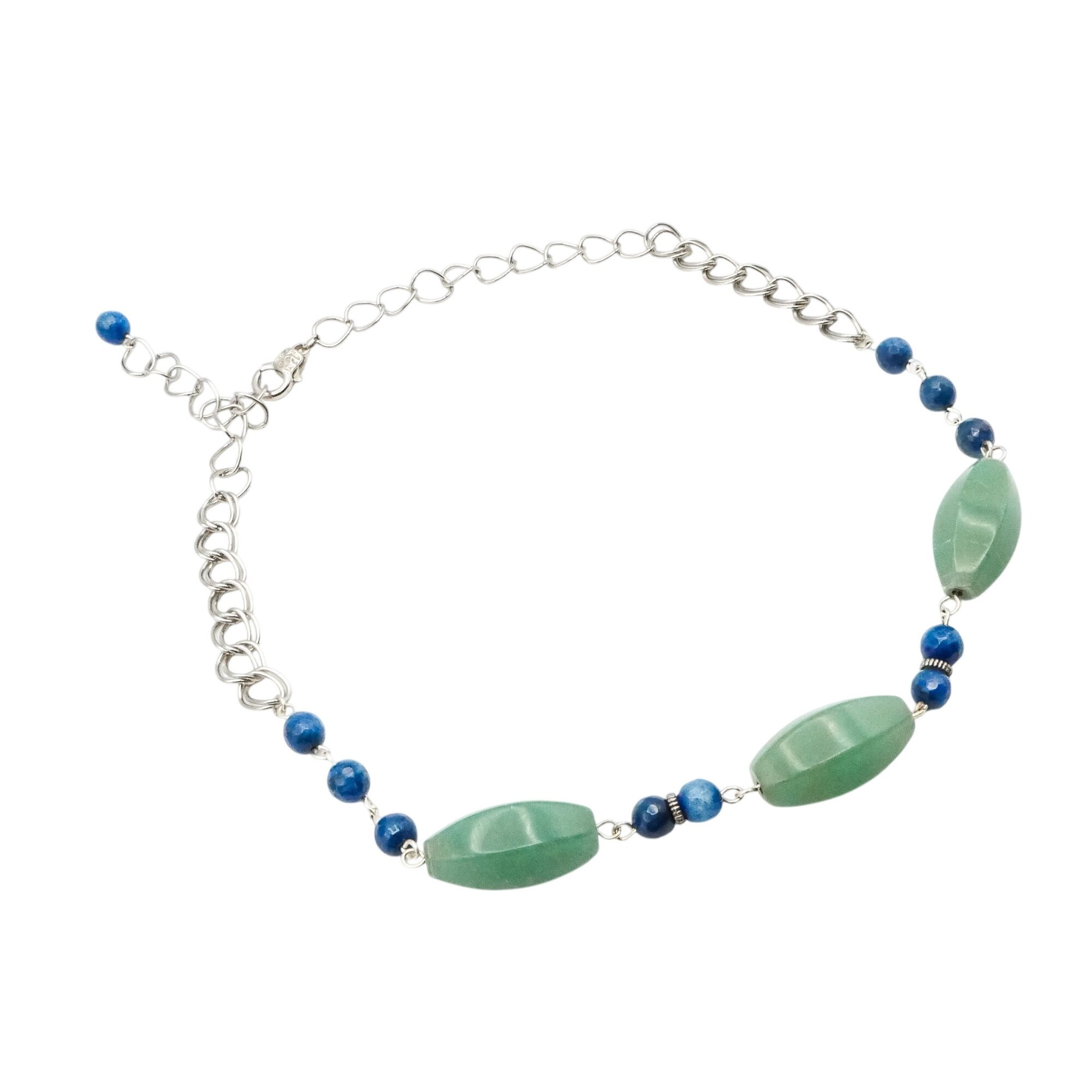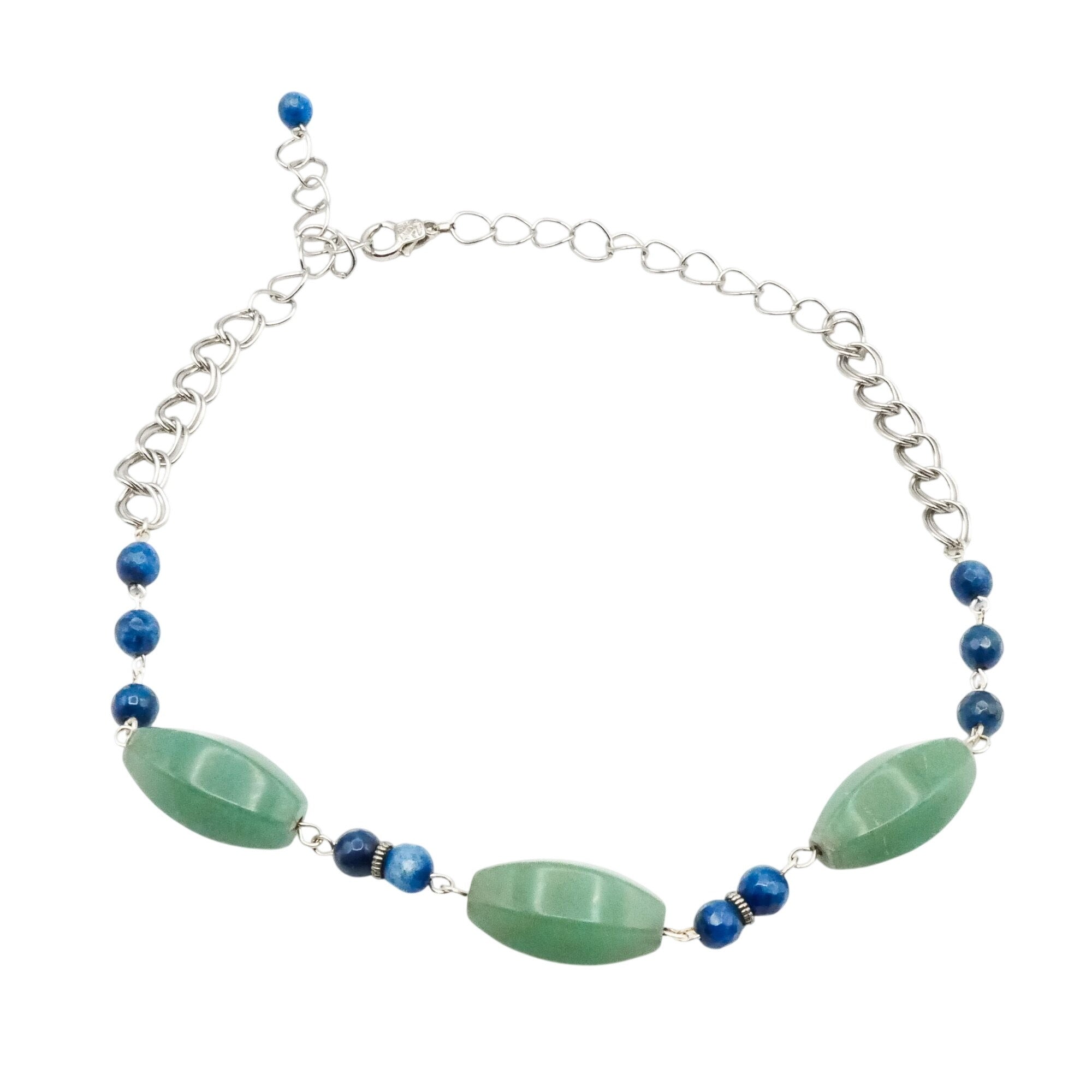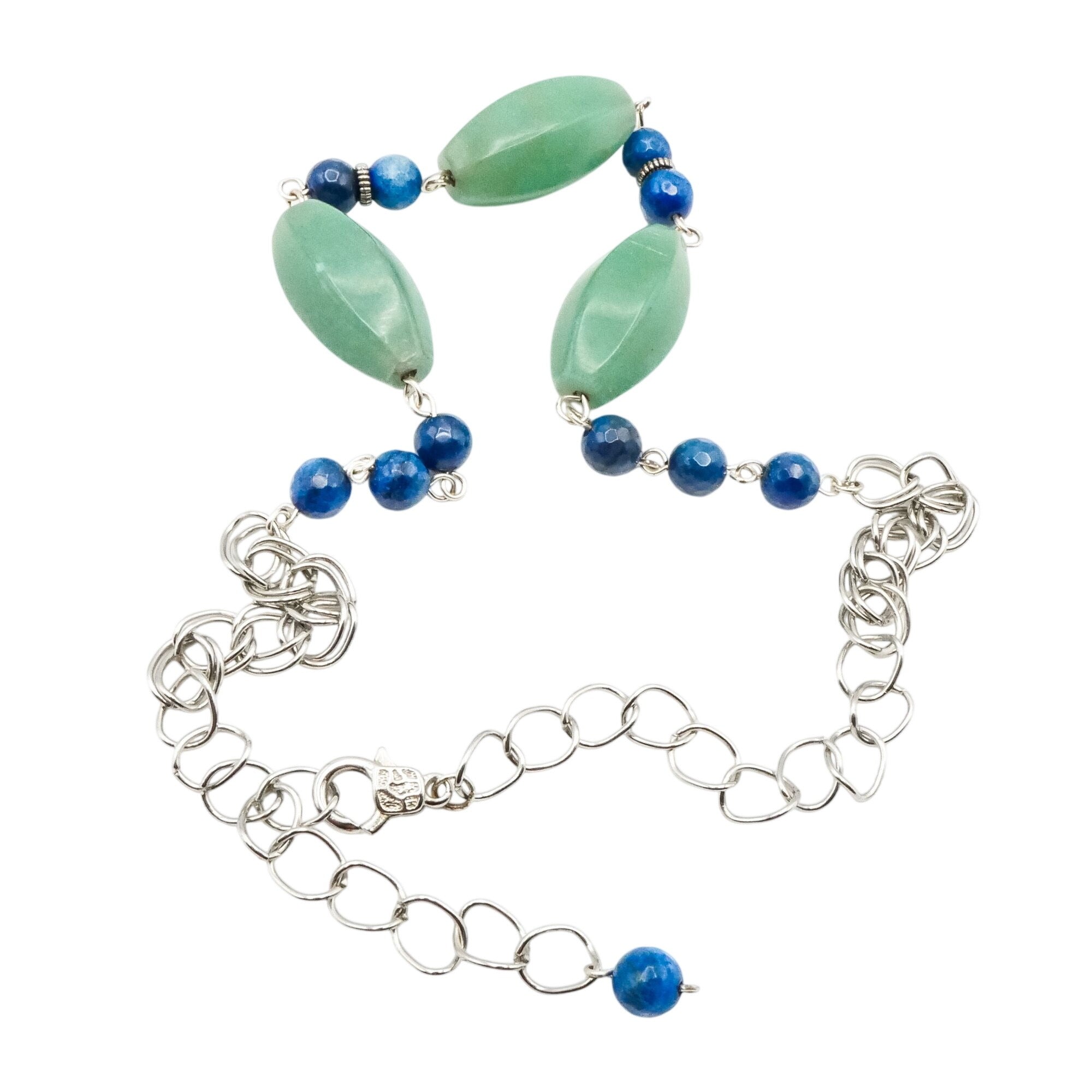 This striking gemstone necklace features softly polished nephrite beads paired with deep blue sodalite accents, creating a beautiful balance of calming color and organic elegance. The adjustable silver-tone chain allows the necklace to be worn at multiple lengths for versatile styling from day to evening.