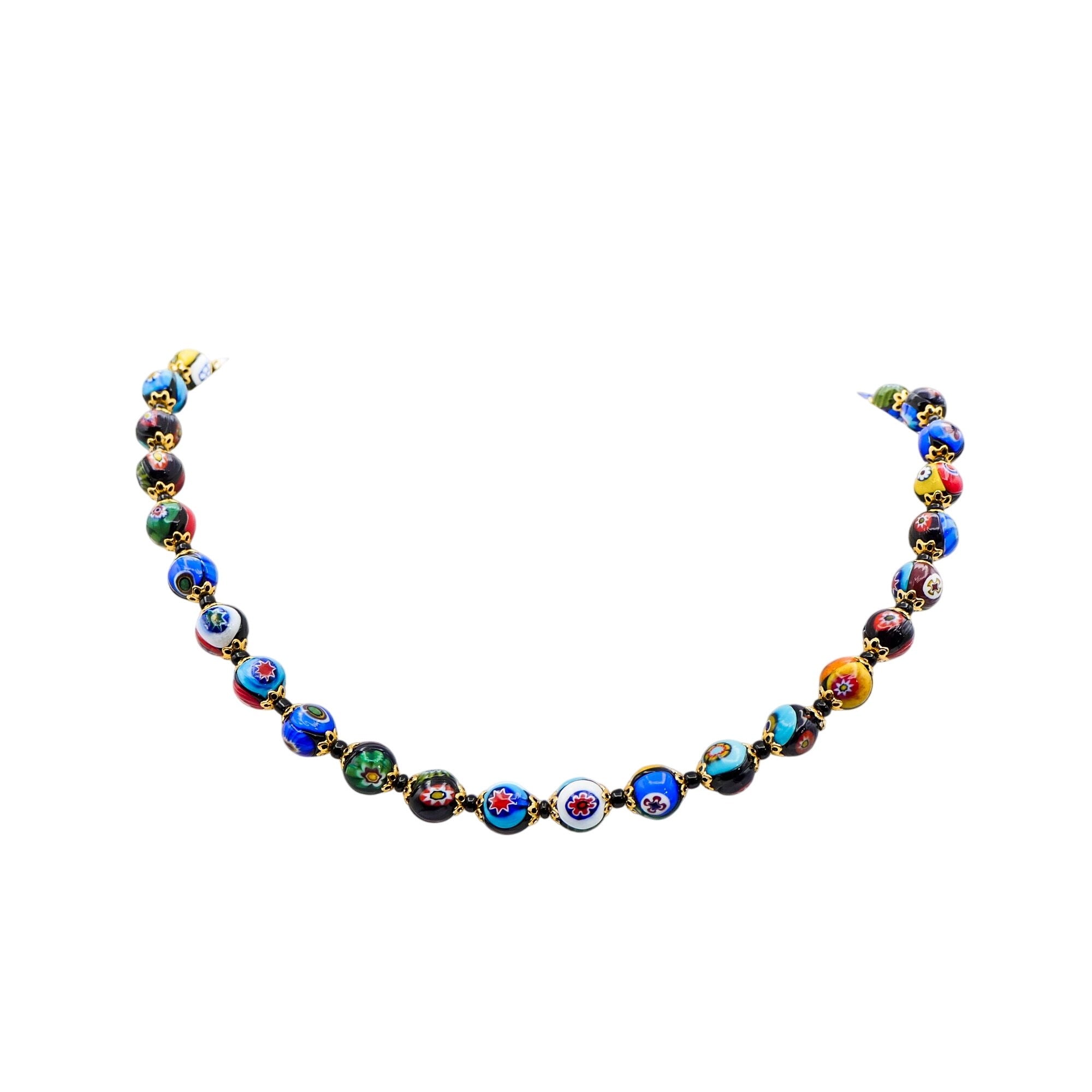 This vibrant Millefiori Murano Glass necklace features intricately designed beads, each radiating a unique blend of colors. The gold-plated clasp adds an elegant touch, making it a stunning accessory. This necklace can effortlessly elevate any ensemble, providing a pop of color and a distinct artistic flair.