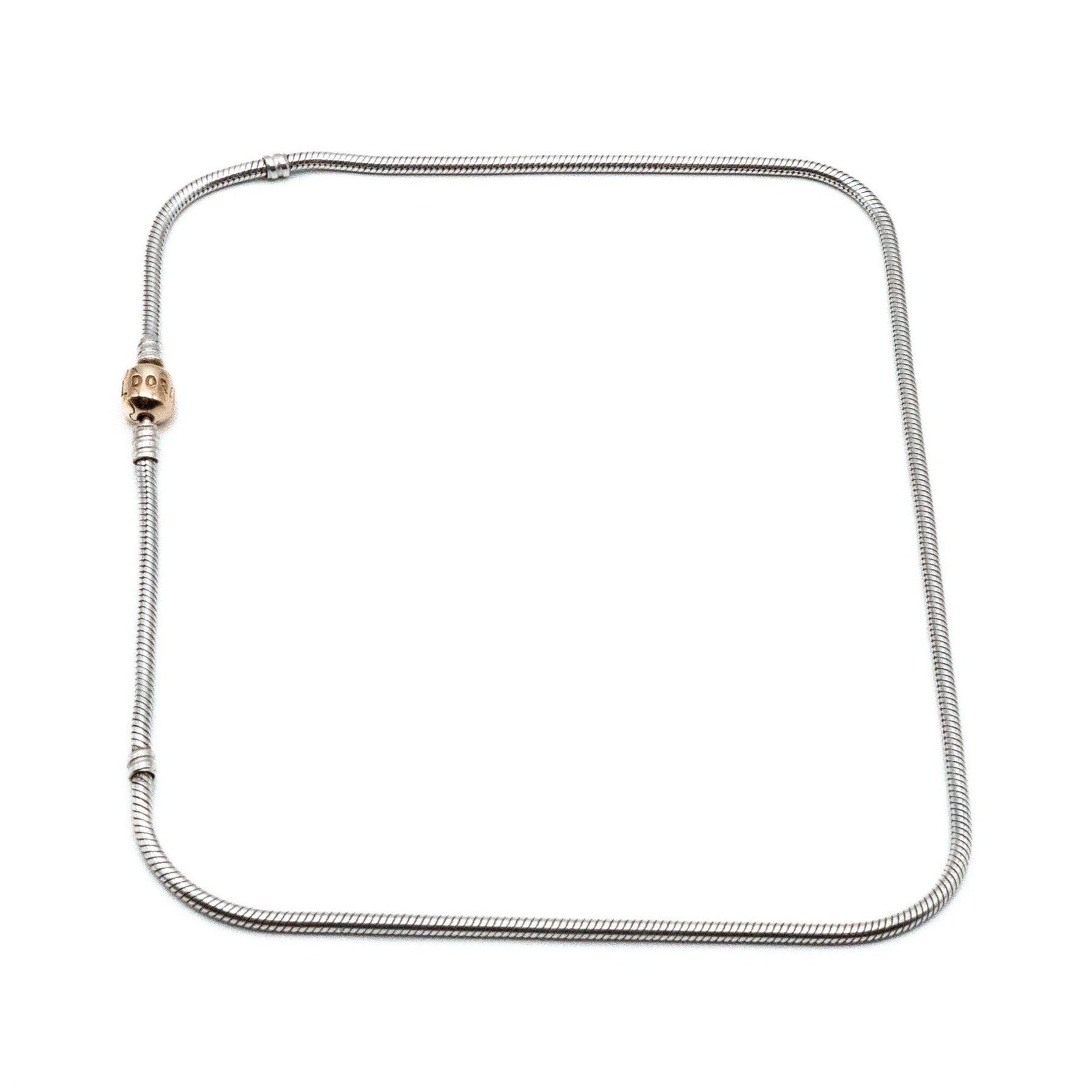This authentic Pandora snake chain necklace is crafted from .925 sterling silver and finished with a solid 14K yellow gold Pandora barrel clasp. This piece was produced prior to 2008, during the period when Pandora necklaces and bracelets did NOT feature the crown over the “O” hallmark, making it a desirable detail for collectors seeking earlier Pandora designs.