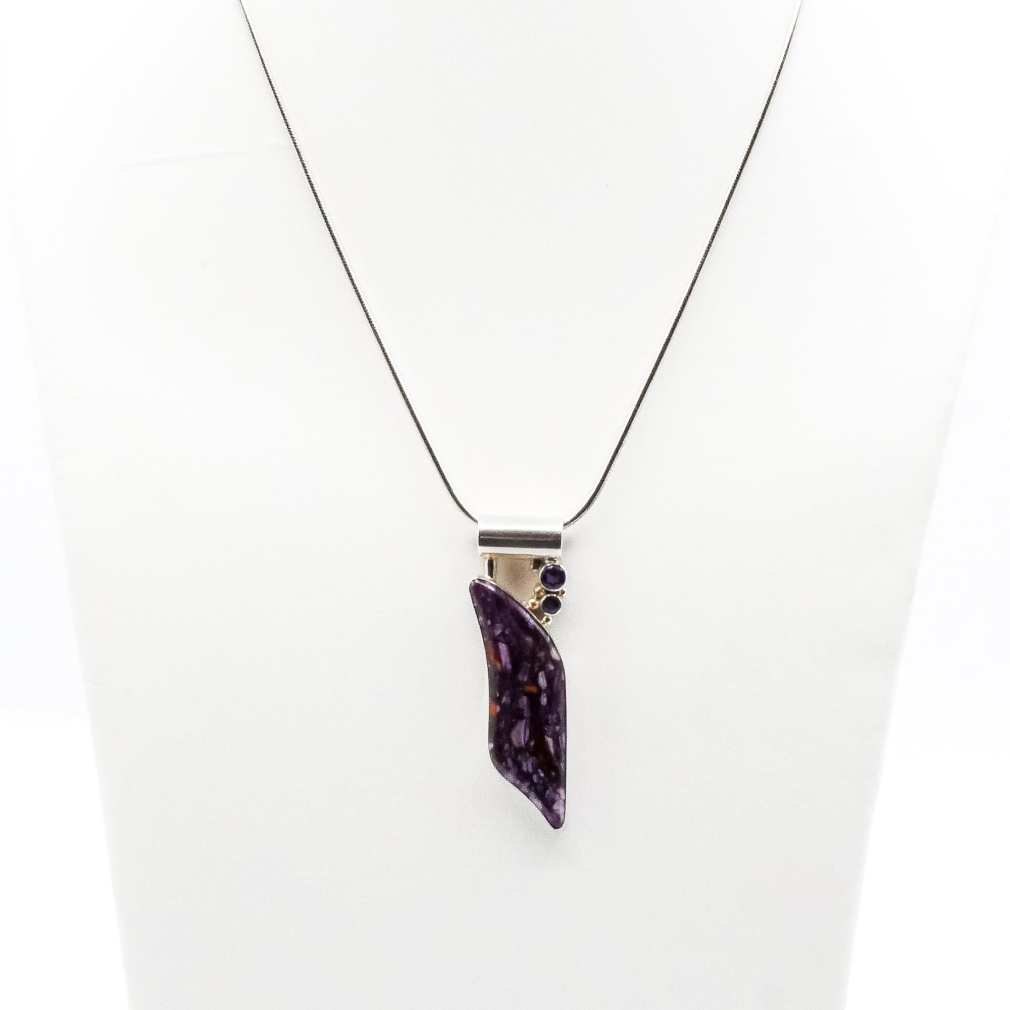 Make a bold statement with this one-of-a-kind 2-inch pendant featuring a rich purple Charoite cabochon and two sparkling round-cut Amethyst stones. The swirling patterns of Charoite are accented perfectly by the calming energy of Amethyst, all beautifully set in solid Sterling Silver with an 18-inch chain.