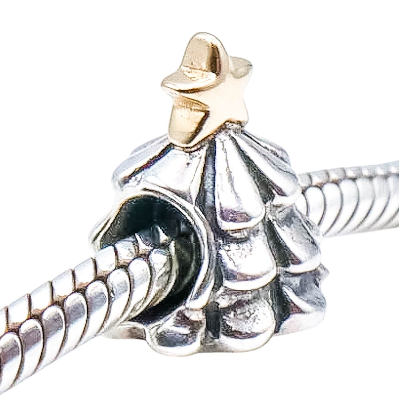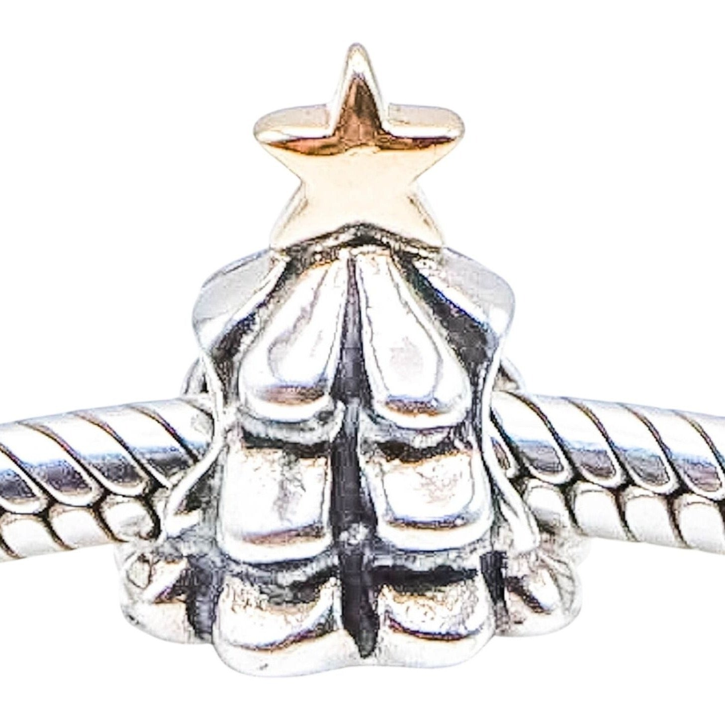 Celebrate the magic of the holiday season with this beautifully crafted retired Pandora Christmas Tree charm, designed in luminous sterling silver and topped with a warm solid 14K gold star. The sculptural tree silhouette captures festive elegance while the two-tone metal design adds collectible appeal and timeless seasonal symbolism.