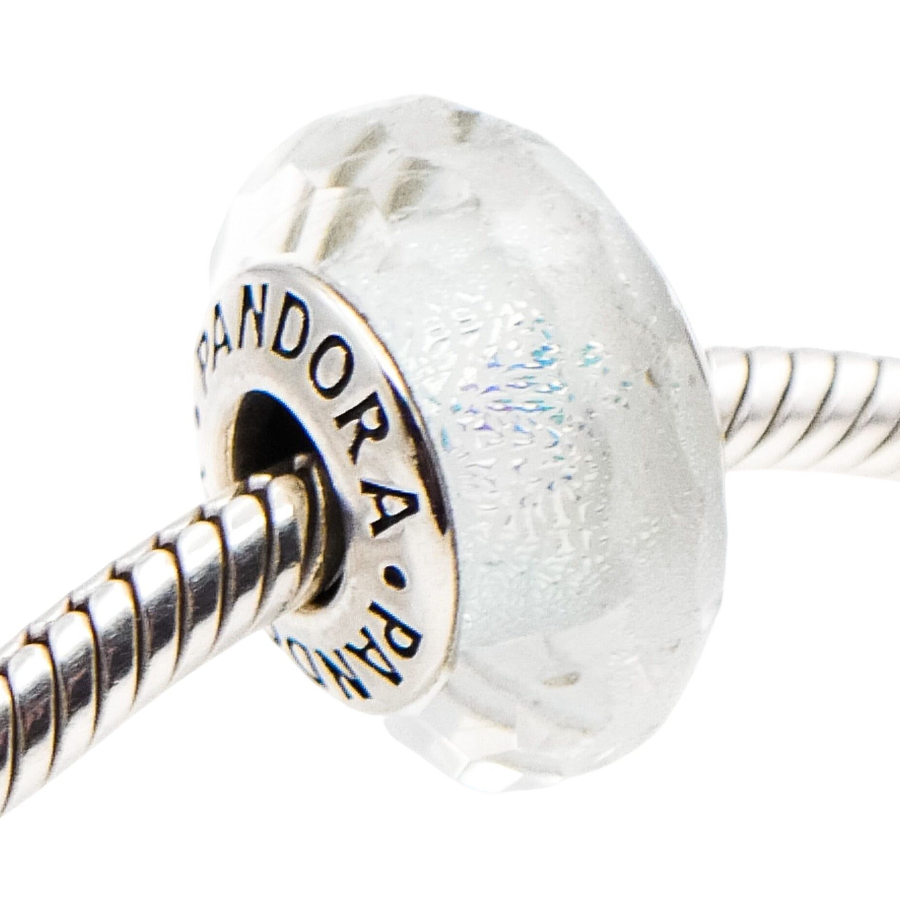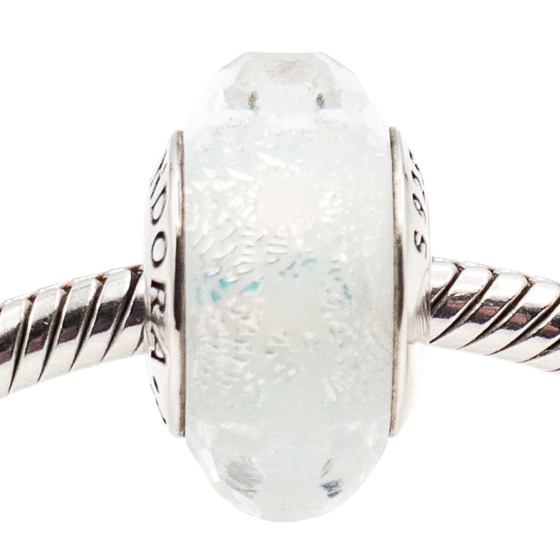 This luminous Pandora Murano glass charm features a soft frosty mint shimmer with a beautifully faceted surface that catches and reflects light from every angle. The subtle icy tones and internal sparkle give this charm a fresh, elegant look that pairs effortlessly with both pastel and silver bracelet designs.