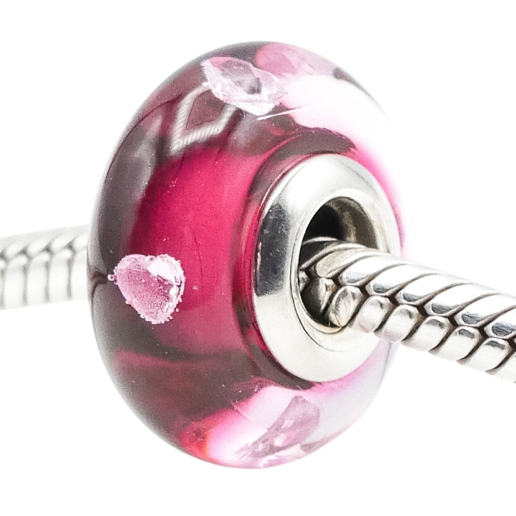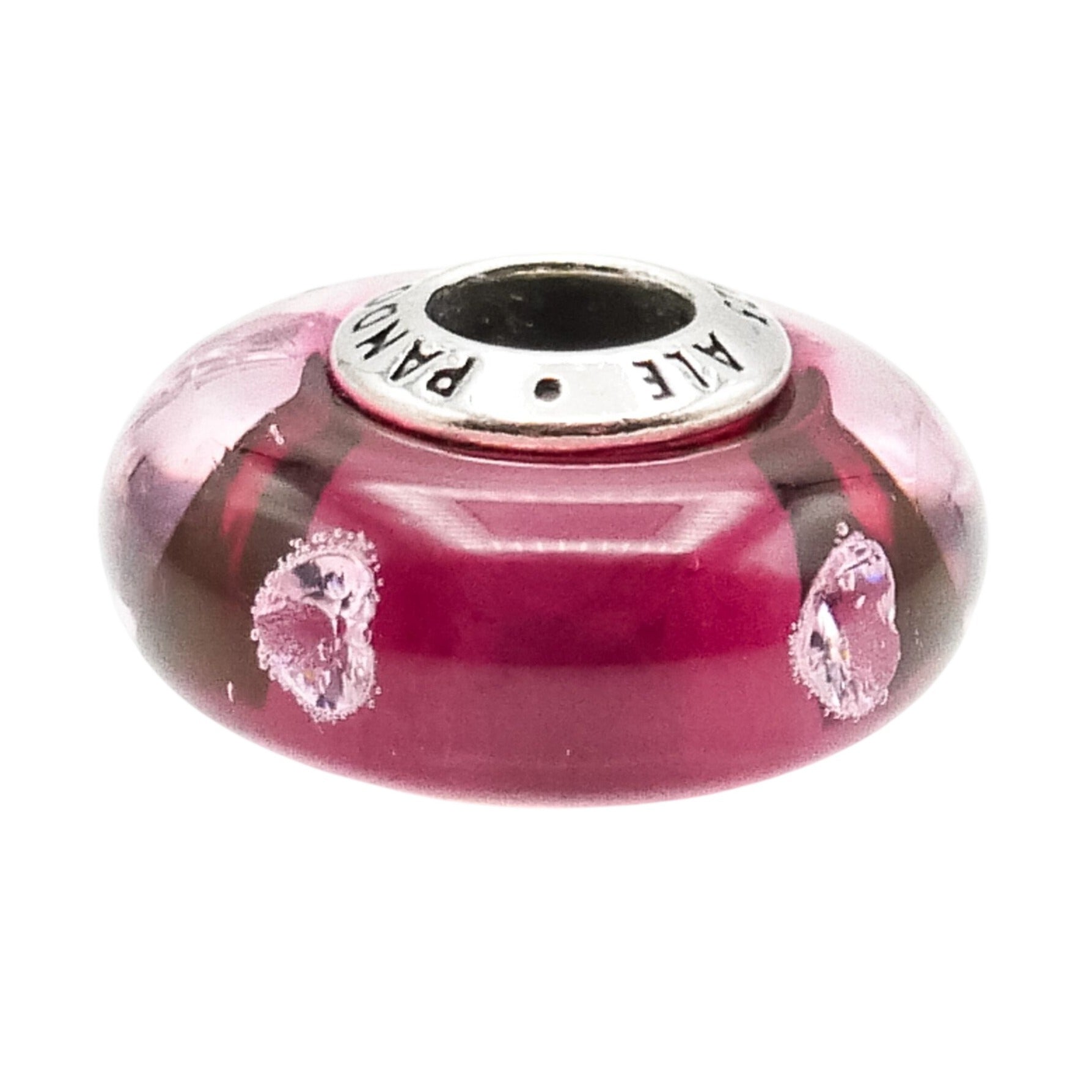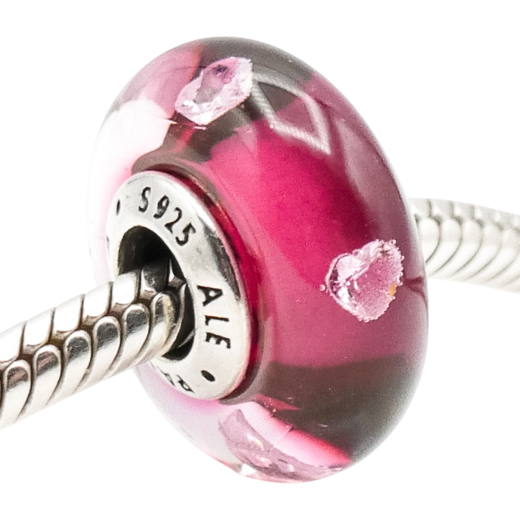 This elegant Pandora charm features a rich cerise pink Murano glass design accented with delicate clear cubic zirconia hearts, creating a romantic and luminous look. The sterling silver core adds timeless durability while allowing the vibrant glass to take center stage.