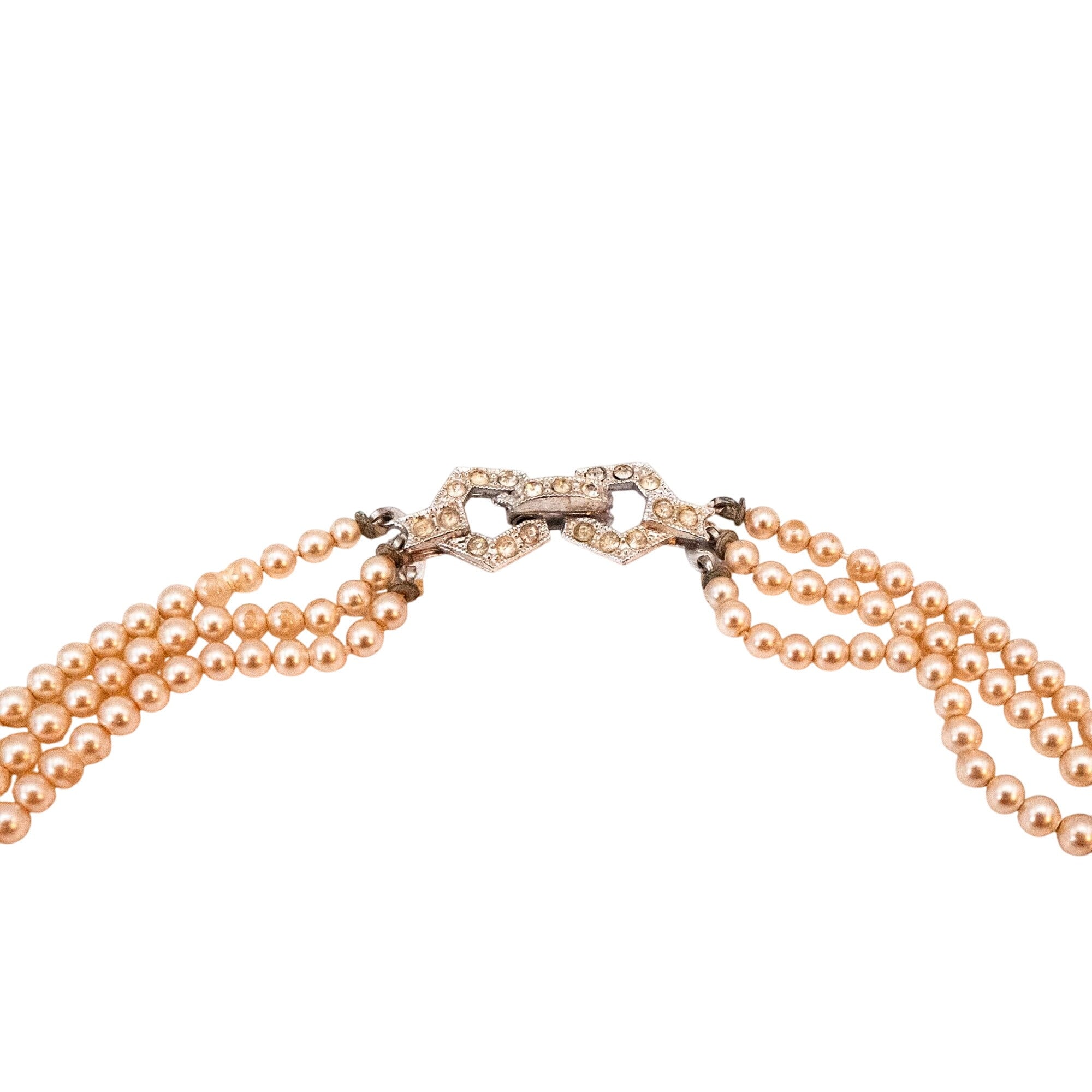 Vintage 16.5-Inch Simulated Graduating Champagne Pearl Triple Strand Necklace. This elegant necklace from the 1960's is in great condition. The champagne colored glass pearls have a nice weight to them and lay perfectly around the neck. The pearls are gradually getting larger in size from 3.5 to 8mm and the silver tone metal clasp features a Diamante Rhinestone design.