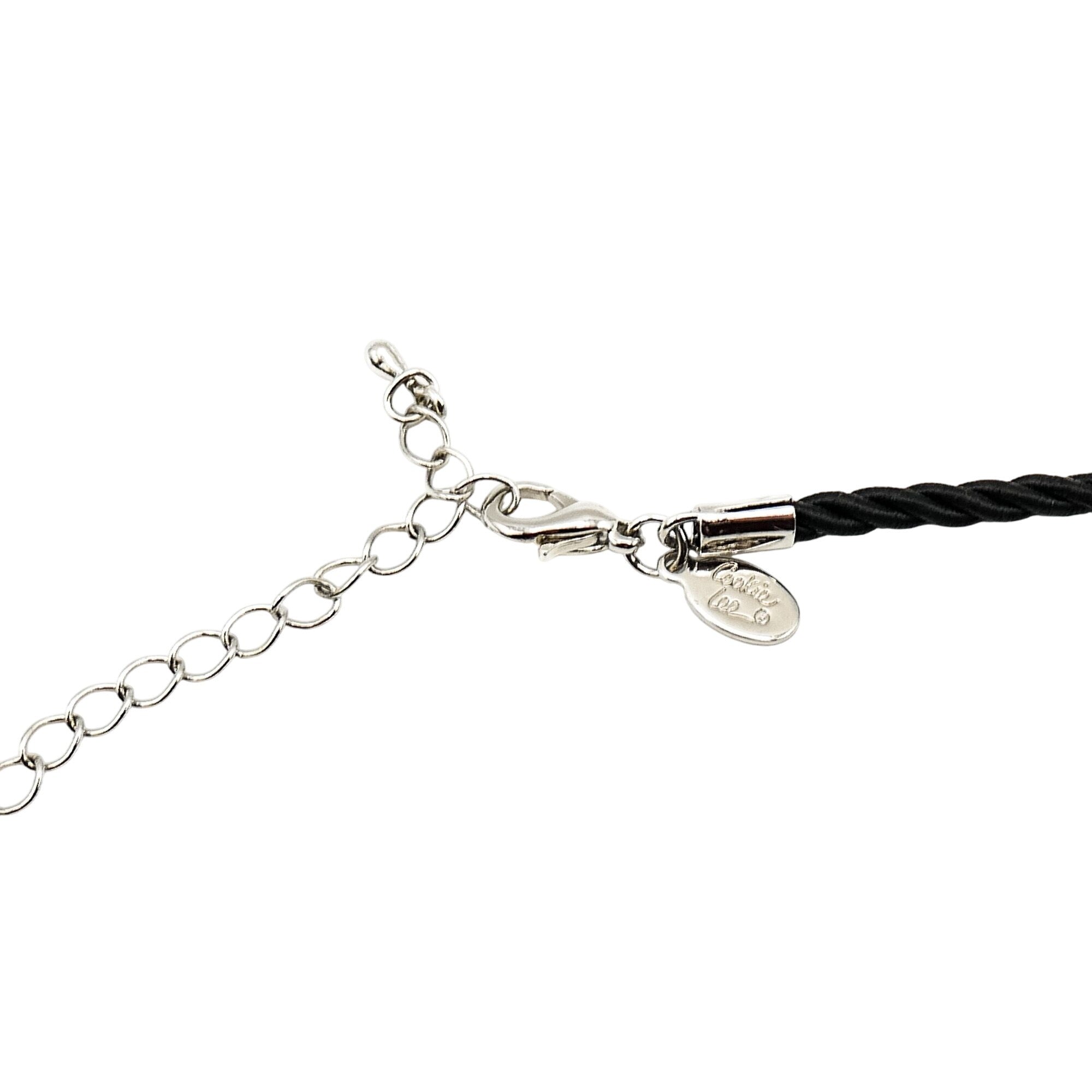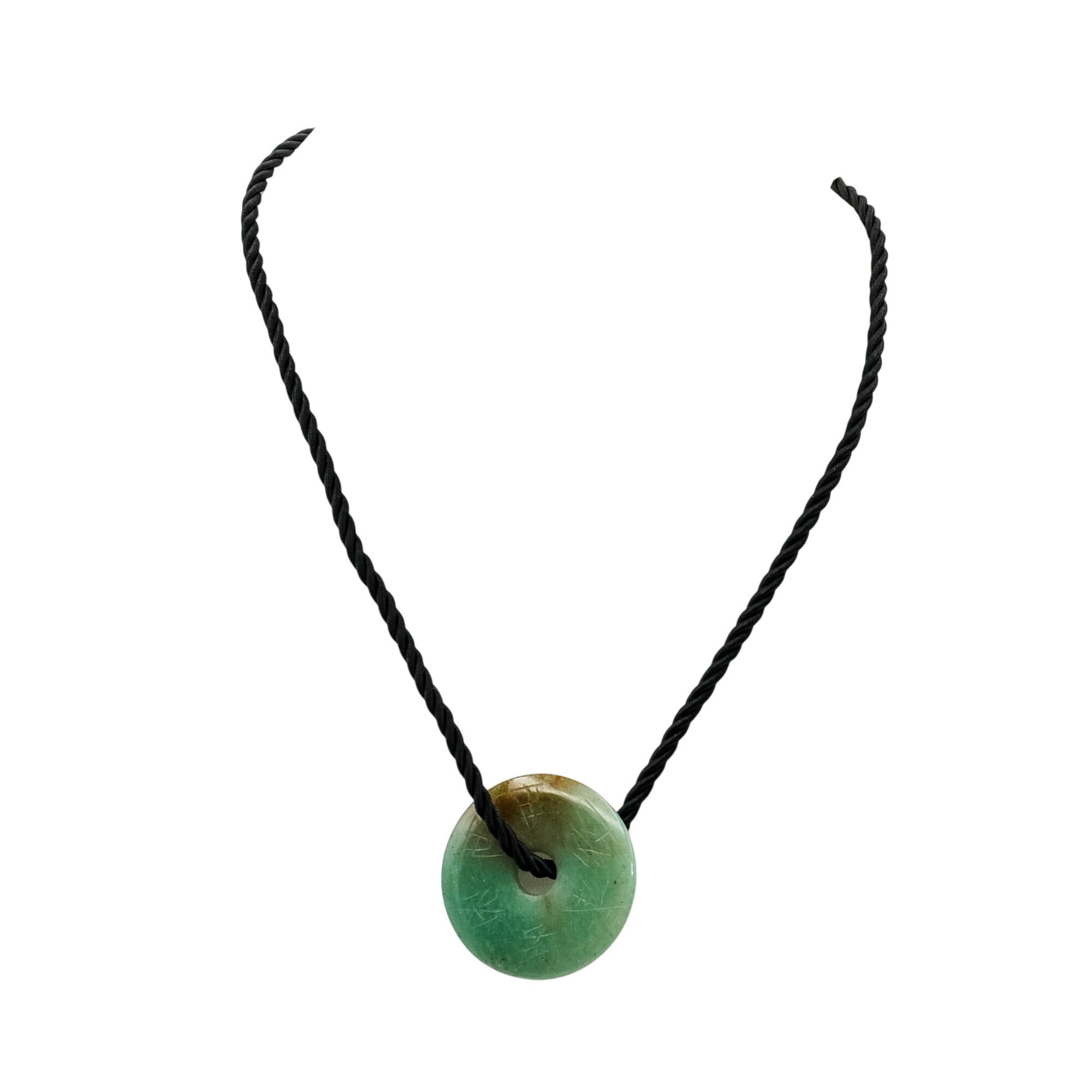 This striking necklace features a smooth jade pendant with subtle Chinese engravings, elegantly suspended on a black twisted cord. The jade's earthy tones add a natural charm, while the adjustable silver-tone clasp ensures a custom fit. A fusion of cultural symbolism and modern simplicity for unique accessorizing.
