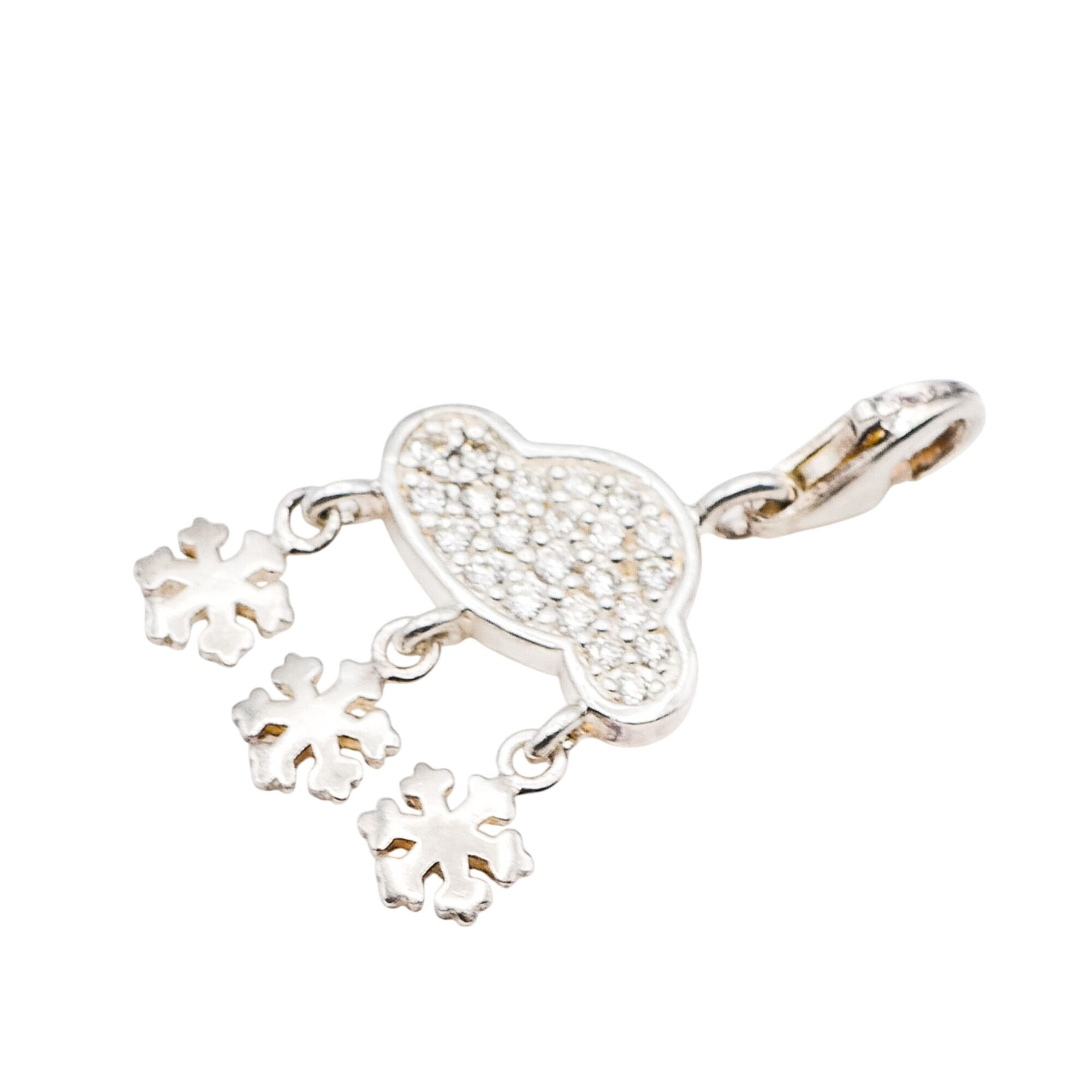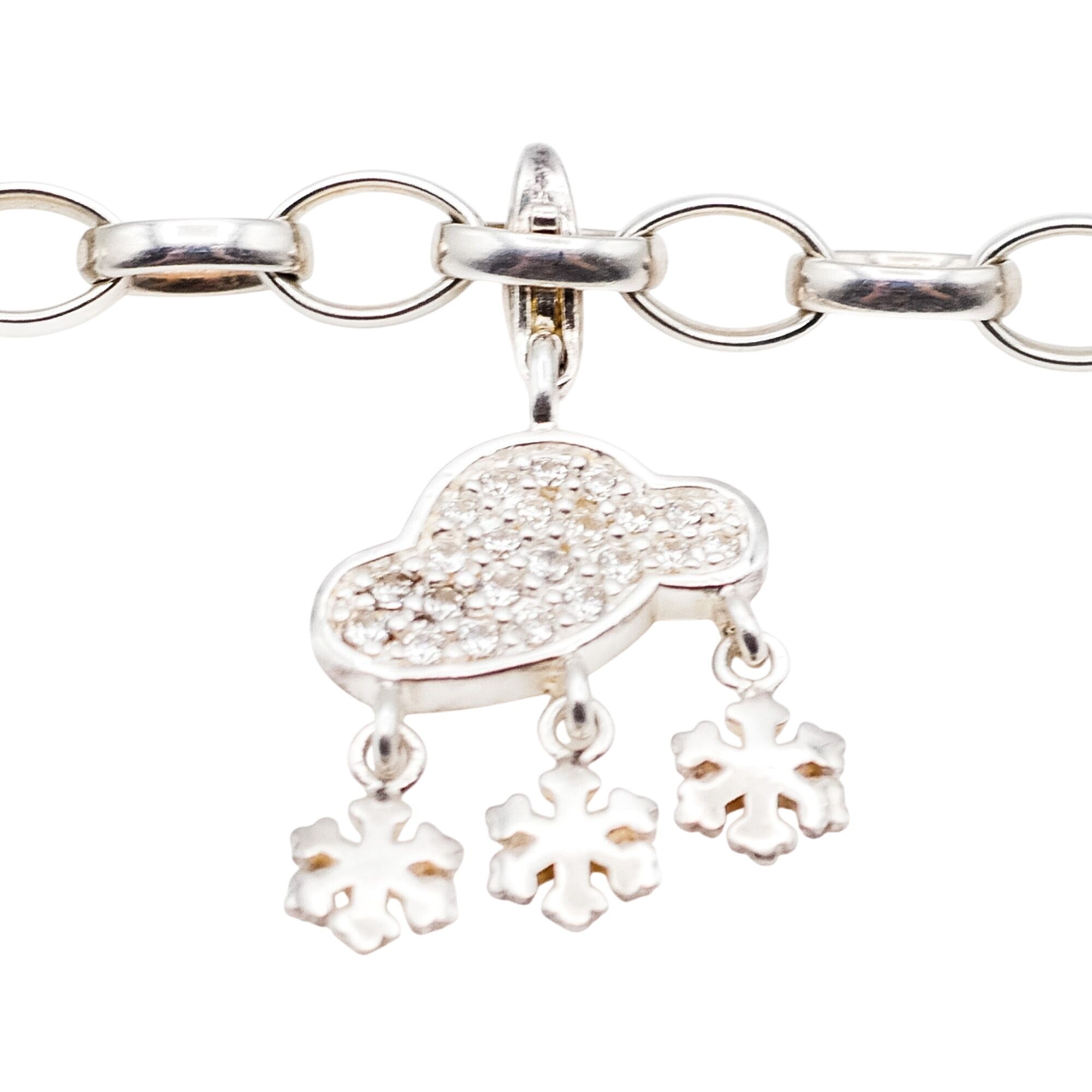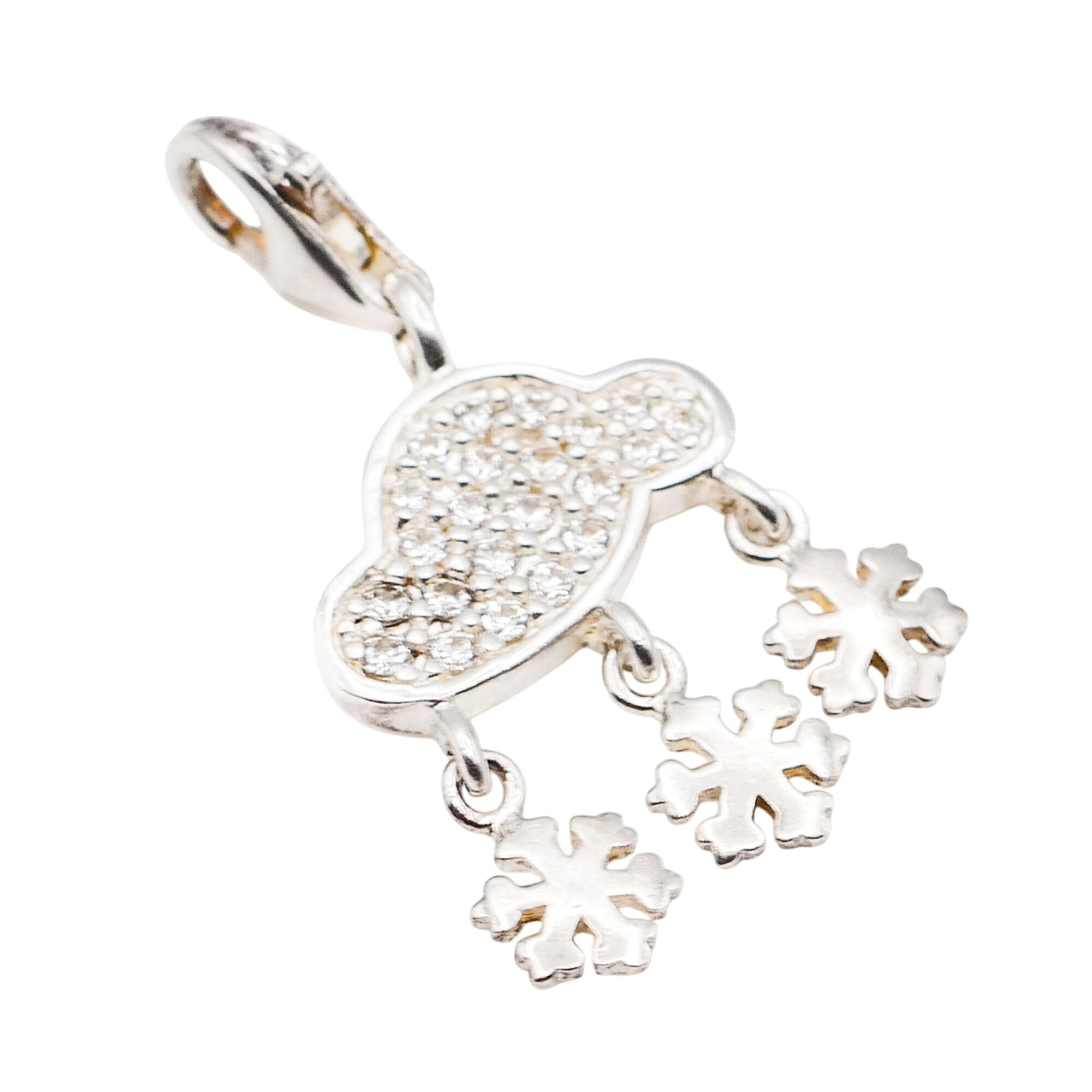 Glistening like a winter wonderland, this sterling silver charm showcases a sparkling cloud adorned with crystals, dangling delicate snowflakes for a whimsical touch.