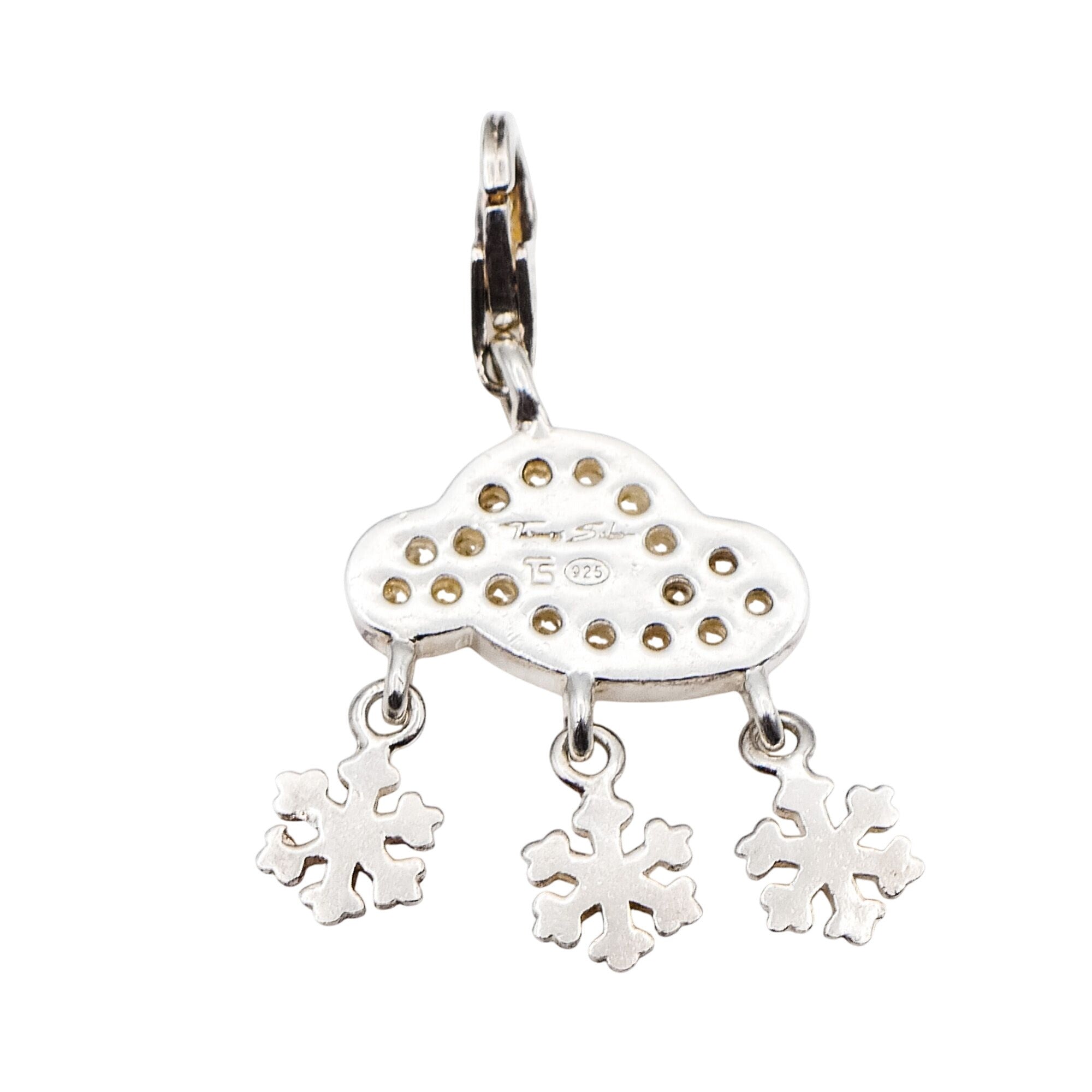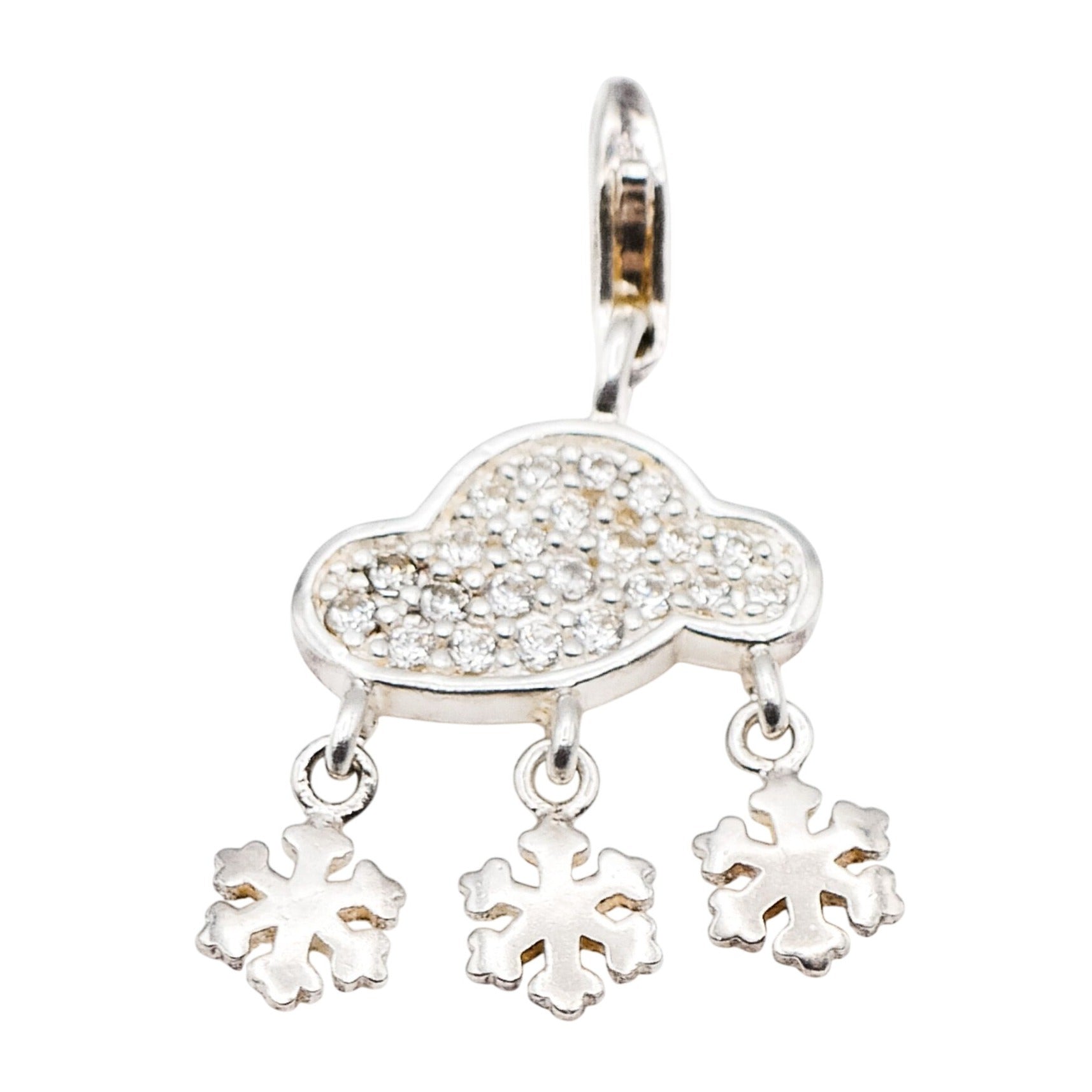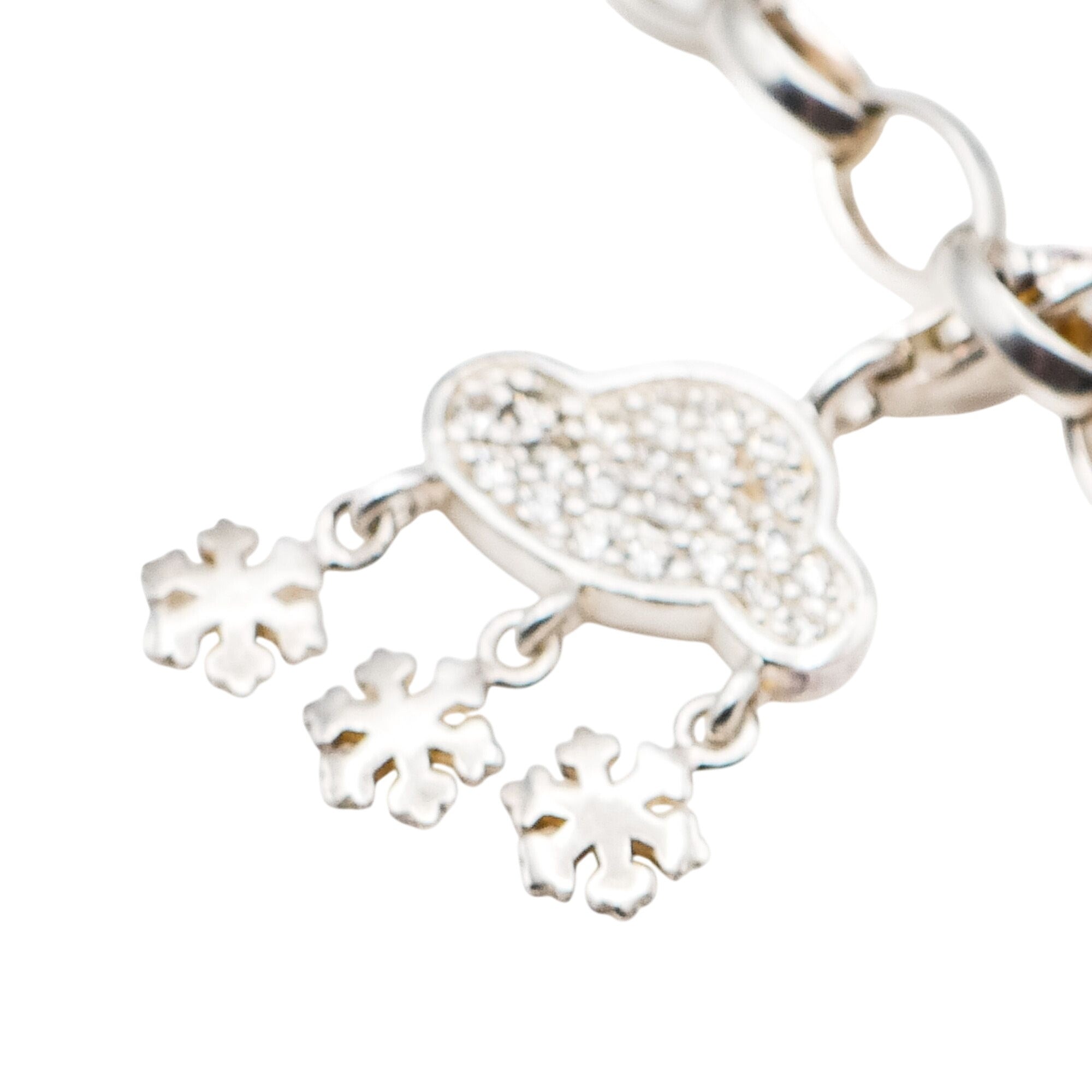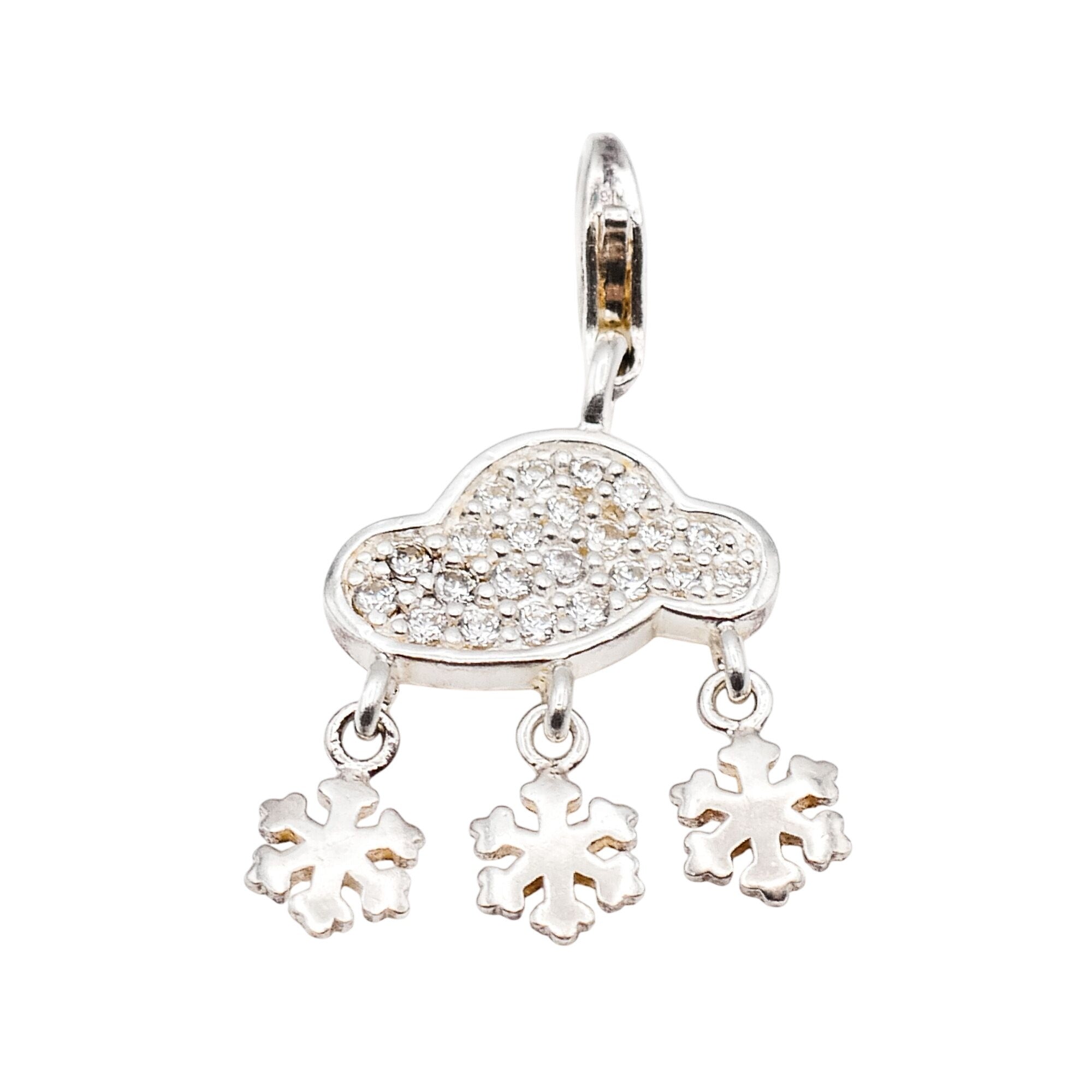 Glistening like a winter wonderland, this sterling silver charm showcases a sparkling cloud adorned with crystals, dangling delicate snowflakes for a whimsical touch.