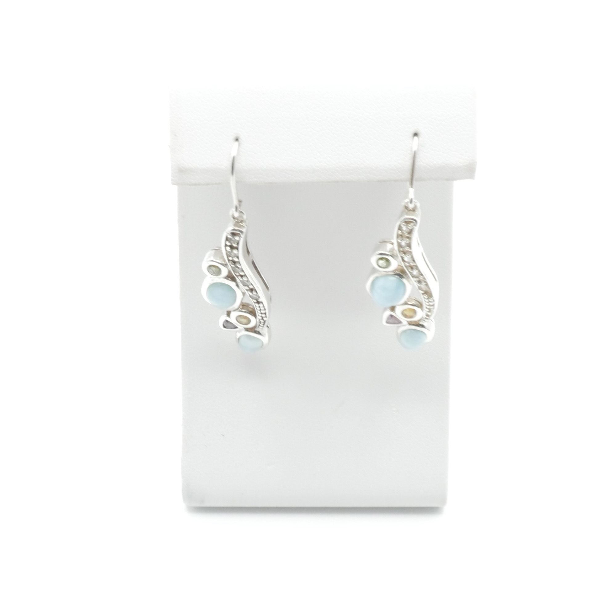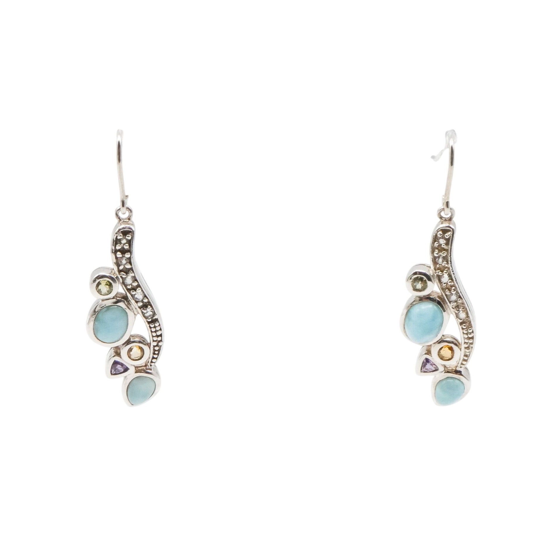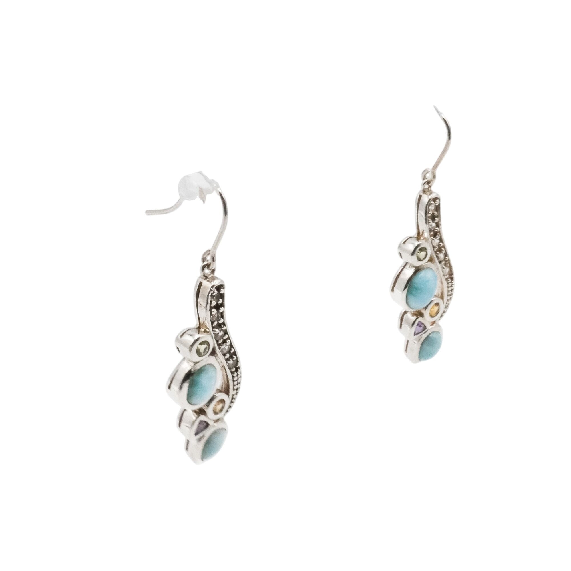 From the sought-after Amara Collection by MarahLago, these retired larimar earrings offer a refined blend of Caribbean elegance and vibrant gemstone artistry. The soft, ocean-blue larimar cabochons are beautifully complemented by accents of peridot, citrine, and amethyst, creating a luminous, colorful composition set in sterling silver.