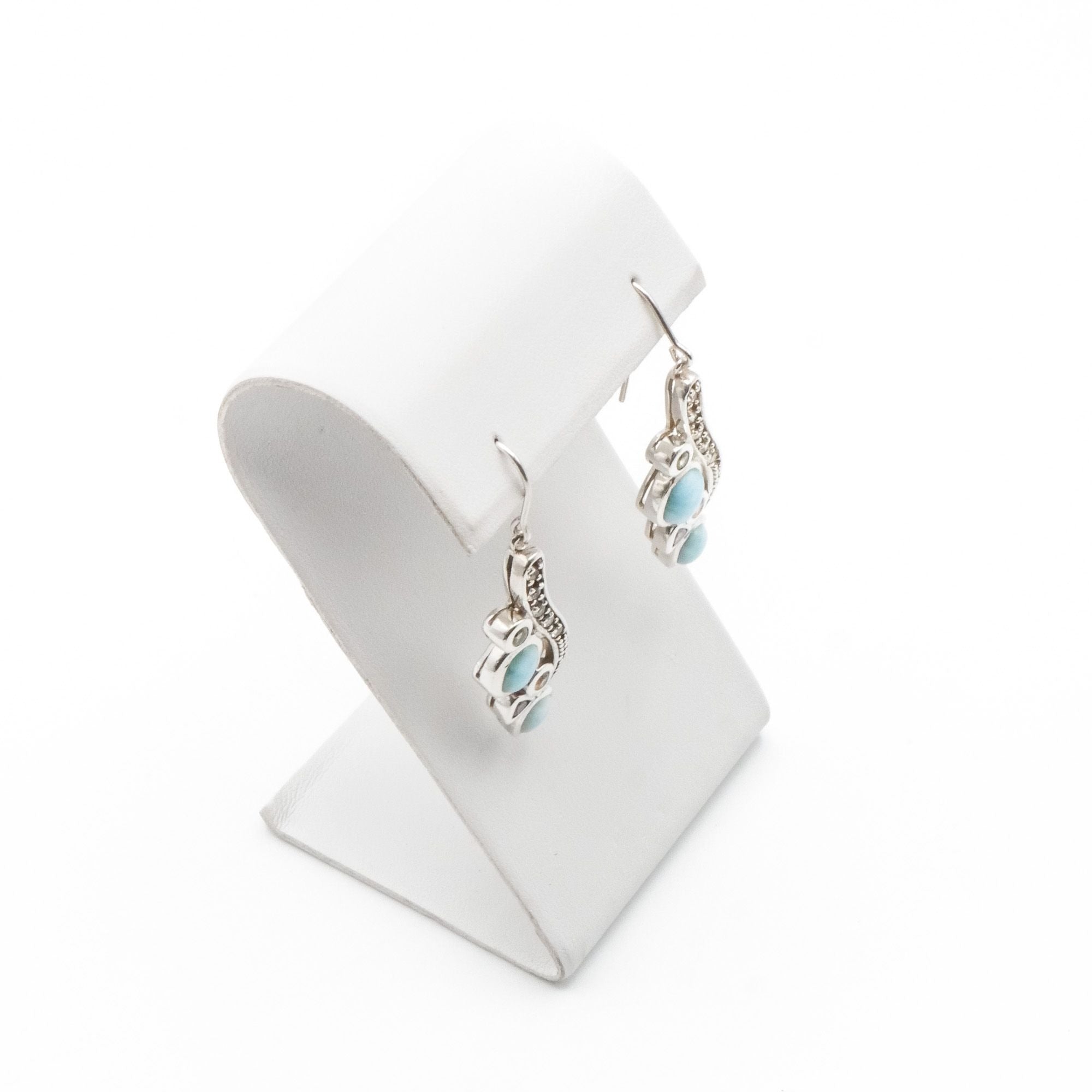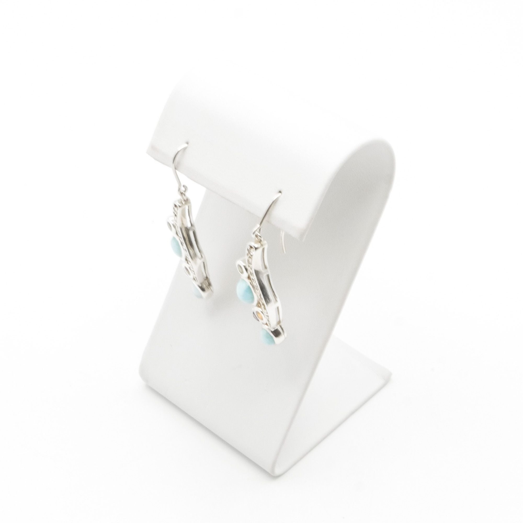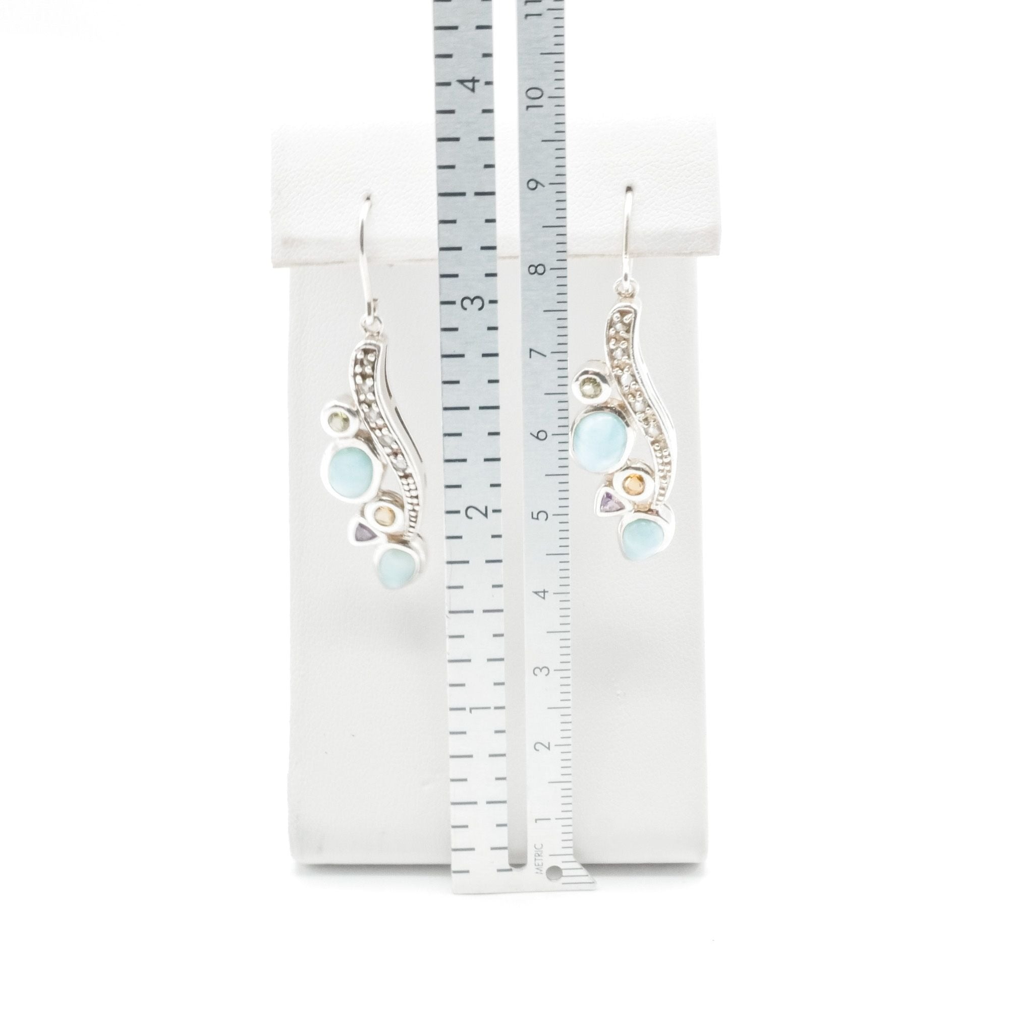 From the sought-after Amara Collection by MarahLago, these retired larimar earrings offer a refined blend of Caribbean elegance and vibrant gemstone artistry. The soft, ocean-blue larimar cabochons are beautifully complemented by accents of peridot, citrine, and amethyst, creating a luminous, colorful composition set in sterling silver.