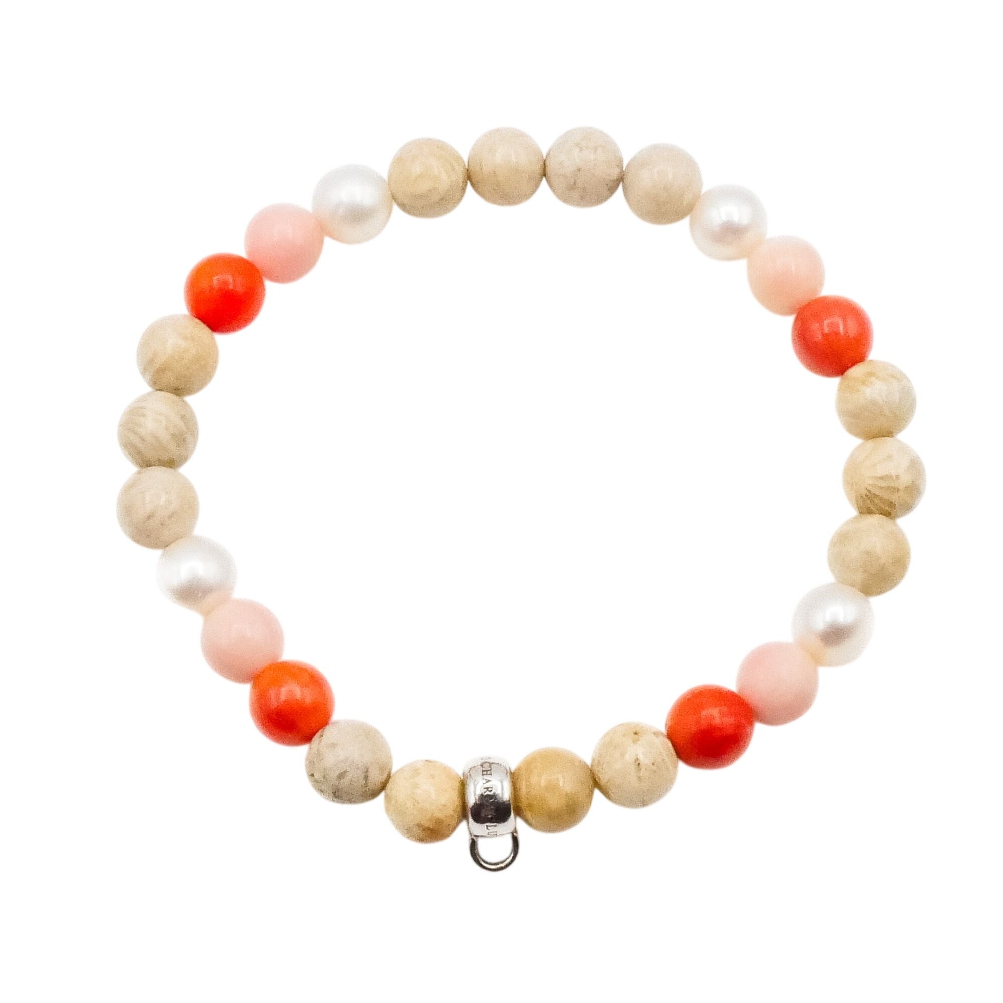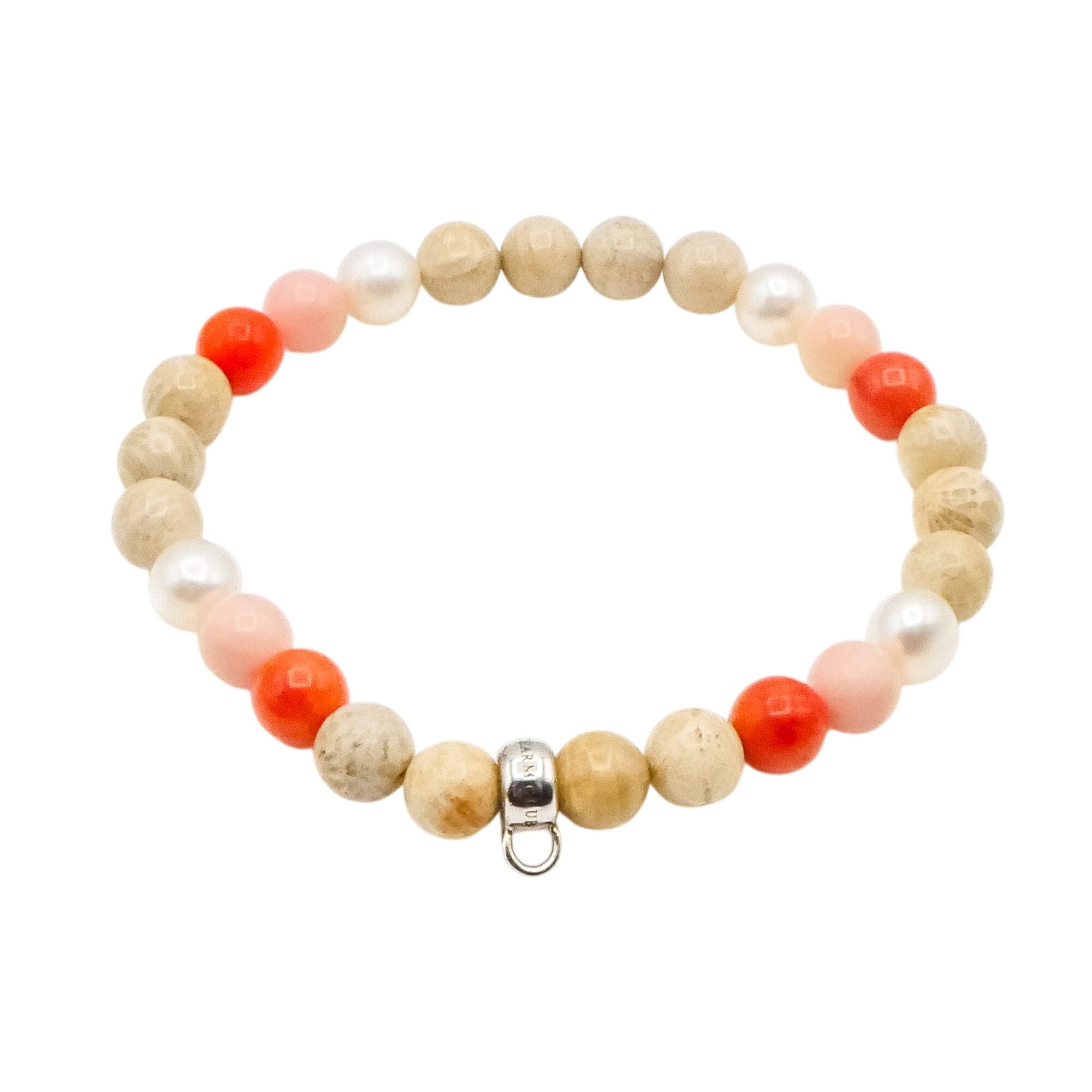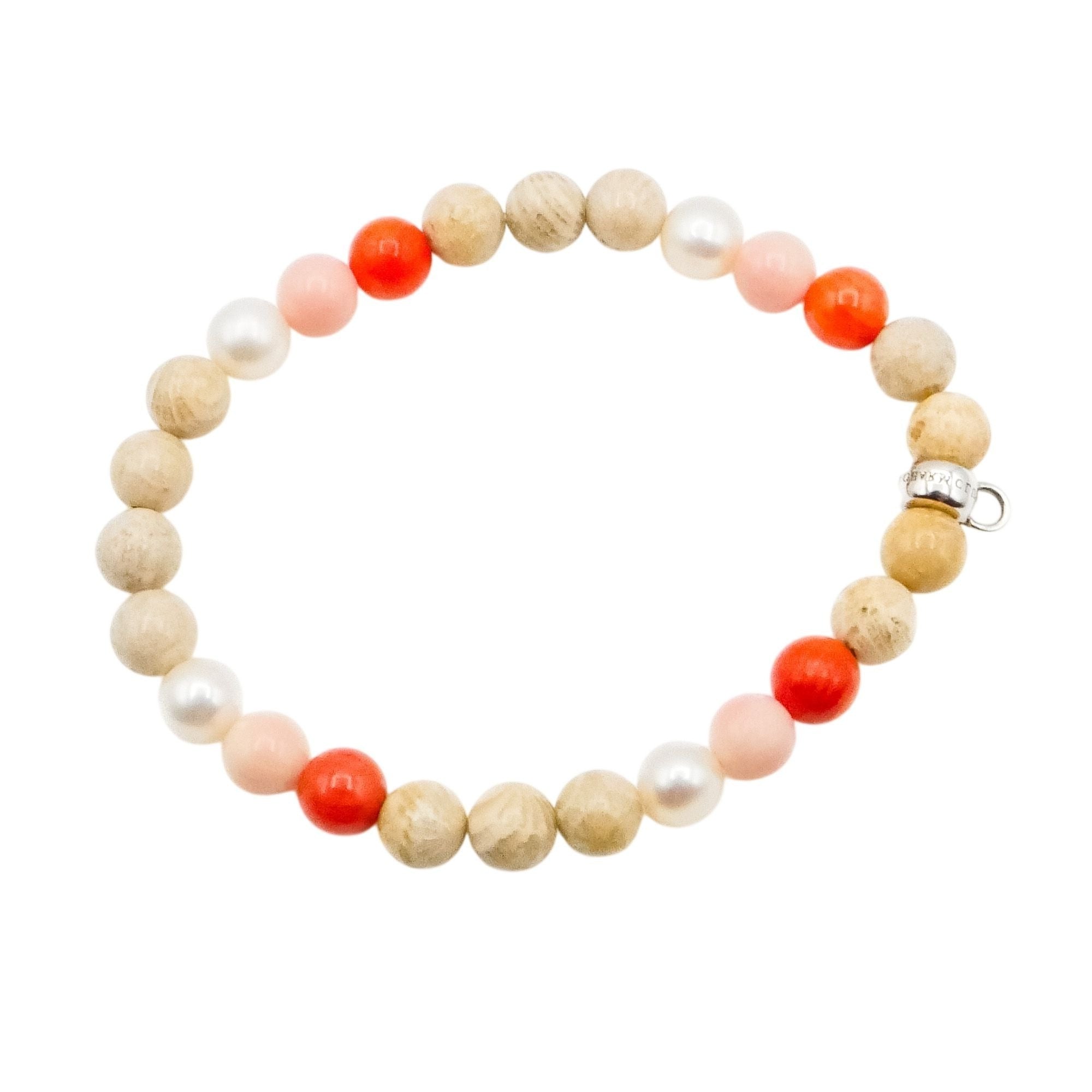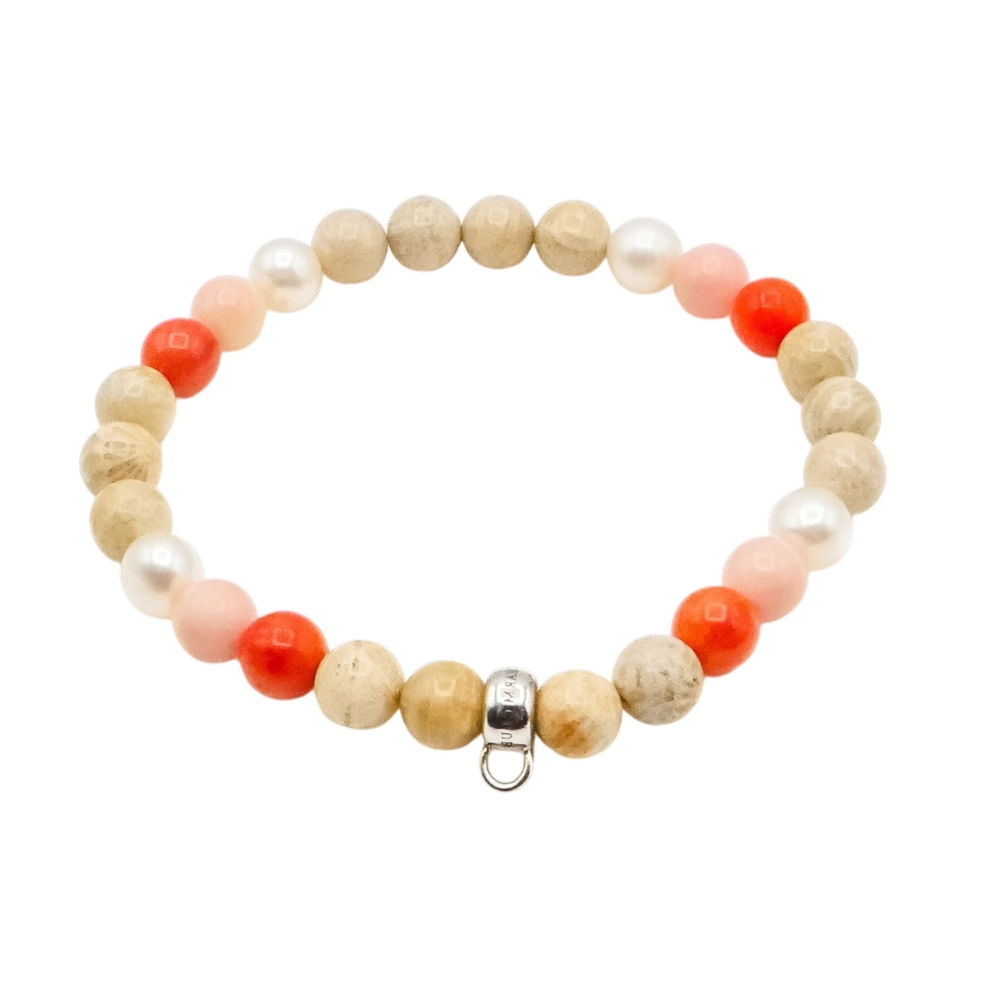 This bracelet is perfect as a standalone piece or as a base for building your own personalized charm story. The mix of warm peach, blush, and creamy tones makes this a versatile and feminine accessory.