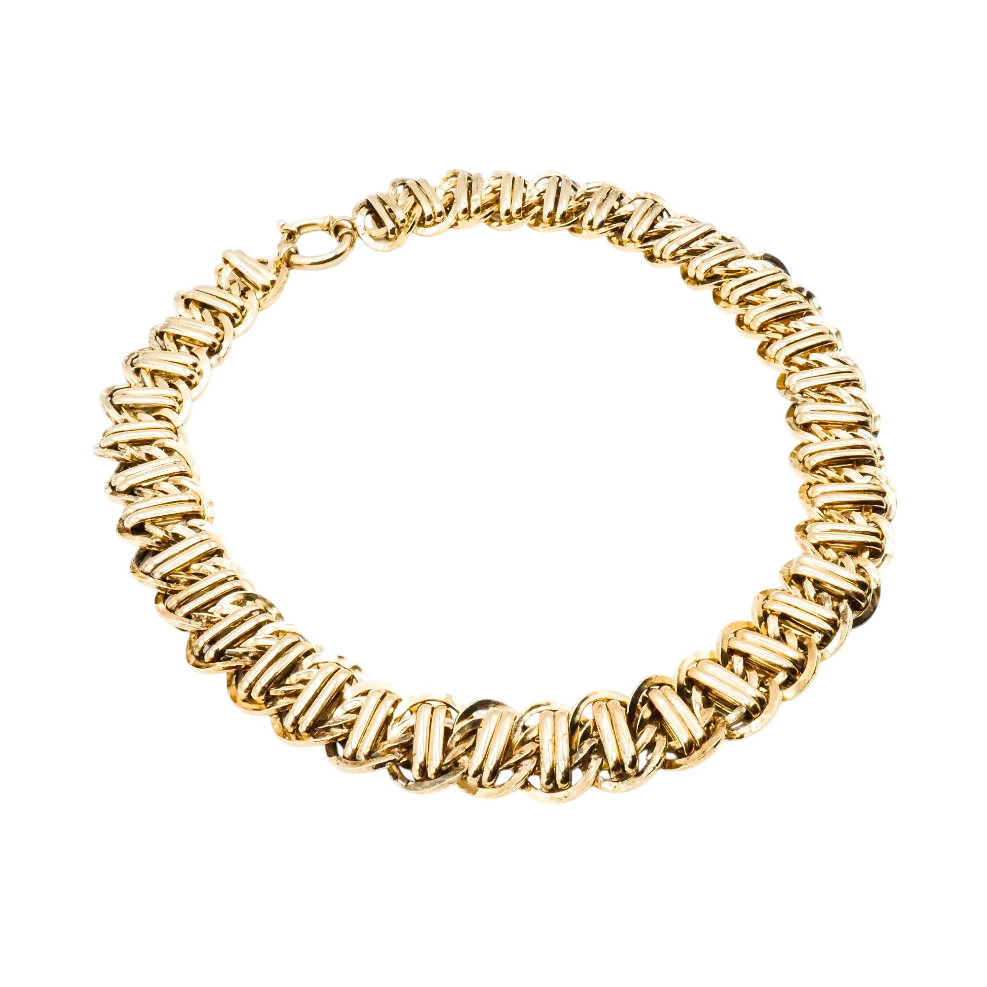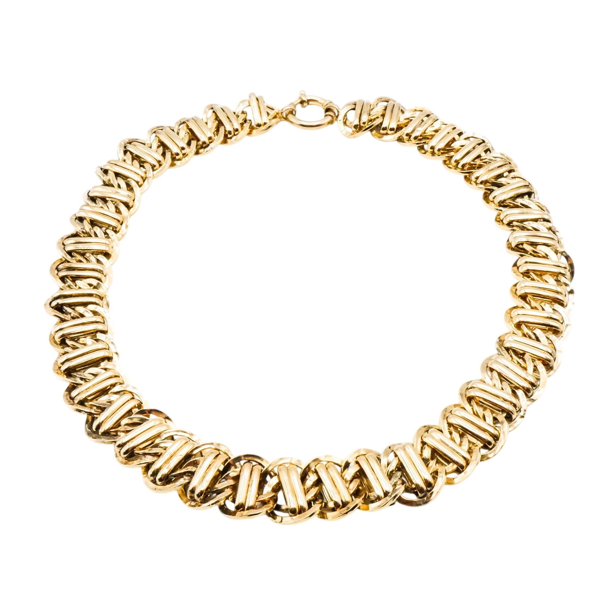 Weighing an impressive 57.23 grams, this necklace has a luxurious presence and sits beautifully at the neckline as a true statement collar. The interlocking woven construction gives it both strength and fluidity, reflecting classic Italian-inspired craftsmanship popular in late 20th century design.
