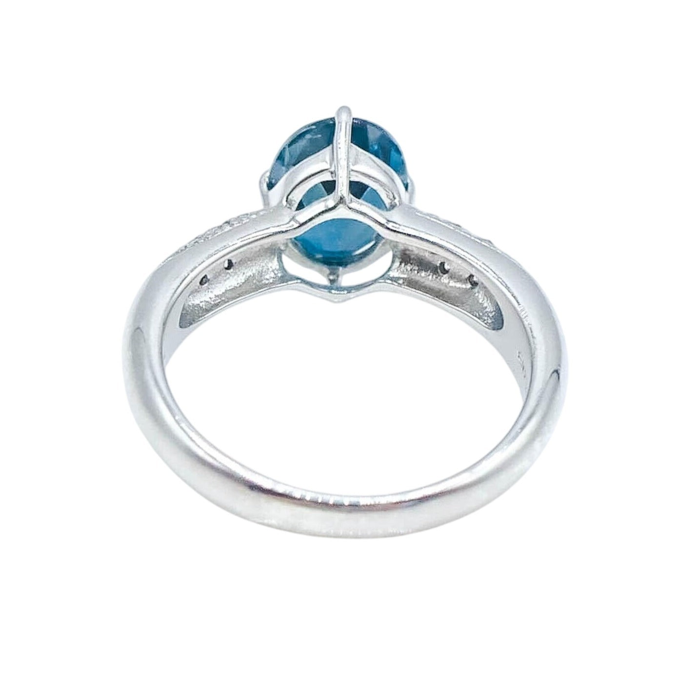 This exquisite ring showcases a 2.5 carat London Blue Topaz, shimmering with oceanic depths. Twelve white diamonds dazzle on a sterling silver band, creating a timeless harmony. Ideal for those who appreciate the interplay of color and refined craftsmanship, this piece is both sophisticated and captivating.