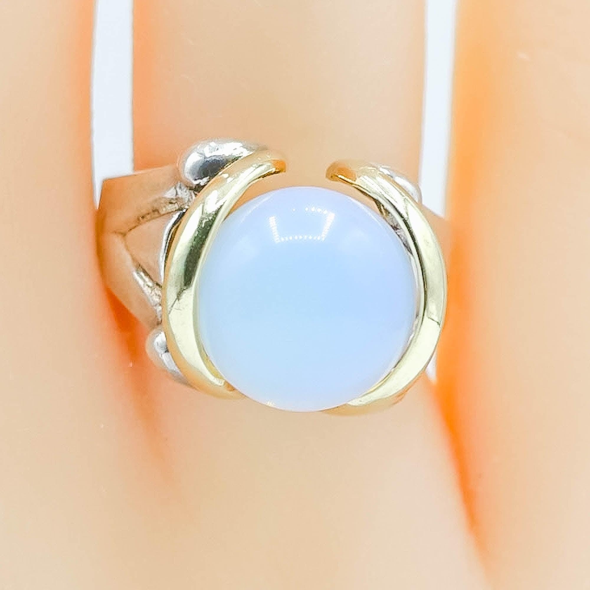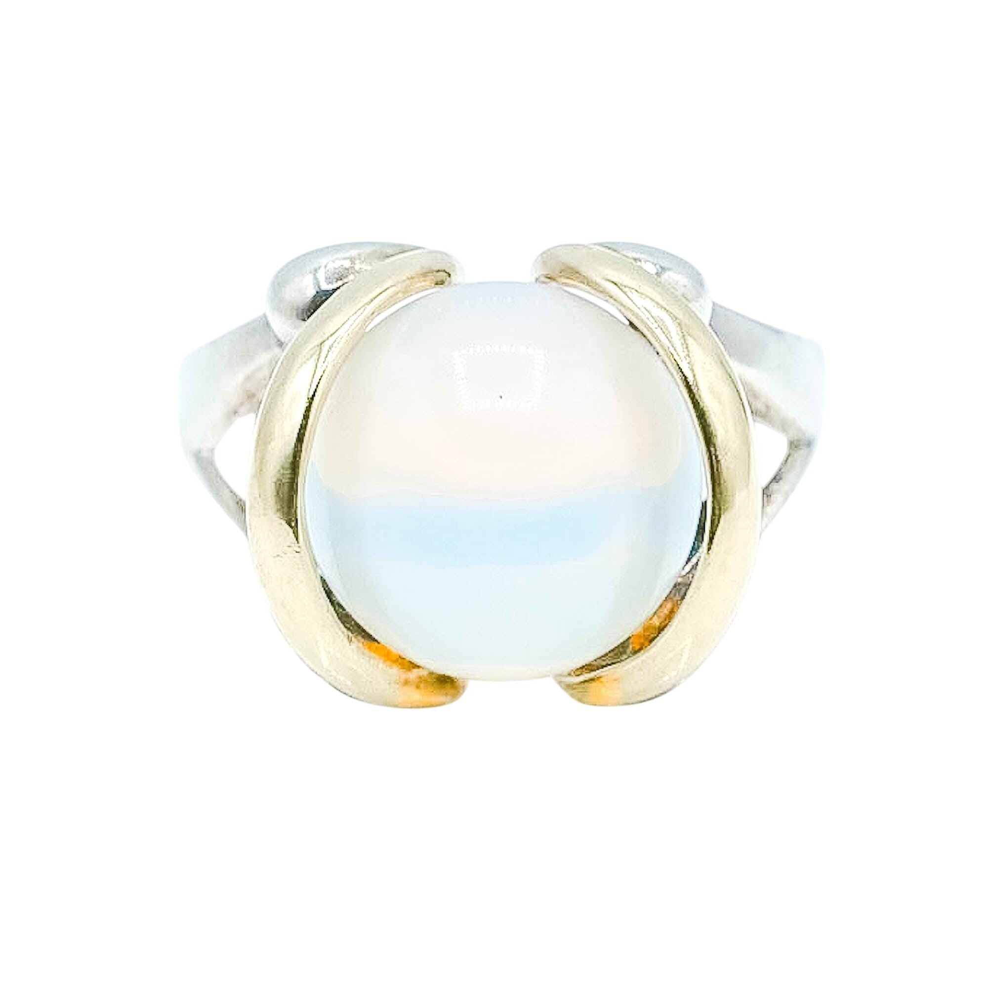 This ring’s unique open setting makes the glass ball removable, giving you the potential to swap out with other spheres of similar size for a personalized touch. The interplay between cool-toned sterling silver and rich gold accents elevates this piece into a standout collector’s item — perfect for lovers of rare, retro-inspired jewelry.