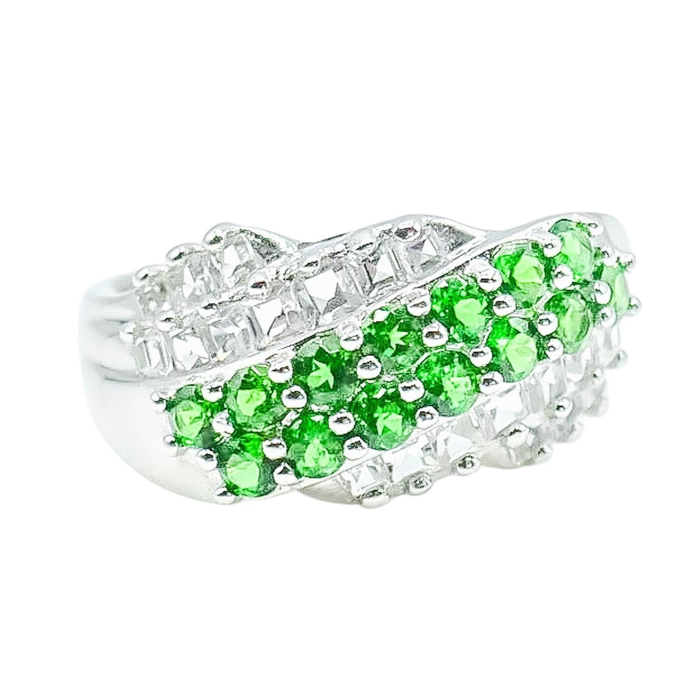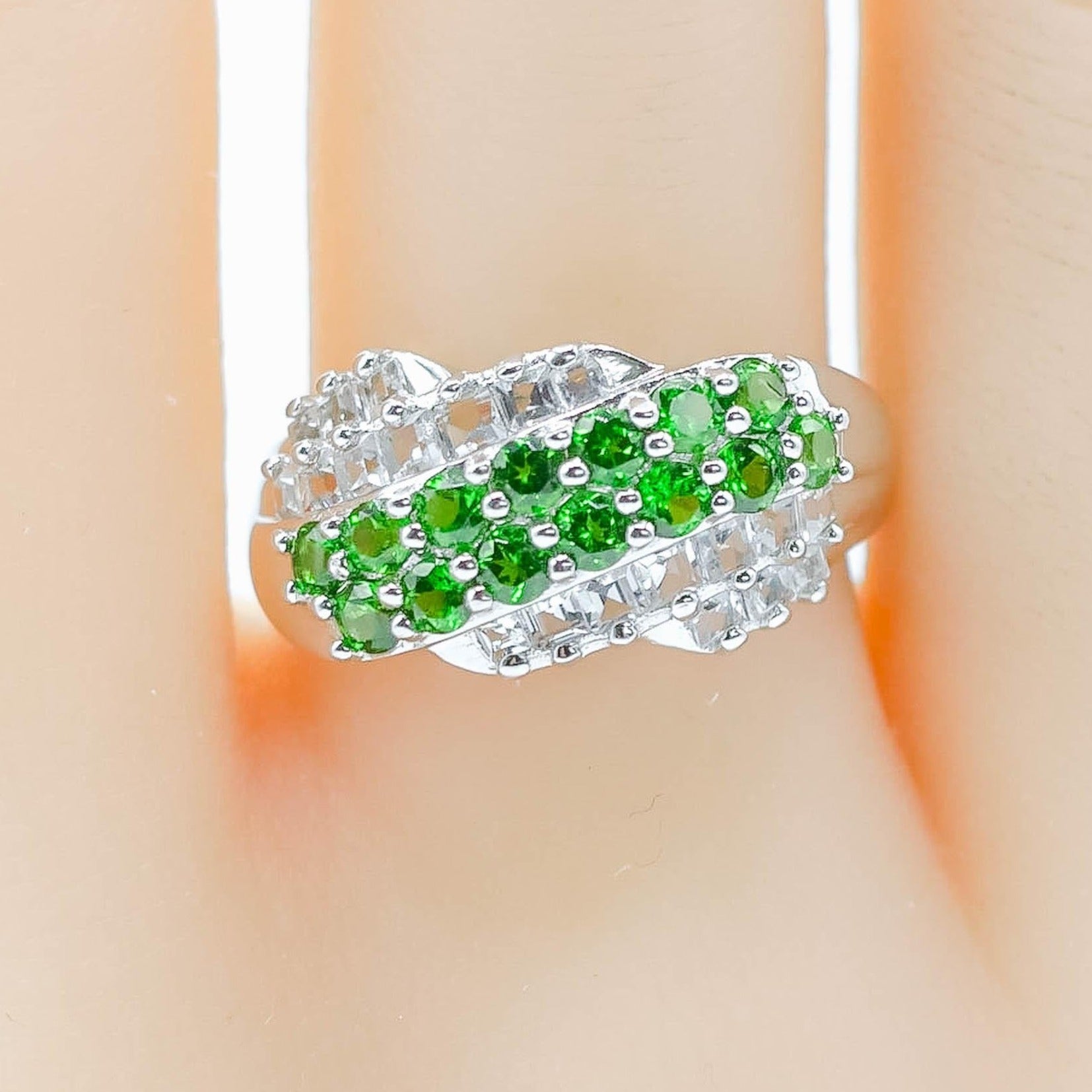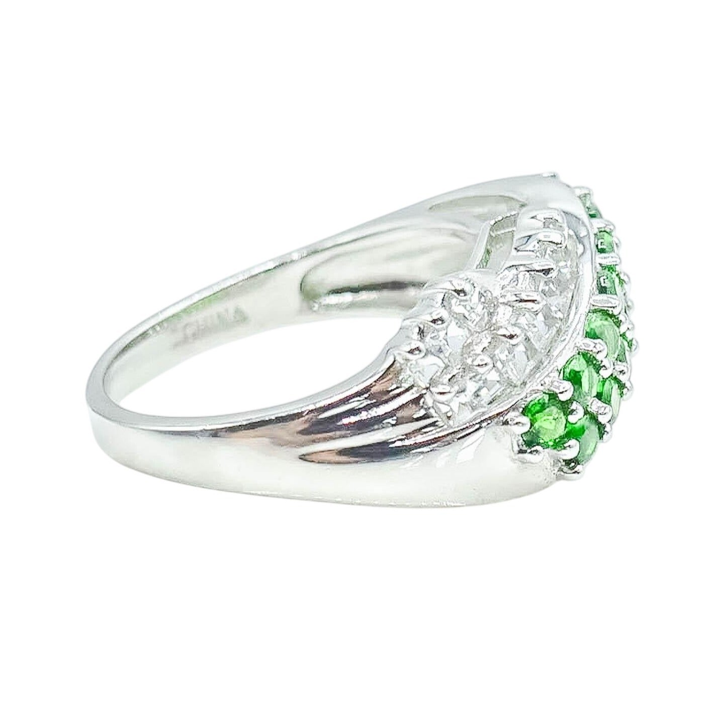 This sterling silver ring is adorned with vibrant synthetic emeralds and sparkling white zircon stones. The elegant design showcases expert craftsmanship, with prong-set gemstones creating a striking interplay of color and light. Perfectly sized at 8, it balances sophistication and charm, making it an exquisite addition to any jewelry collection.