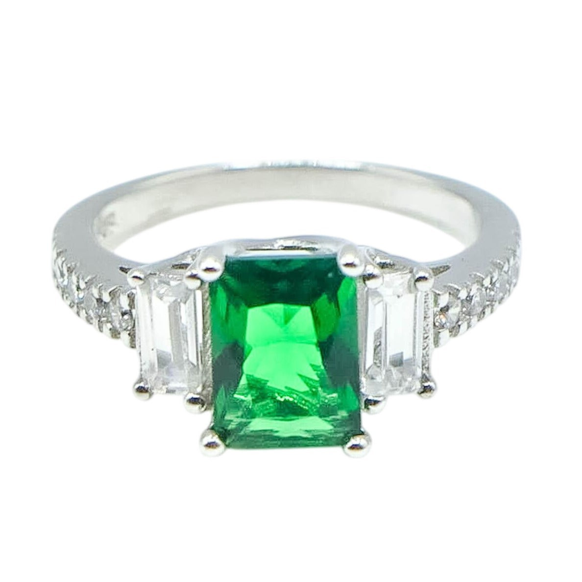 • Side Stones: White Cubic Zirconia (Emerald & Round Cuts)