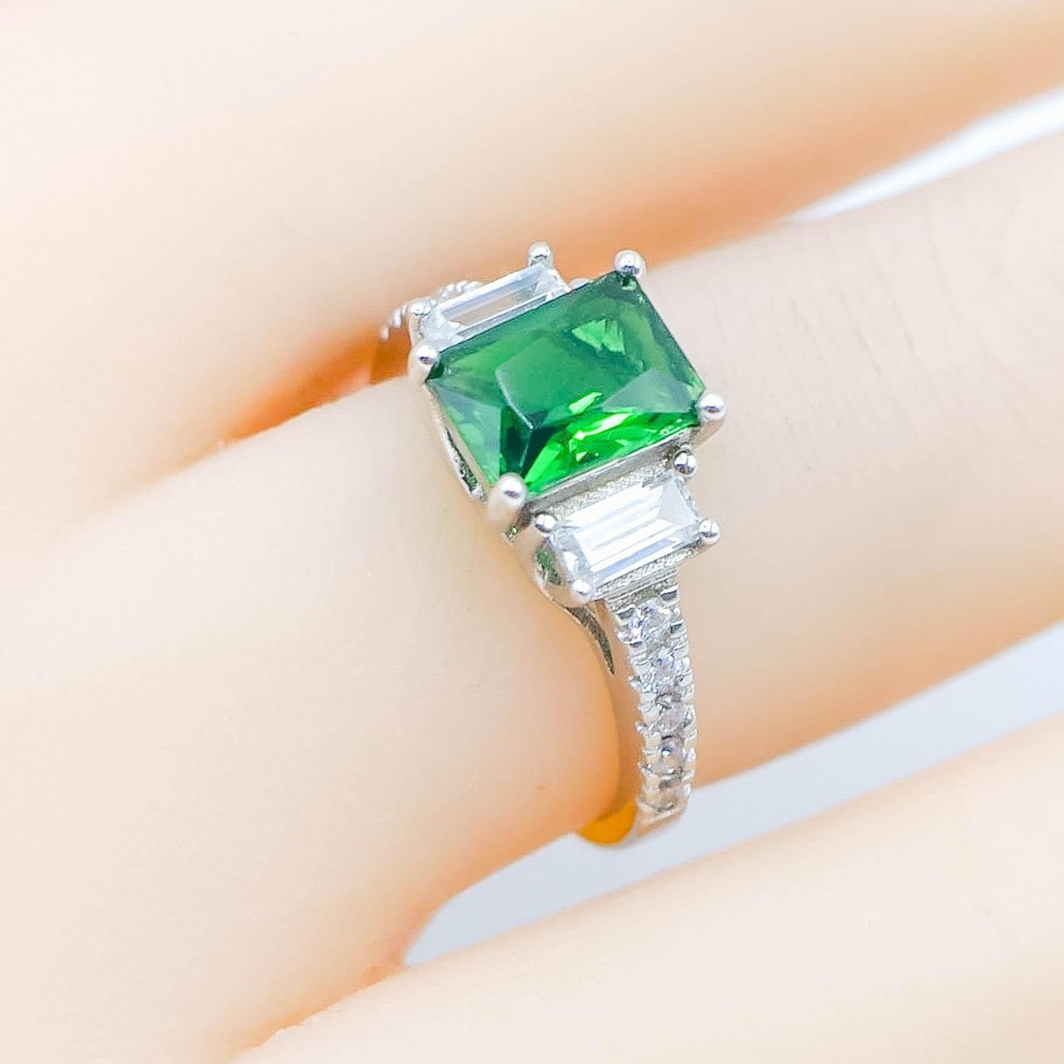 • Center Stone: Green Cubic Zirconia (Radiant Cut)