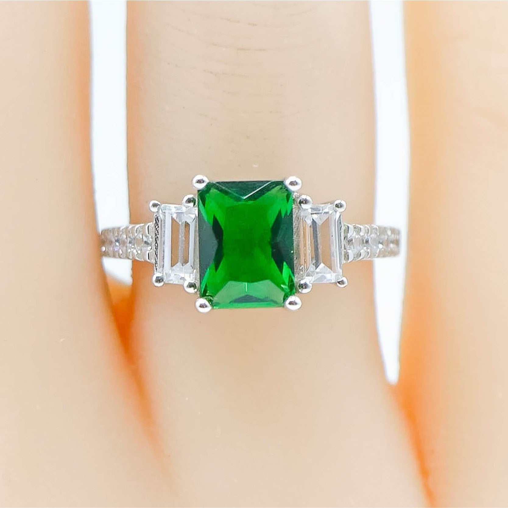 This elegant sterling silver Cubic Zirconia ring features a vibrant radiant-cut green Cubic Zirconia center stone, beautifully flanked by emerald-cut white Cubic Zirconia on each side. Additional round-cut CZ accents sparkle along the shank, creating a refined three-stone design with exceptional brilliance from every angle.