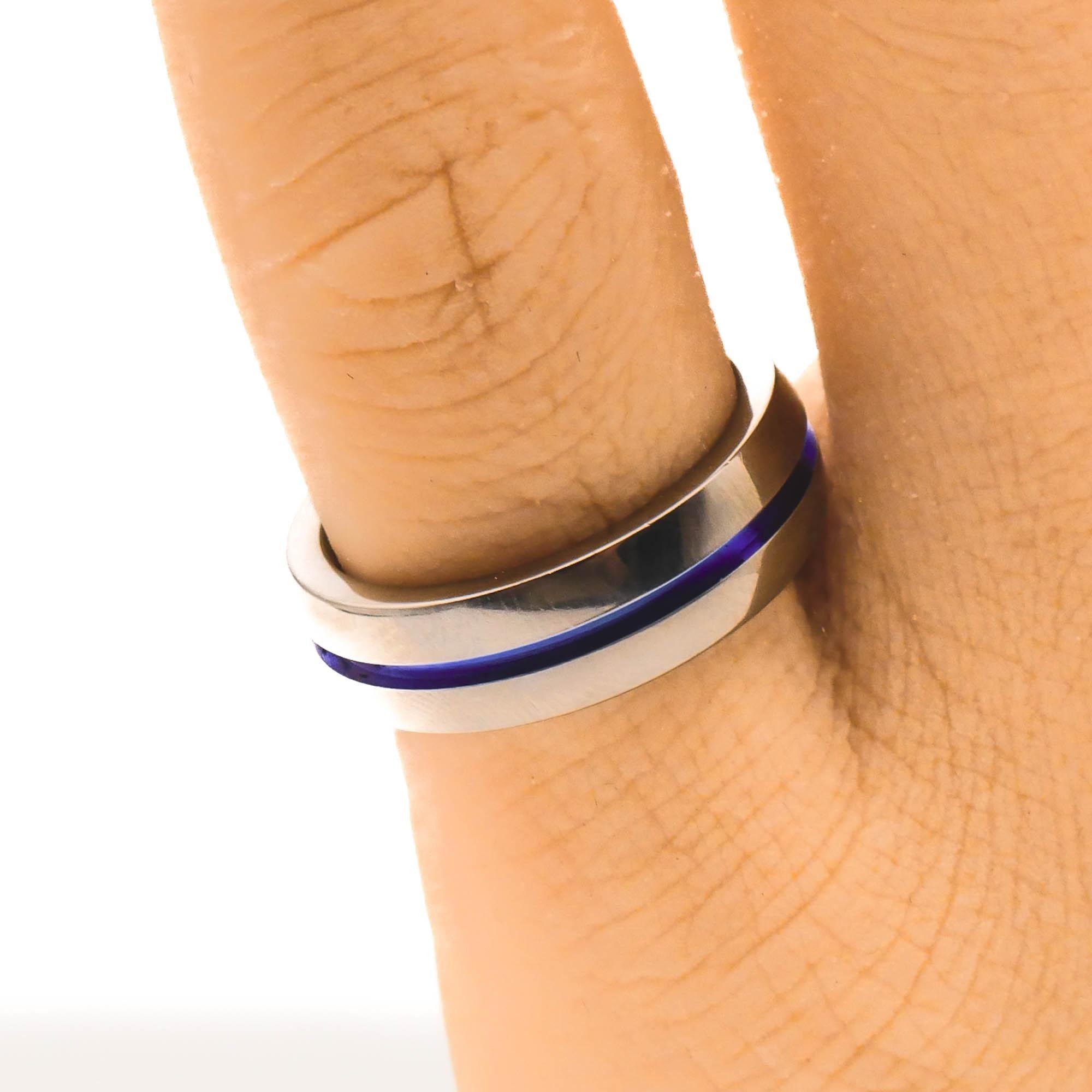 This Edward Mirell Titanium Blue Anodized Center Polished Women's Wedding Band is 6mm wide and a US size 7.5. Edward Mirell is known for his innovative design, creating long lasting, scratch resistant jewelry manufactured in the United States. Titanium is a great alternative to Gold or Silver due to its longevity and durability.