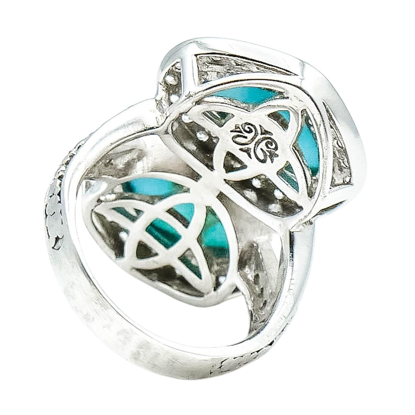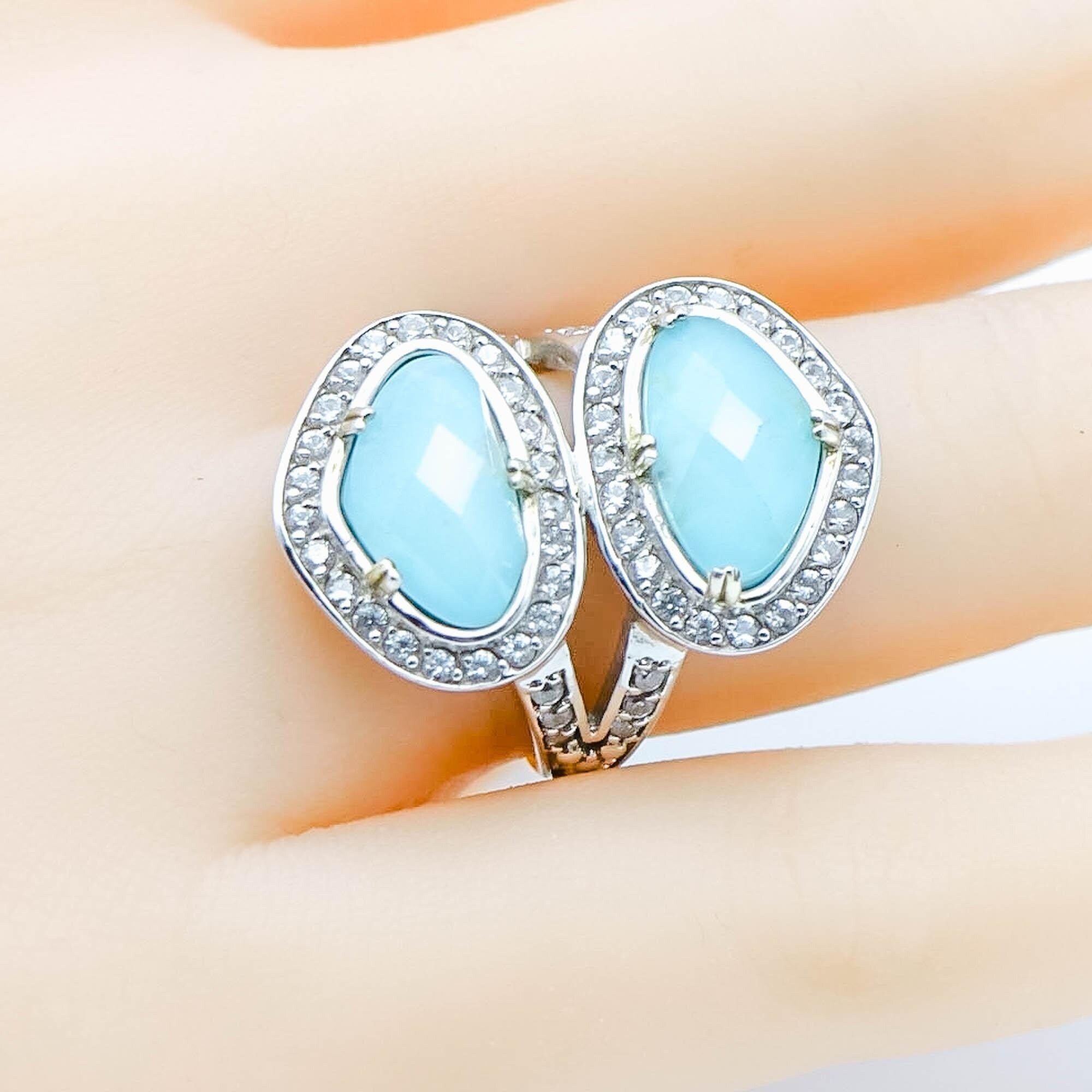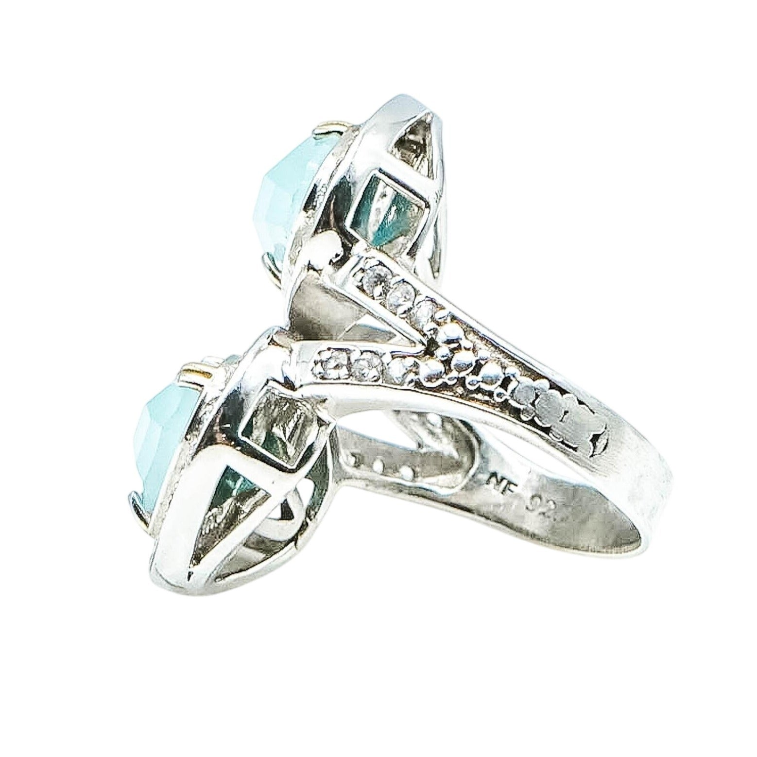 A luminous statement piece by JOYA from designer Judy Crowell, this ring features two stunning triangular checkerboard-cut aqua blue Moonstone doublets. Each gemstone is set in 14K Yellow Gold plated prongs and encircled by sparkling White Zircon halos. The split shank is adorned with additional White Zircon accents, and the comfort fit band ensures wearability with elegance.