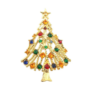 Vintage Gold Tone Christmas Tree Brooch With Rhinestone Ornaments and Star Topper