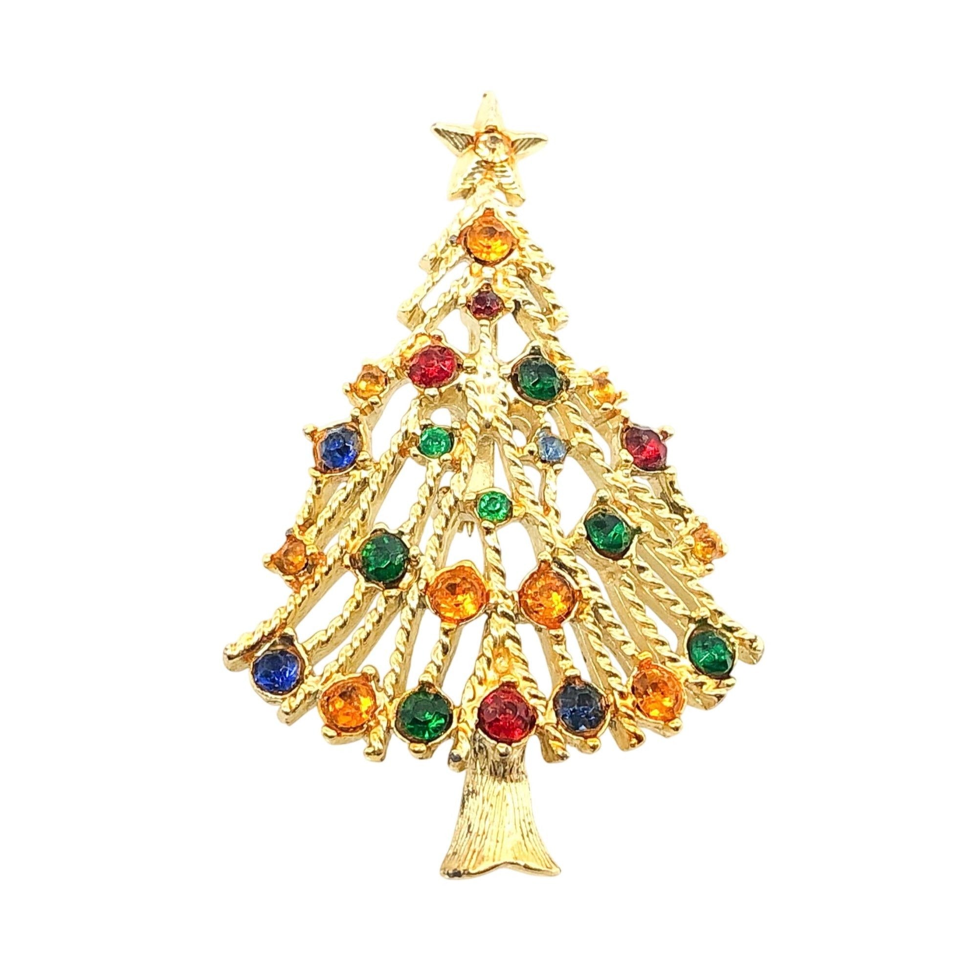 Vintage Gold Tone Christmas Tree Brooch With Rhinestone Ornaments and Star Topper.