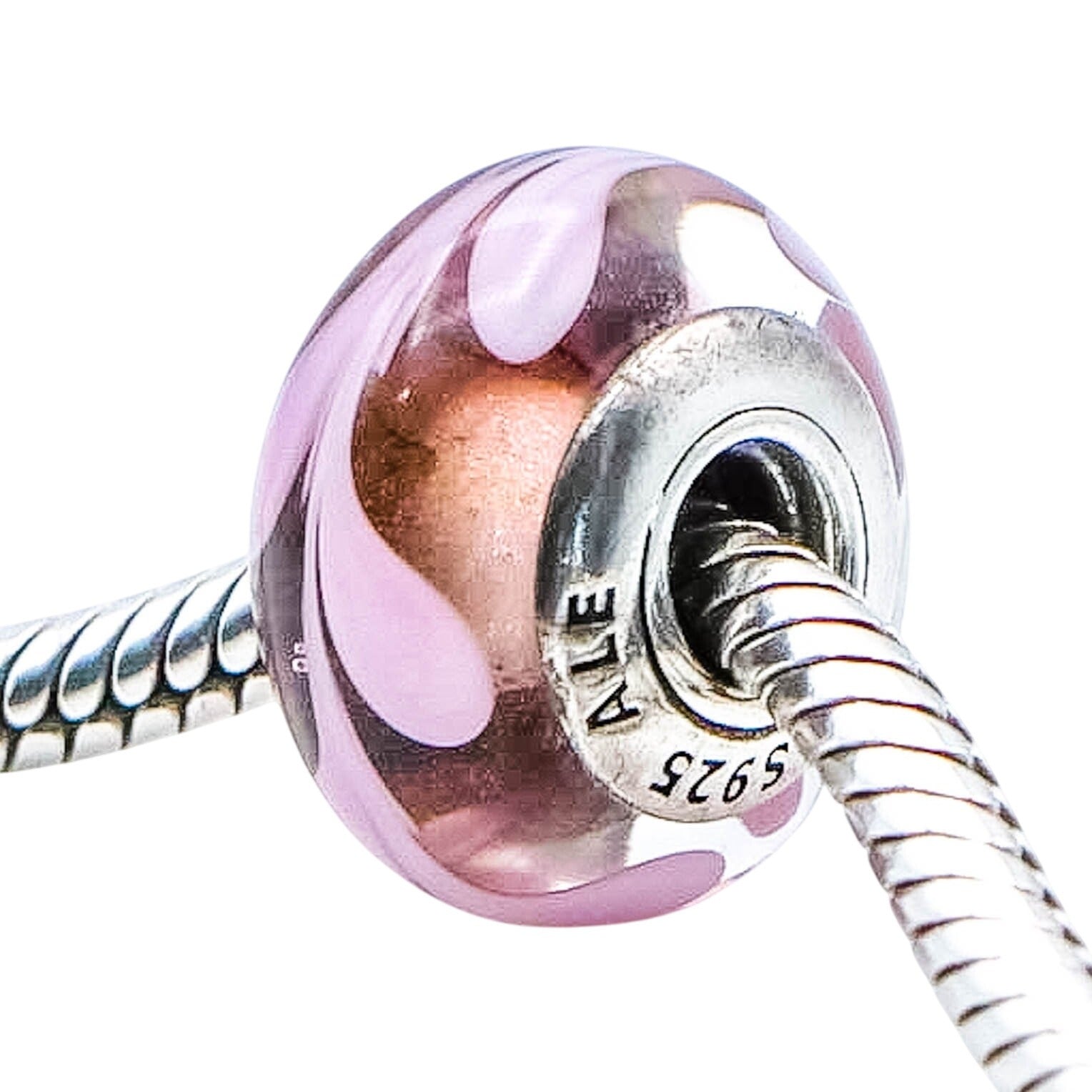 Authentic PANDORA Purple And Pink Swirl Murano Glass Sterling Silver Charm 790677 - Retired. A beautiful transparent purple Murano with light pink swirls make a statement on any bracelet.