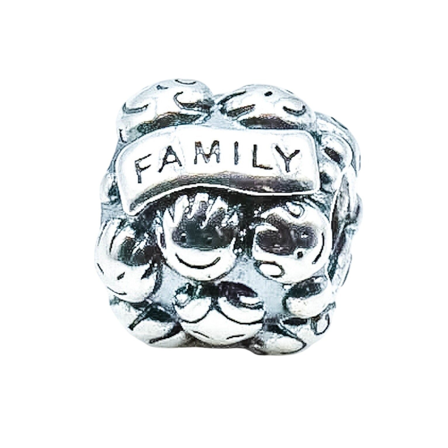 Authentic PANDORA Love & Family Sterling Silver Charm 791039 - Retired. Beautifully detailed smiling faces and the engraving "love" on one side and "family" on the other, makes this Sterling Silver charm a great family gift