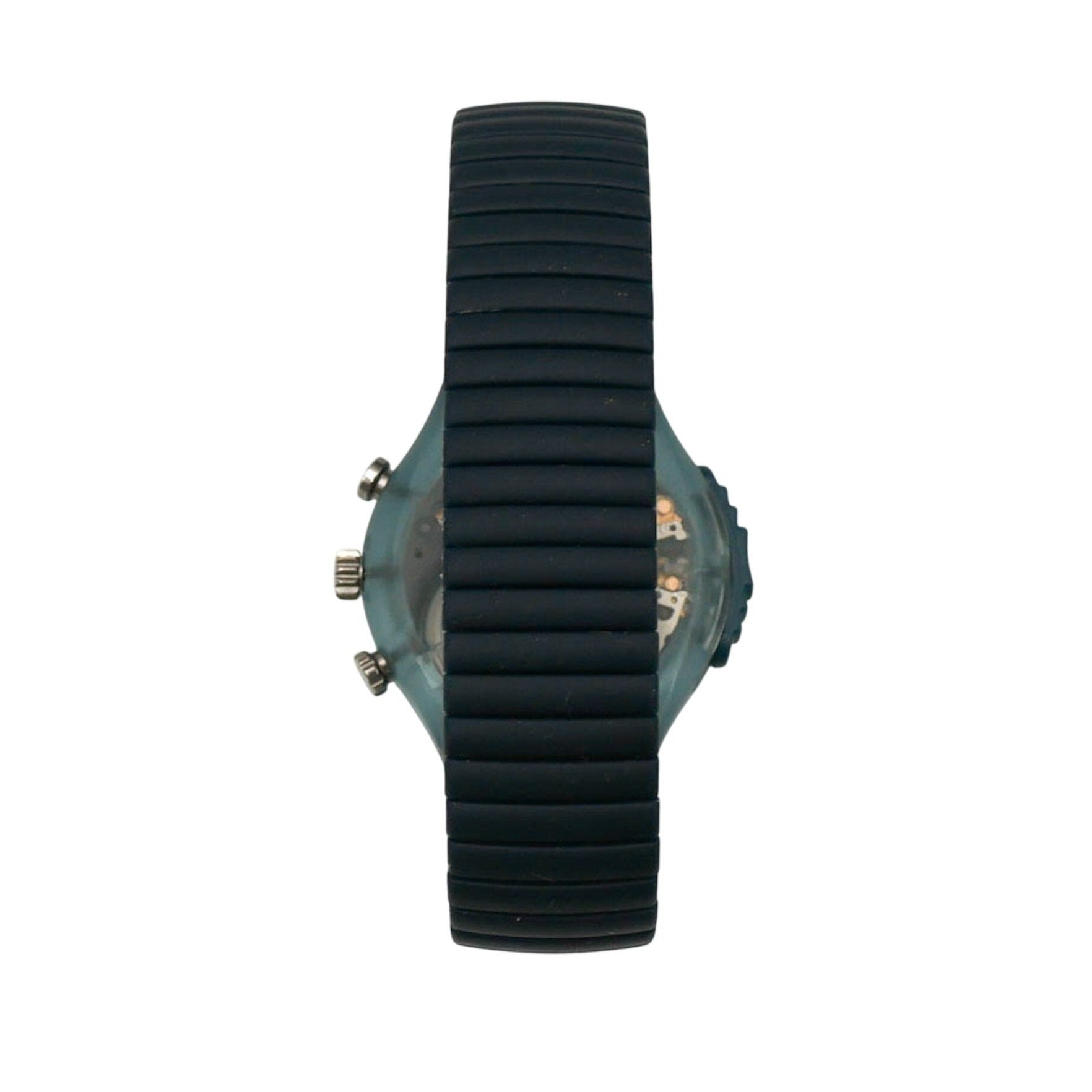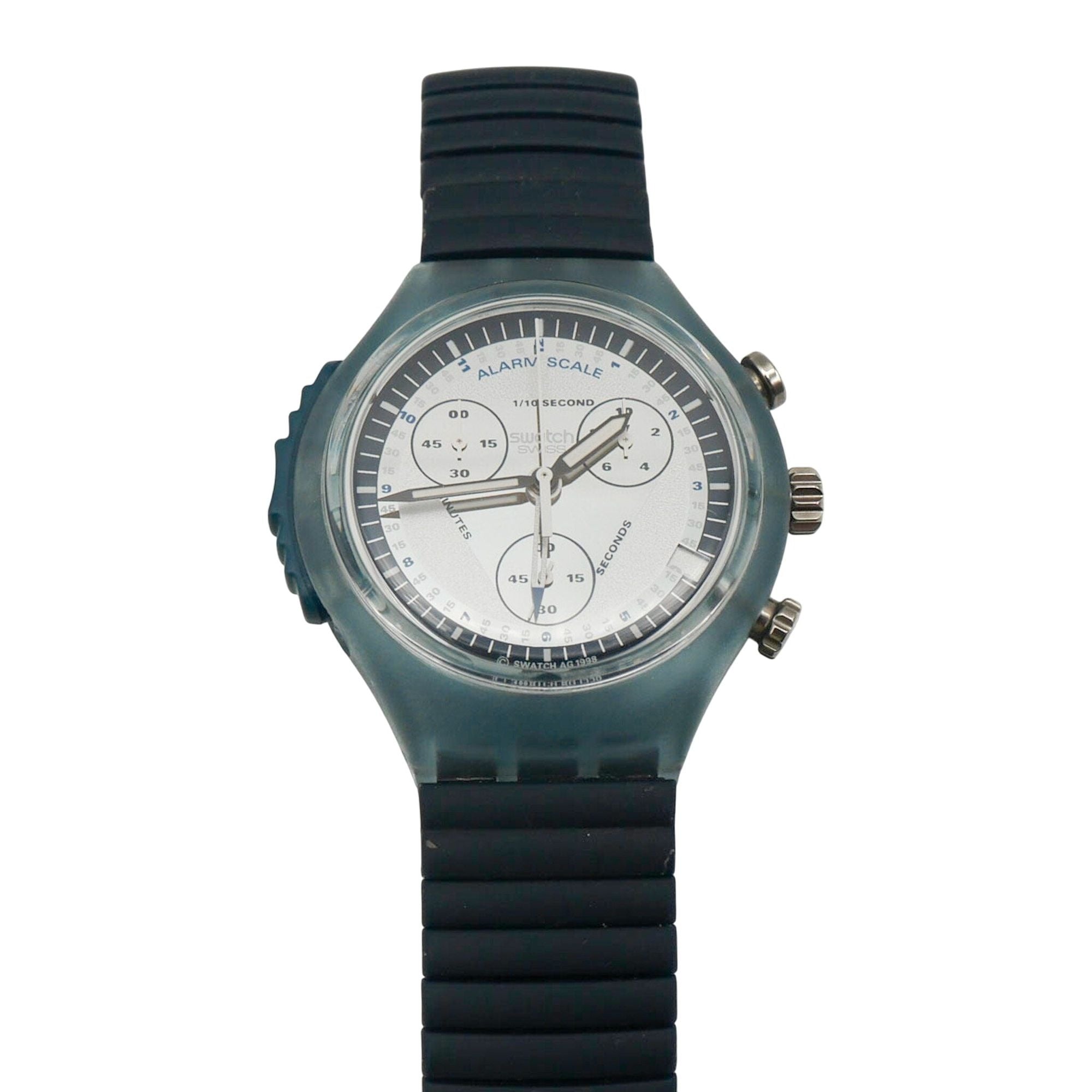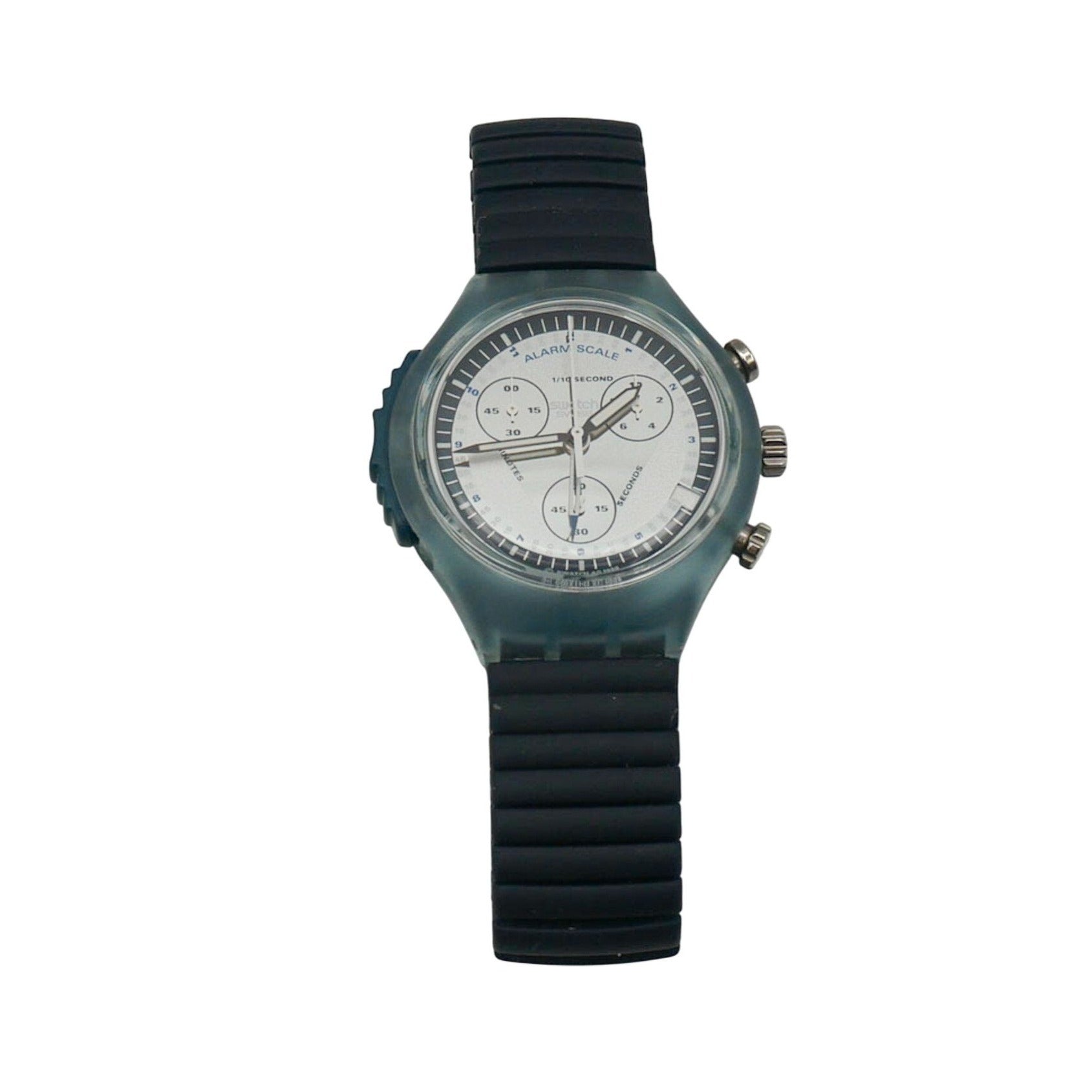 Authentic 1998 Swatch Alarm Chrono Backbord SON402 with small strap (fits wrist up to 7 Inches). The Swatch Chrono Backbord is classic in light and dark blue. It is one of the first watches produced in the Swatch Alarm Chrono series. On the silver dial is a dark silver mirrored triangle and reflective hands indicate the time. The beautiful chronograph has a date display at the 4 o'clock position. A blue flexible metal strap, which adapts perfectly to the arm, completes the design. The water-resistant watch has a stopwatch function, an alarm function and an accurate ETA quartz movement with a battery.