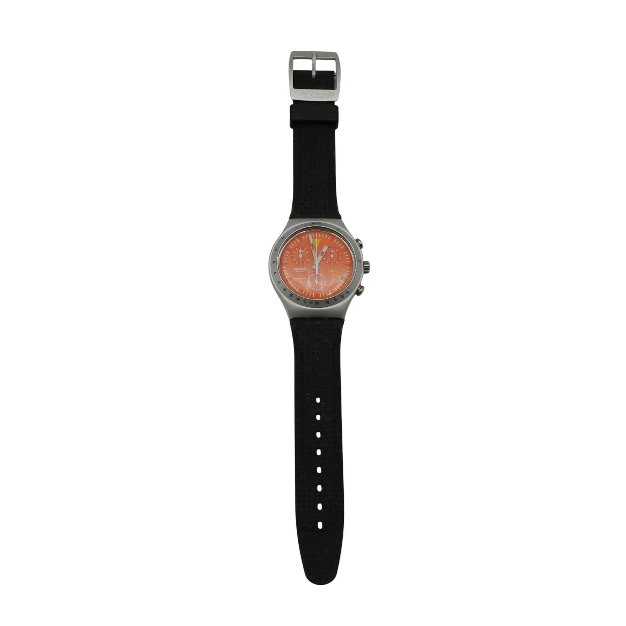 Authentic Swatch ARANCIA INFOCATA Swatch Irony Chrono (YCS4029) Watch. The Swatch Irony Chrono ARANCIA INFOCATA is a very rare watch from the Irony series. On the orange dial are white numbers and silver and white hands indicate the time. The beautiful chronograph has a date display at the 4 o'clock position. An aluminum case with a silver colored bezel and a black soft silicone strap, which adapts perfectly to the arm, completes the design. The water-resistant watch is driven by an accurate quartz movement with a battery. Watch looks like new and works great.