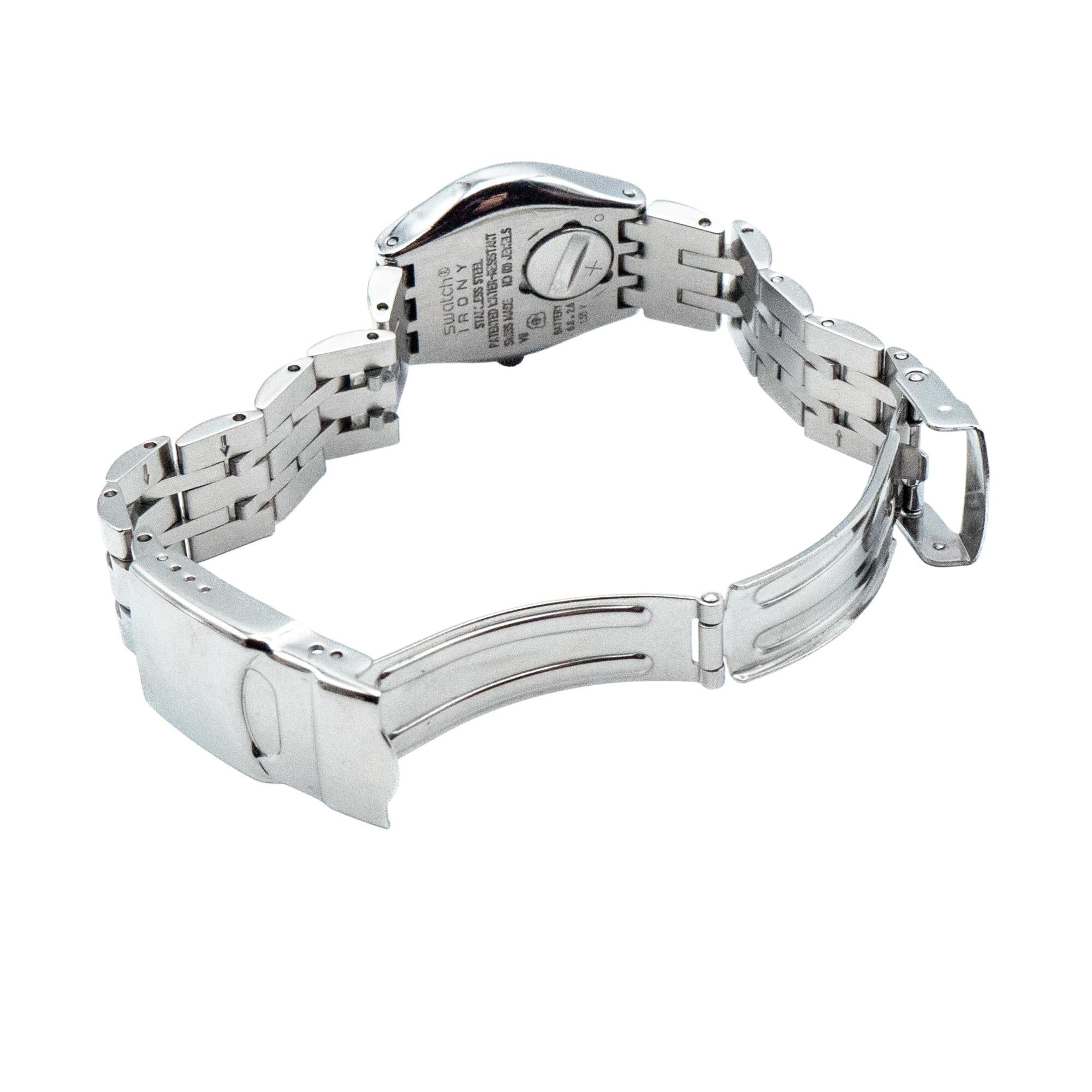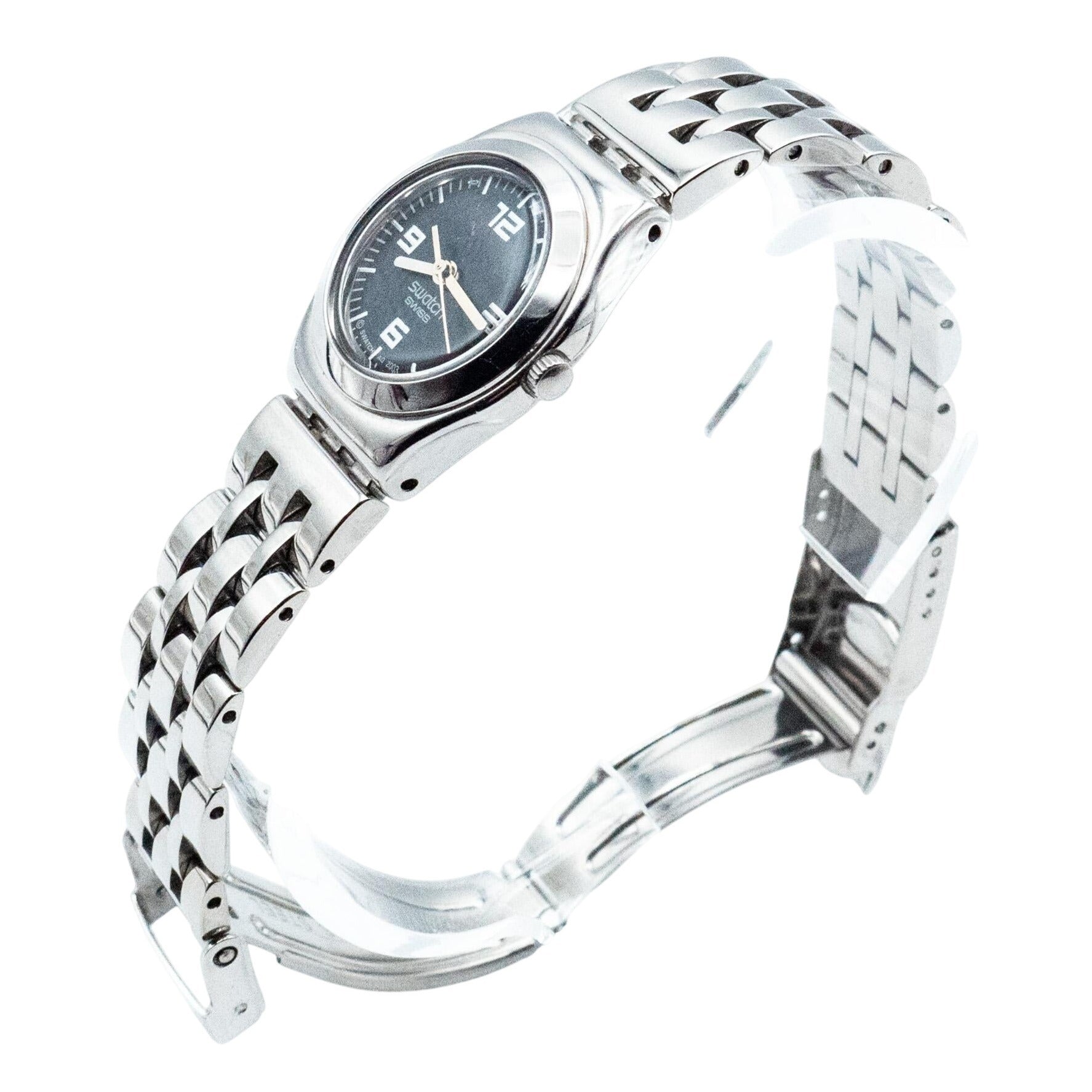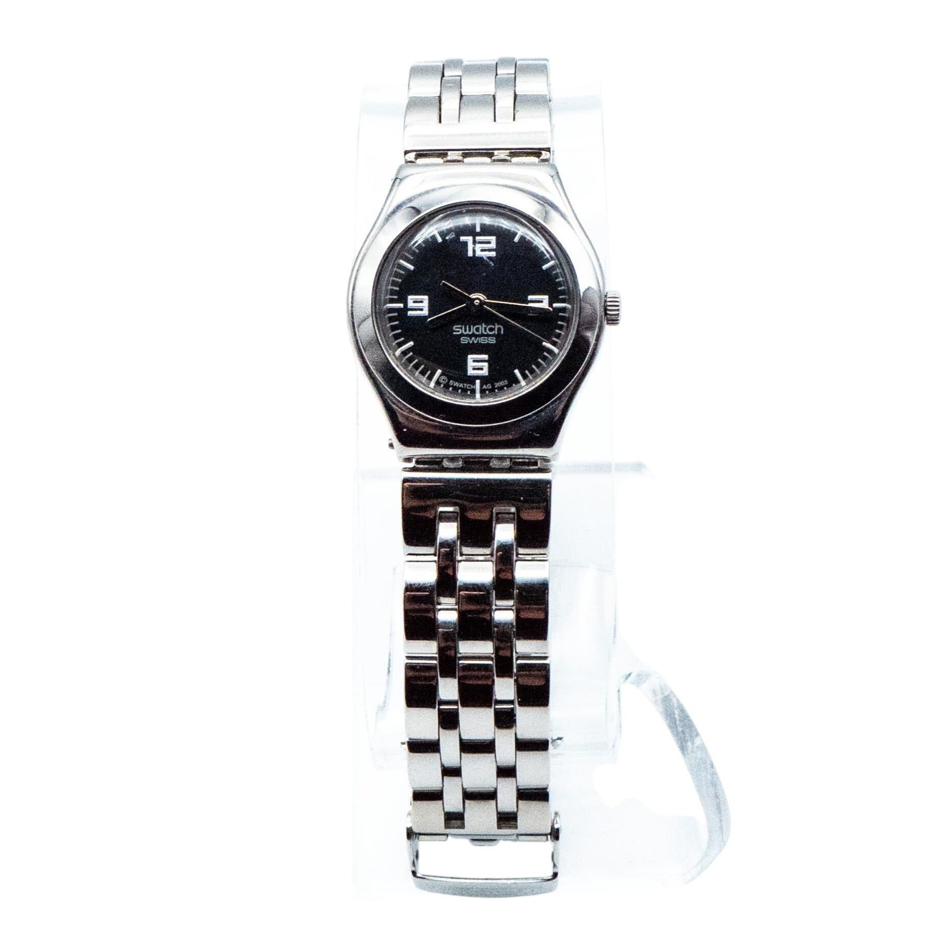 Authentic 2004 Swatch Irony Lady Pick Me Up Watch YSS175G. The Swatch Irony Lady Pick Me Up is a women's classic watch. The polished stainless steel bracelet can be adjusted to size. The 25mm stainless steel case has a black dial with index markers and Arabic numerals in silver. The hands are silver colored. This waterproof watch comes with an accurate ETA quartz movement and a battery.