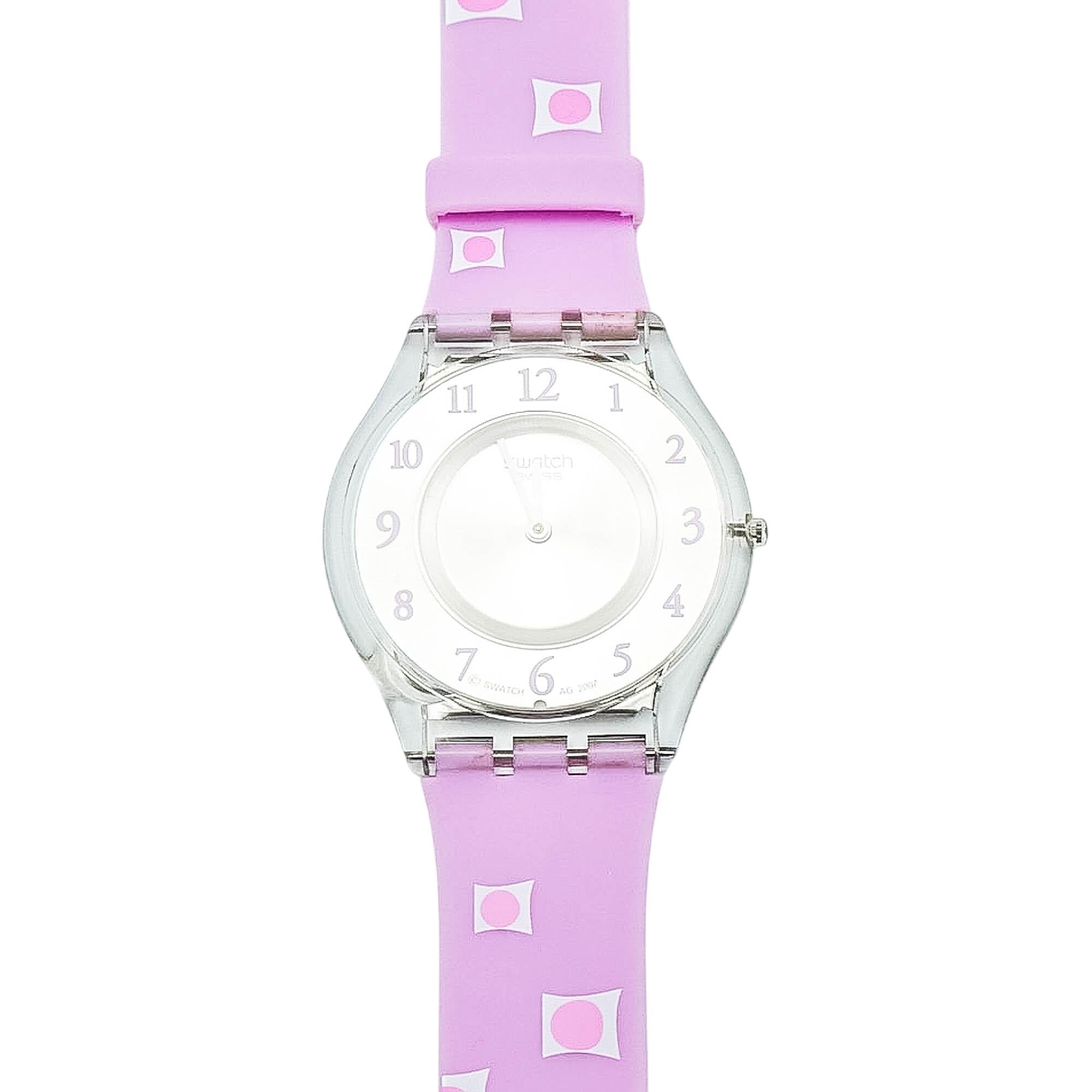 From the world’s thinnest watch series, this Swatch Skin Marble Time features a sleek transparent case, silver dial with pink numerals, and a soft pink rubber strap with abstract flag designs.