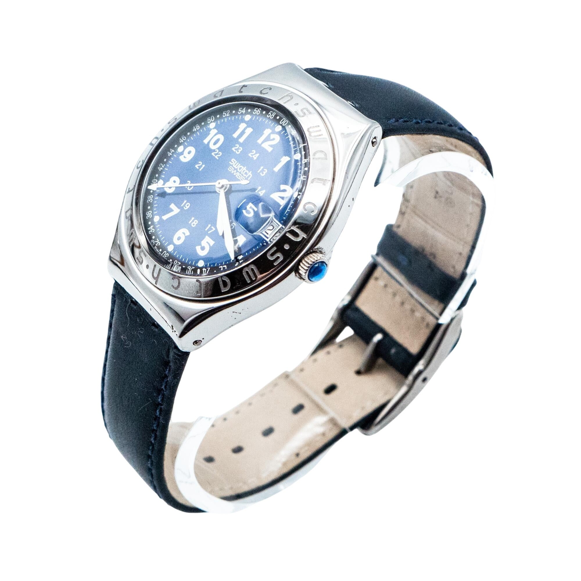 Authentic 1994 Swatch Irony Big Happy Joe Blue Watch YGS400 in excellent condition. The Swatch Irony Big Happy Joe Blue is a men's watch with a classic design. The black leather strap has a leather loop and stainless steel pin buckle. The 37mm stainless steel case features a dark blue dial with silver Arabic numerals marking the hours, minutes and seconds. The water-resistant watch has an accurate quartz movement with a battery, luminescent hands and a date function at the 3 o'clock position.