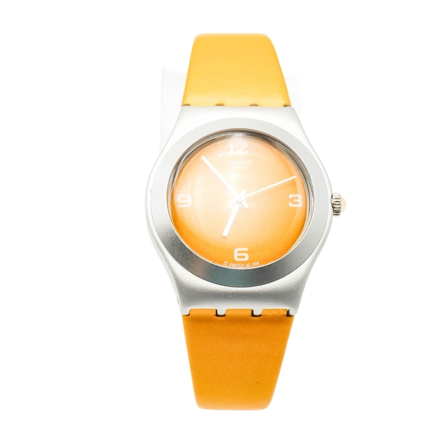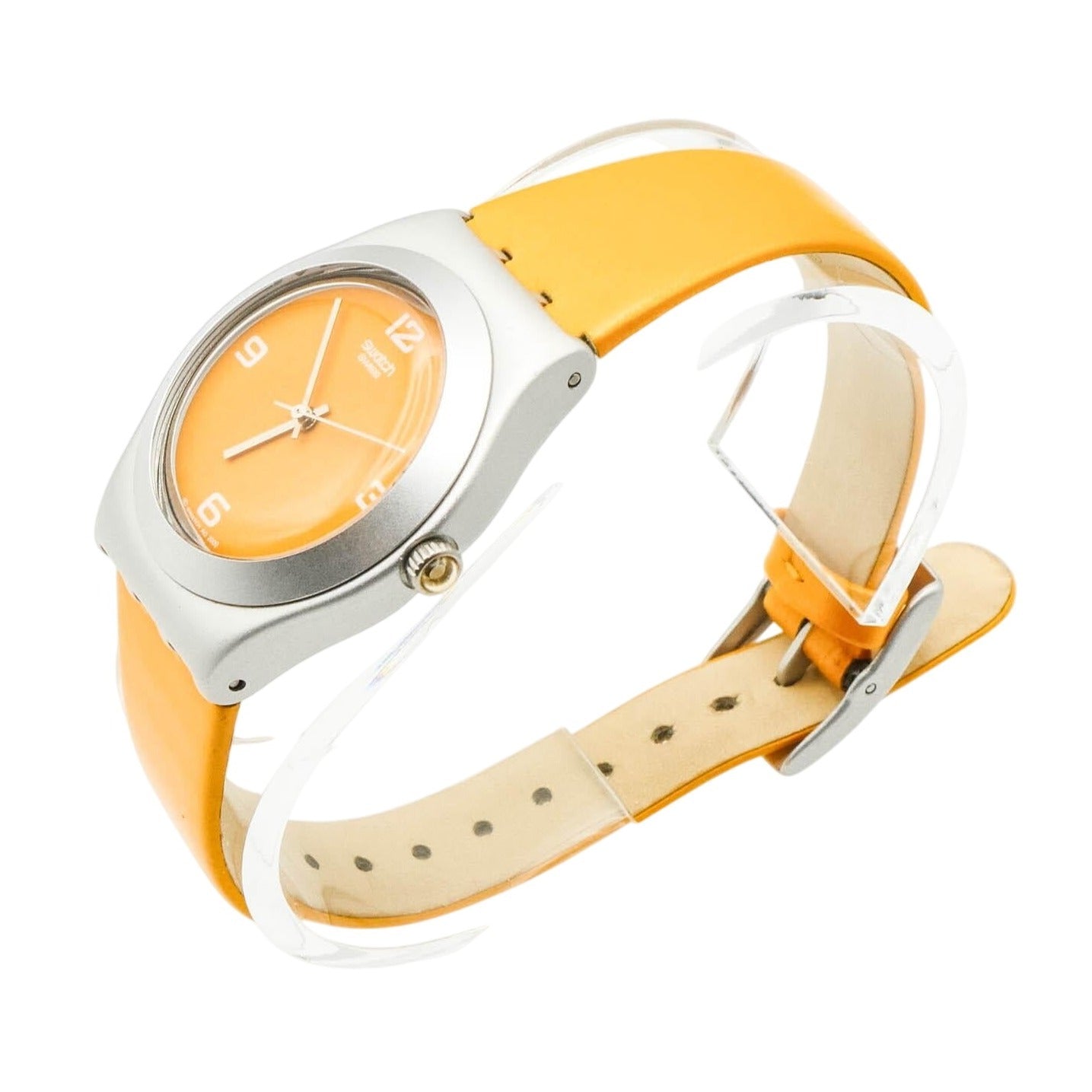 Authentic 2000 Swatch Irony Medium Falling Star Orange Watch YLS1013 in excellent condition. The Swatch Irony Medium Falling Star Orange is a vintage ladies' swatch. It has an orange leather strap and an aluminum case and features an orange dial with white numbers and silver hands. This waterproof watch has an accurate ETA quartz movement with battery.