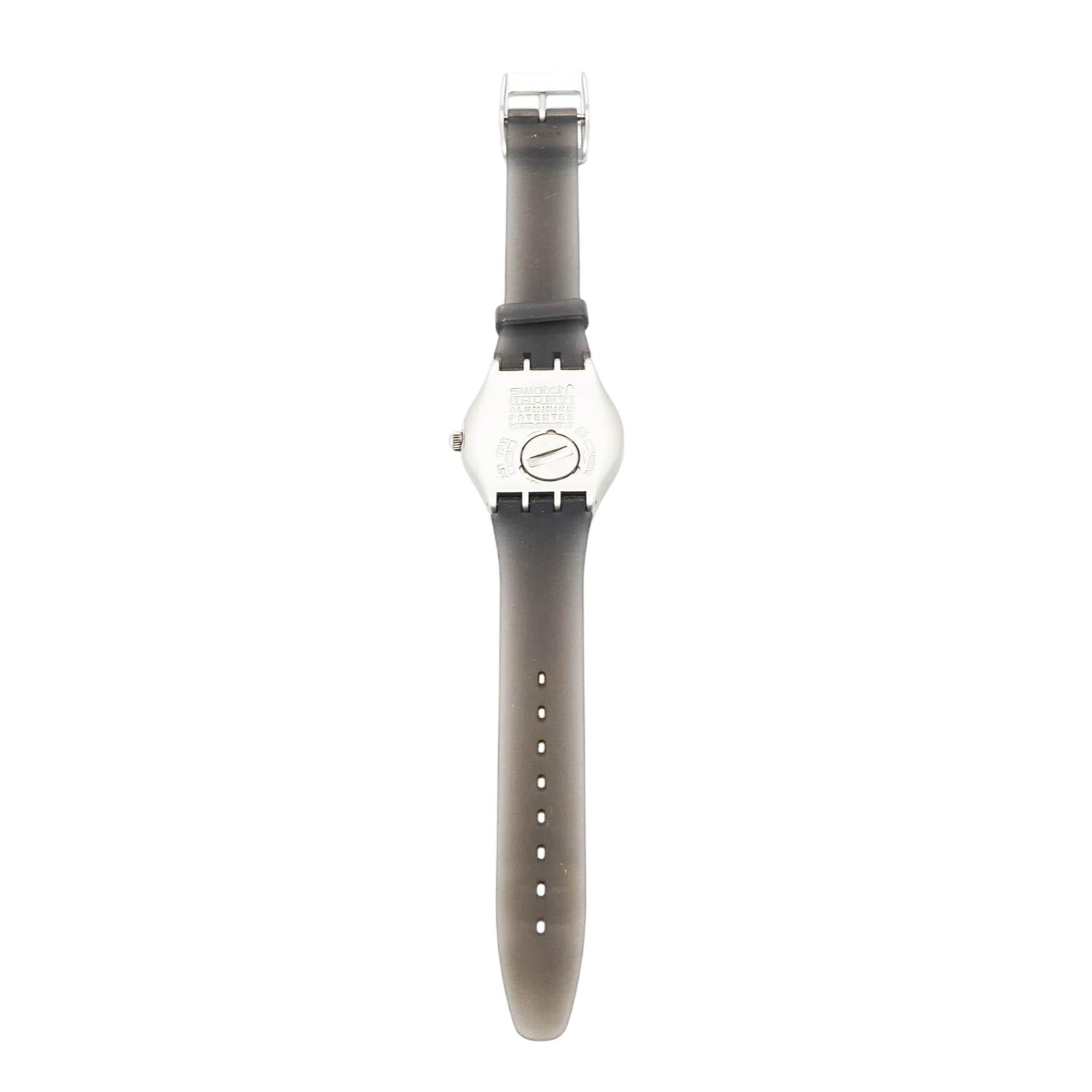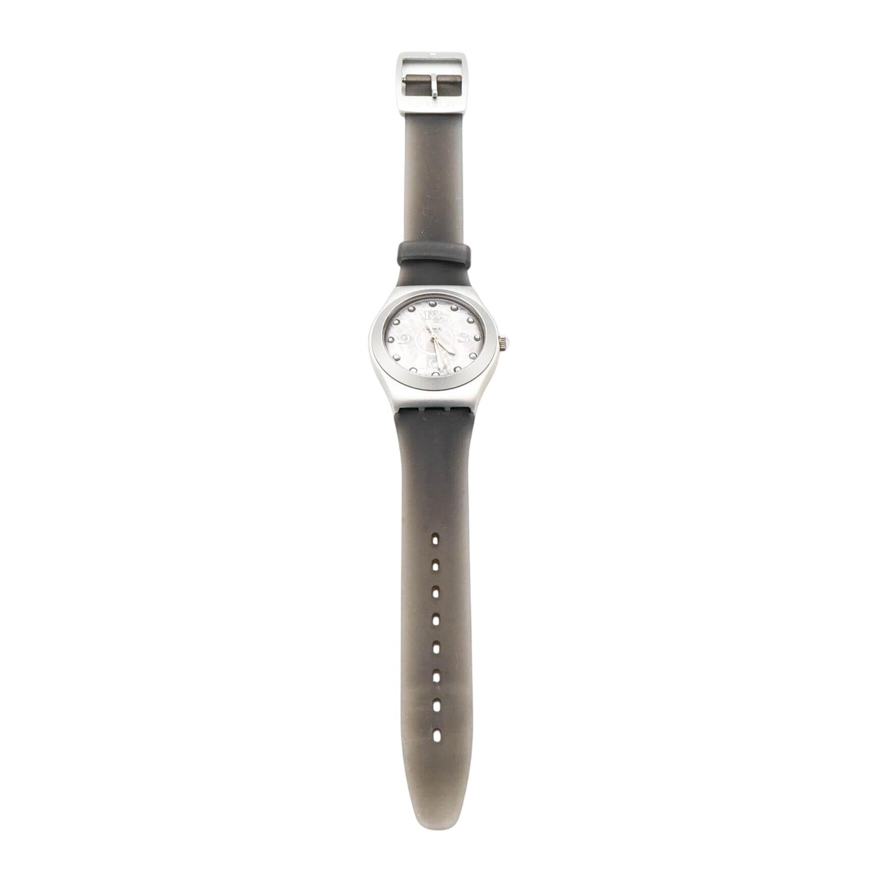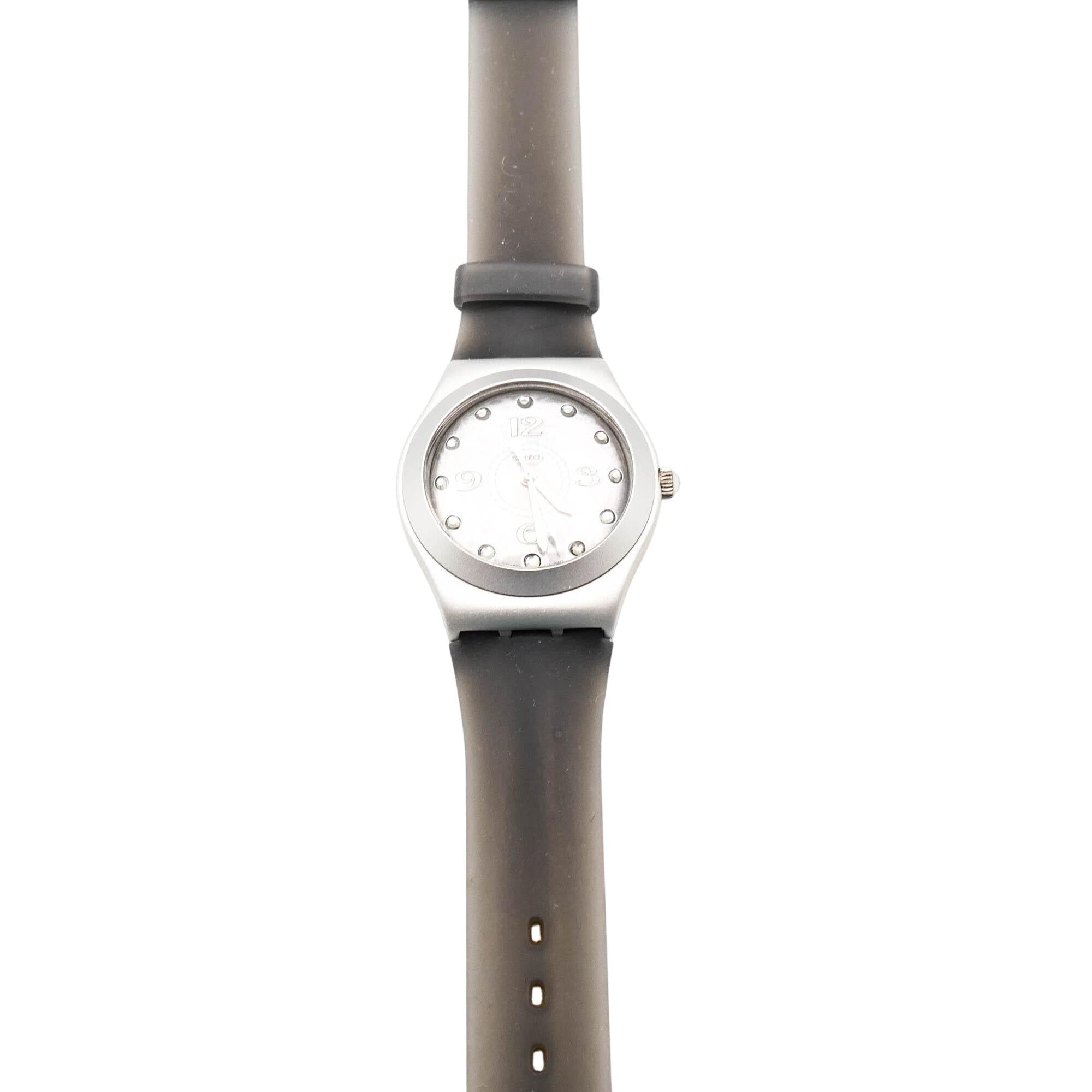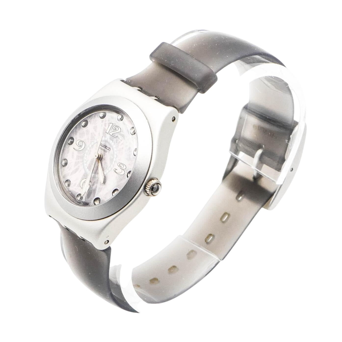 Authentic 2002 Swatch Irony Medium Sparkling Night Watch YLS1020. The Swatch Irony Medium Sparkling Night watch is a classic ladies' watch. It features a transparent grey rubber band, an aluminum case and a grey dial with clear crystals positioned where the numbers would be. It does show the arabic numerals 12, 3, 6, and 9. This waterproof watch has an accurate ETA quartz movement with battery.