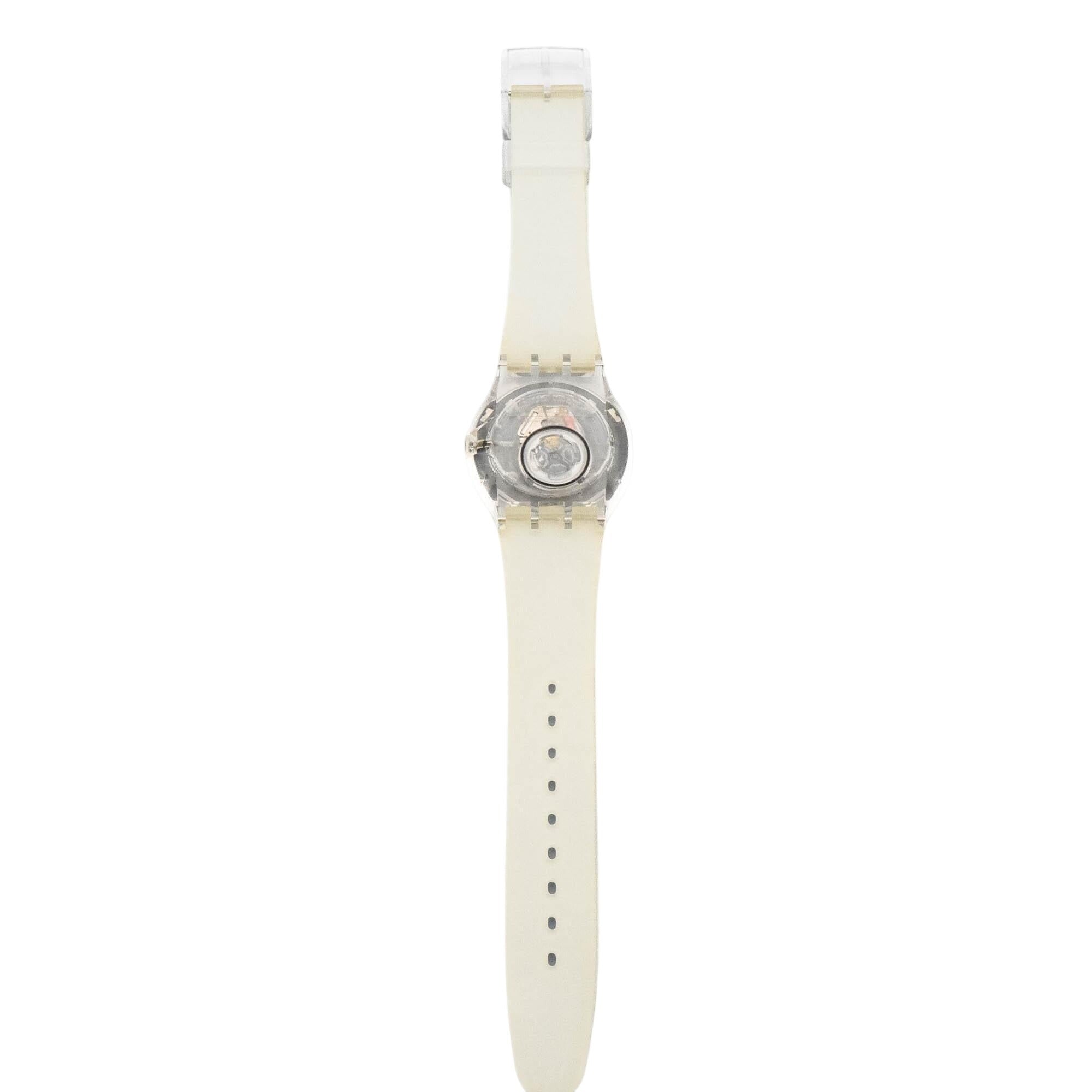 The 38mm clear plastic case complements the clear pin buckle and loop, maintaining the clean, minimal Jelly in Jelly aesthetic — designed for comfort, with no metal touching the skin. It’s lightweight, skin-safe, and powered by a precise Swiss quartz movement with a fresh battery installed.