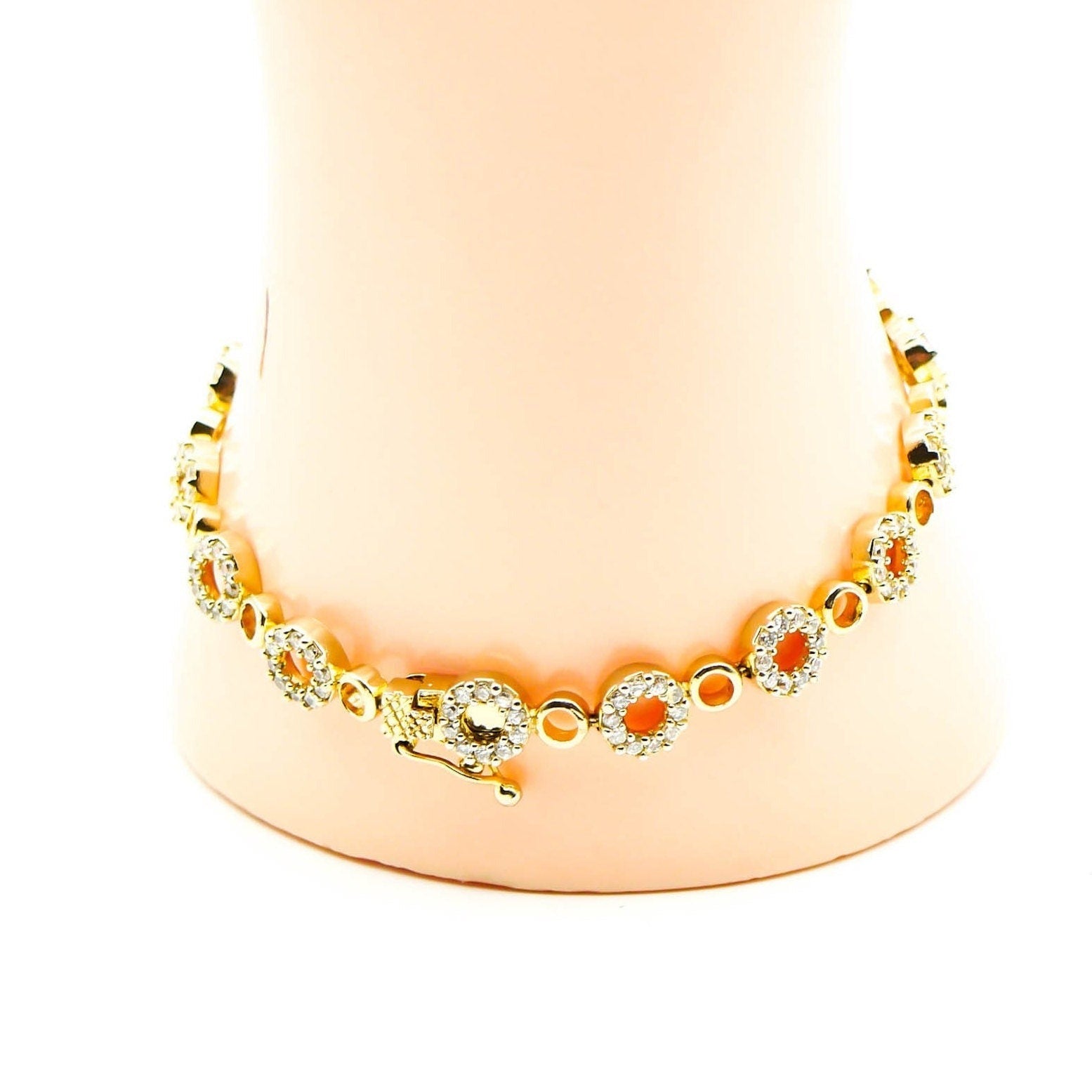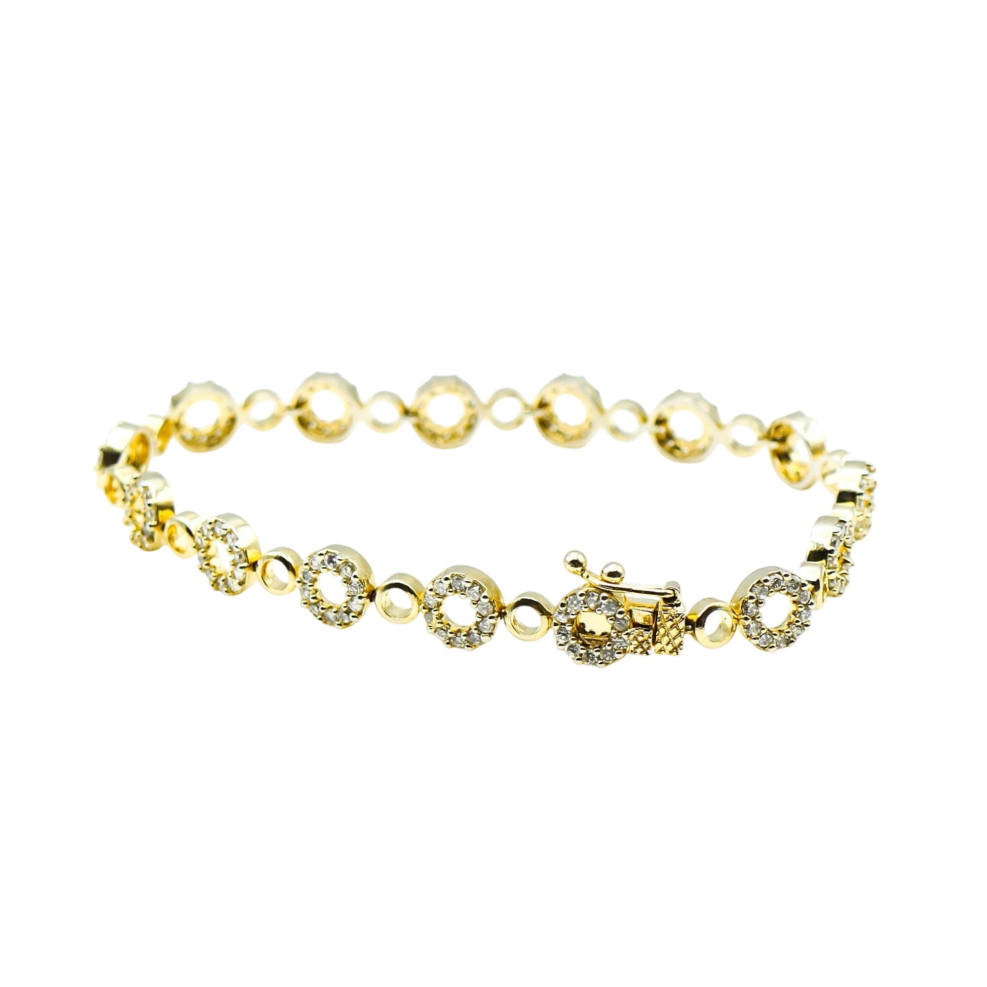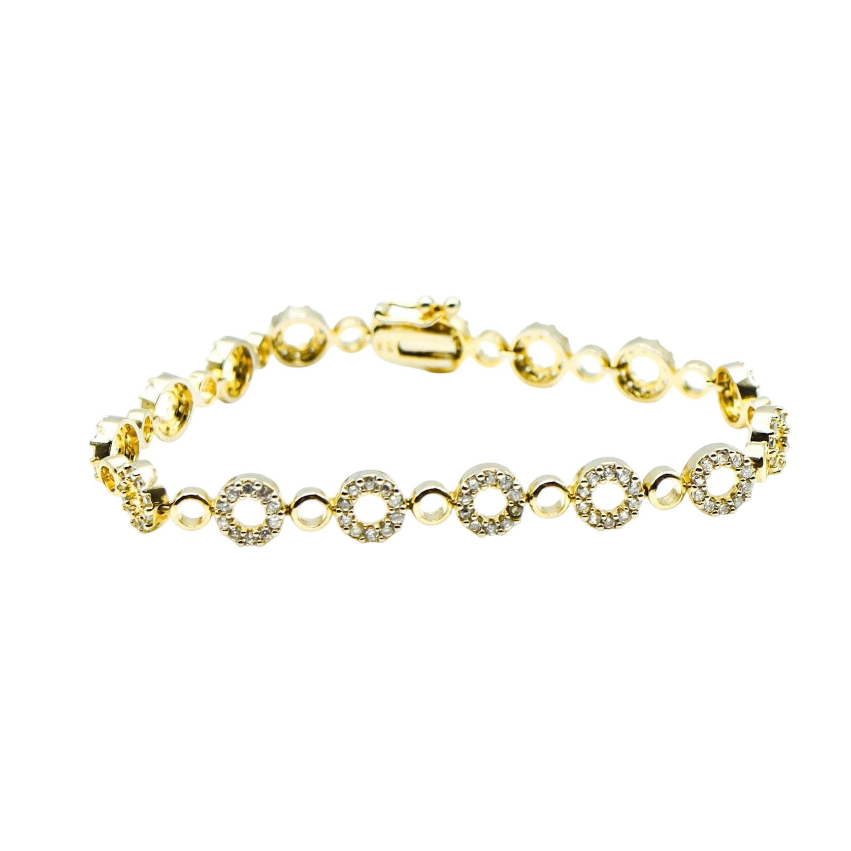 Add a touch of timeless elegance to your collection with this Infinity Tennis Bracelet, crafted in 14K Yellow Gold plated Sterling Silver. The design alternates between polished golden circular links and pavé-set Cubic Zirconia links that sparkle with every move. It secures with a tongue-and-groove clasp and safety latch for both beauty and peace of mind.