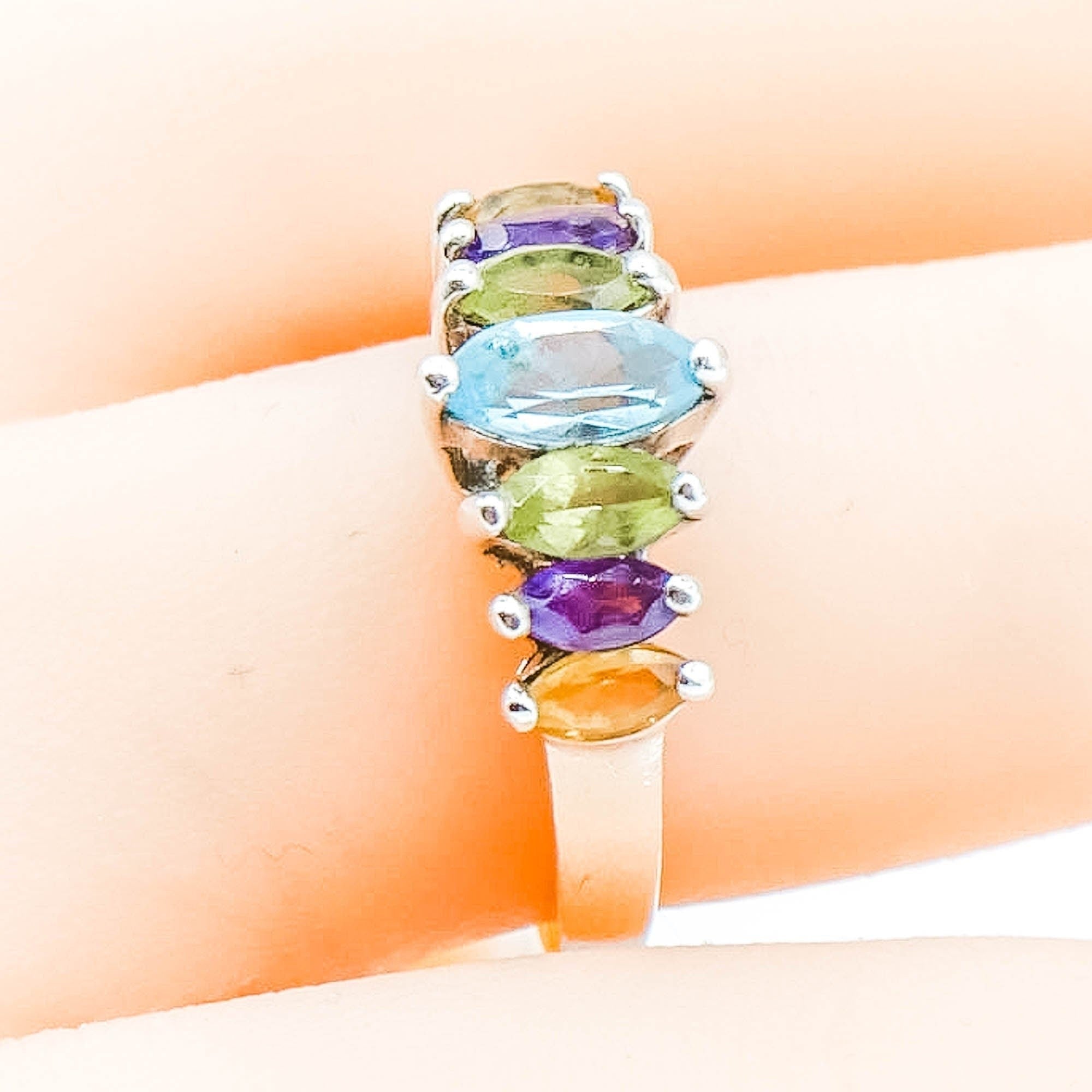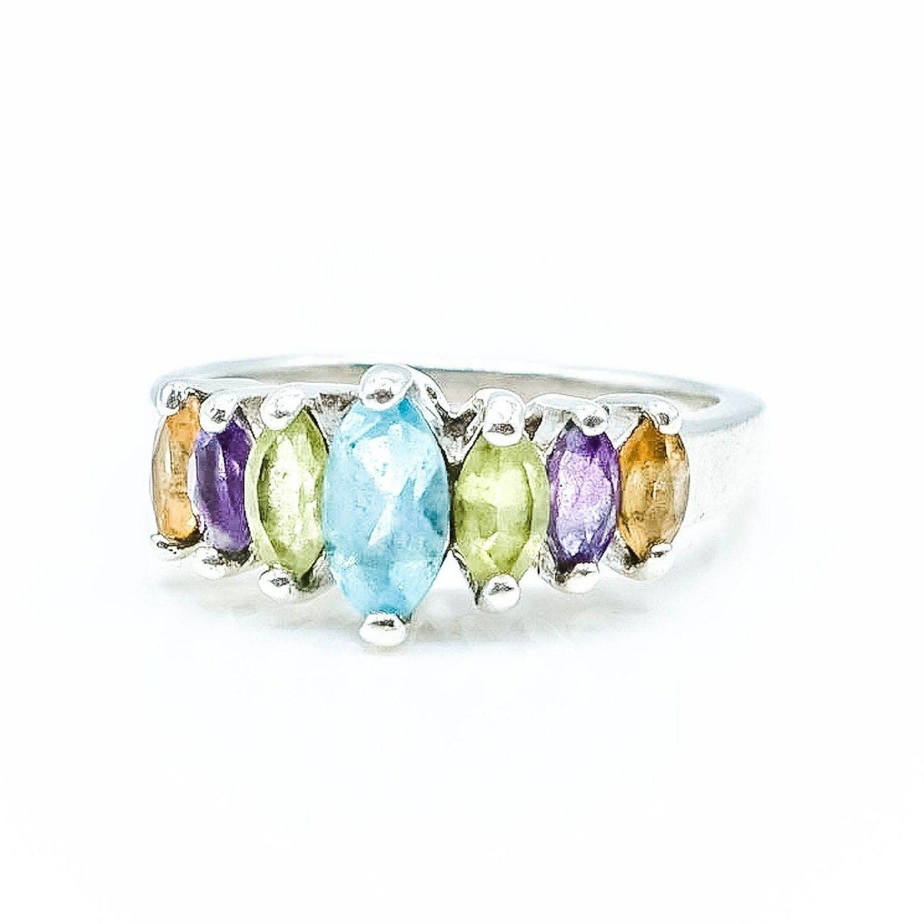 Colorful and elegant, this sterling silver ring features a vibrant arrangement of seven marquise-cut gemstones in a beautifully balanced design. Showcasing amethyst, blue topaz, peridot, and citrine, the ring offers a lively spectrum of color that catches the light from every angle.