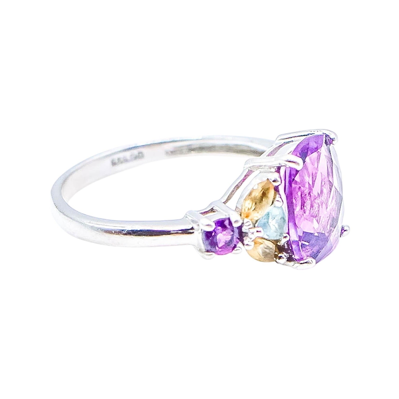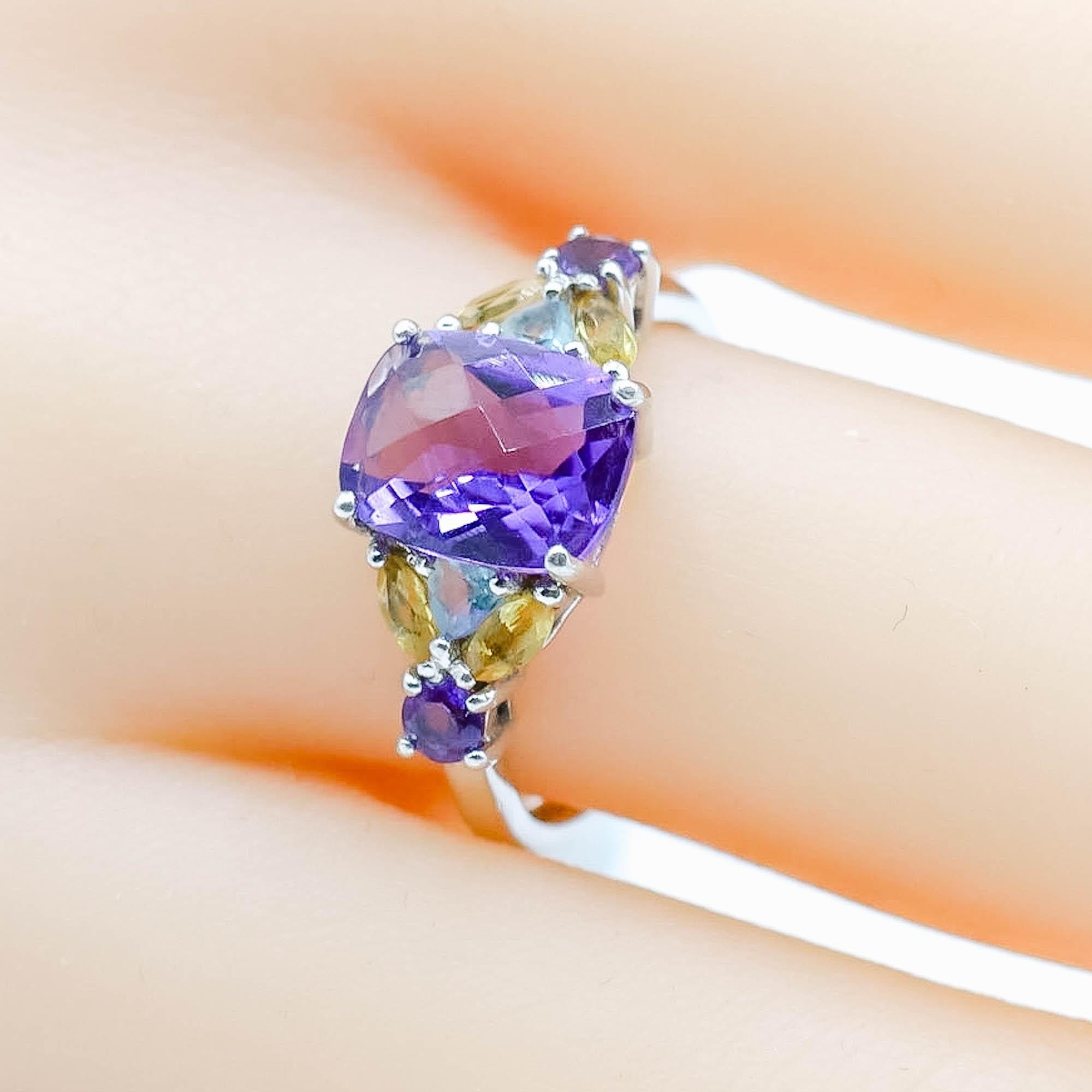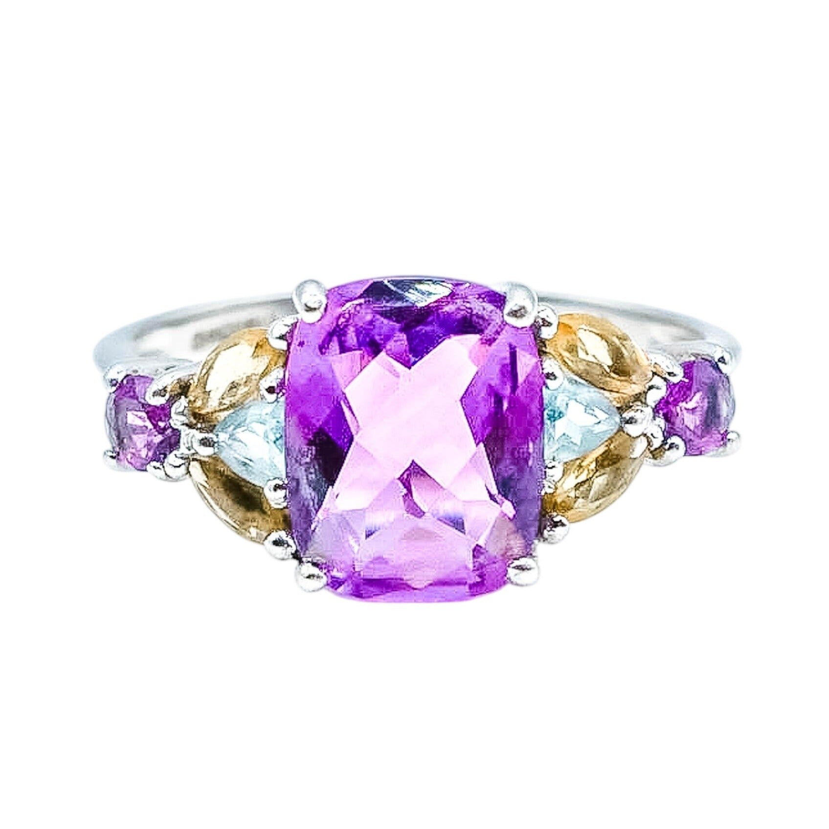 This pre-owned sterling silver gemstone ring features a stunning checkerboard faceted cushion-cut Amethyst at center, flanked by trillion-cut Swiss Blue Topaz, marquise-cut golden Citrines, and brilliant-cut Amethyst accents on each side. The rhodium-plated finish enhances shine and resists tarnish.