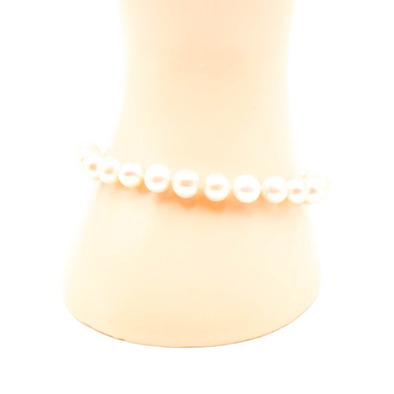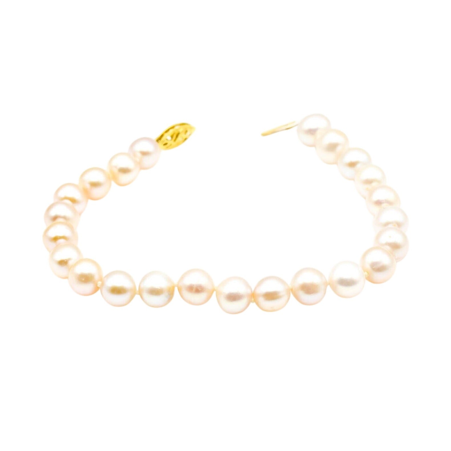 This elegant Japanese Akoya pearl bracelet features 23 natural white pearls with a soft ivory-pink overtone and beautiful, luminous luster. Finished with a classic 14K yellow gold fishhook clasp, this bracelet offers timeless sophistication and refined charm.
